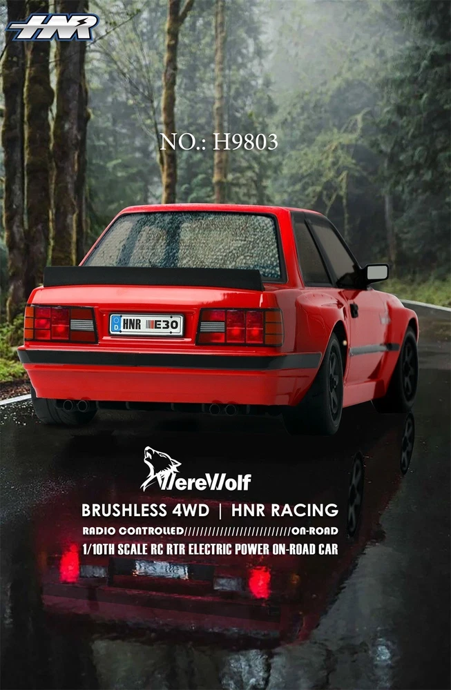 HNR Werewolf 1/10 2.4G 4WD Brushless RC Drift Car Touring On-Road Flat Running Electric Remote Control Racing Car Model Toy Product Overview: Unleash your inner racer with the HNR Werewolf 1/10 Scale 4WD Brushless RC Drift Car! Designed for thrilling speed and precision control, this RC car delivers a top-tier racing experience. With a sleek red and black design, it's not just about performance—it's a visual stunner on the track. Specifications: Basic Information: Brand: HNR Model: H9803 Werewolf Scale: 1/10 Color: Red and Black Performance: Design Speed: Up to 85km/h on 3S, 75km/h on 2S Power System: ESC: Hobbywing 60A WP-10BL60-RTR Brushless ESC Motor: Hobbywing 3652 3300KV Brushless Motor Servo: 15kg Digital Metal Gear Steering Servo Transmitter: Frequency: 2.4G Channel: 4CH Remote Distance: 150m+ Battery Required: 4x 1.5V AA (not included) Battery Recommendations: Battery Type: 2-3S LiPo (not included) Example: 7.4V 3500mAh LiPo Build & Dimensions: Material: Plastic, Hardware, Rubber Car Weight: Approx. 1740g (without battery) Gear Ratio: 5.5:1 Body Shell: 1.2mm PC Soft Car Size: 440mm x 200mm x 150mm Wheelbase: 260mm Ground Clearance: 10-20mm Wheel Dimensions: 65mm x 25mm (Front), 65mm x 30mm (Rear) Battery Tray Size: <145mm x 50mm x 25mm (LxWxH) Box Size: 595mm x 260mm x 175mm Key Features: High-Performance Power: Equipped with a Hobbywing 60A brushless ESC and a 3652 3300KV brushless motor, compatible with 2S-3S LiPo batteries for powerful performance. Superior Handling: Features a DVC (Gyroscope) light control receiver for enhanced stability and control during high-speed operation. Durable Design: Metal gear differentials, alloy central drive shaft, and oil shock absorber suspension system ensure durability and smooth handling. Versatile Tires: Comes with high-grip racing tires and additional drift tires, allowing you to switch between racing and drifting modes effortlessly. Advanced Electronics: Fully waterproof ESC and servo, capable of handling various weather conditions with ease. Innovative Chassis: Widened and screwless design offers better dust protection and stability, with an aerodynamic rear bumper for improved performance. Stylish & Functional Body: The retro-styled bodyshell features a simulated intake grill and multi-functional LED lights for a striking appearance. Package Includes: 1x HNR Werewolf RC Car (Battery and charger not included) 1x 2.4G Remote Controller 1x Instruction Manual Experience the perfect blend of speed, control, and style with the HNR Werewolf RC Drift Car. Whether you're racing on the track or mastering drifts, this car is engineered to thrill. Don't miss out—add it to your collection today!