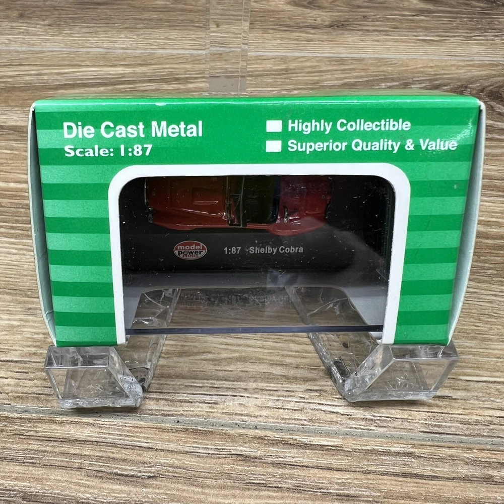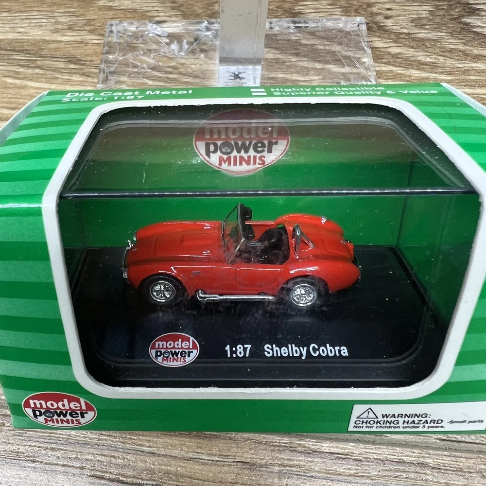 The product is a HO scale Model Power Minis Shelby Cobra diecast toy car in red color. The vehicle make is Shelby, and the model is specifically a Shelby Cobra. It is a contemporary manufacture collectible item that comes new in its original packaging box. The scale of 1:87 indicates that the model is smaller than the actual size of a Shelby Cobra, making it suitable for collectors or enthusiasts of diecast toy vehicles.