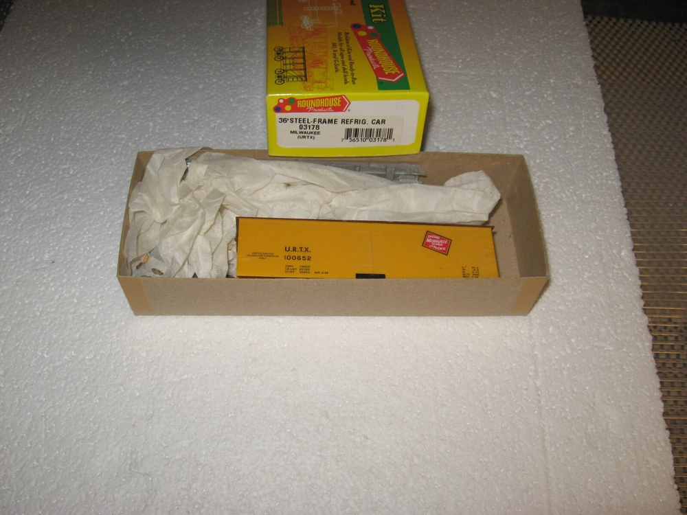 HOWDY FOLKS! THIS IS THE HO SCALE ROUNDHOUSE 36' MILWAUKEE [U.R.T.X.]STEEL-FRAME REEFER KIT! NUMBER ON ORIGINAL BOX 03176,REEFER NUMBER IS 100652.THIS KIT IS COMPLETE CHECKED BEFORE LISTING AND BEFORE SHIPPING WITH INSTRUCTIONS.PLEASE CHECK ALL PICTURES AND ZOOM RIGHT IN THERE! ONLY $ 12.00 AND YOU CAN BUY IT NOW IF YOU WISH TOO. ADD IT TO YOUR COLLECTION OR LAYOUT. WE COMBINE SHIPPING ON ALL OUR ITEMS. IF YOU NEED ANYTHING PLEASE DON,T HESITATE AND ASK! JUST USE THE CONTACT SELLER ON TOP OF THE LISTING ON EBAY EMAIL. THANK YOU AND TAKE GREAT CARE NOW!