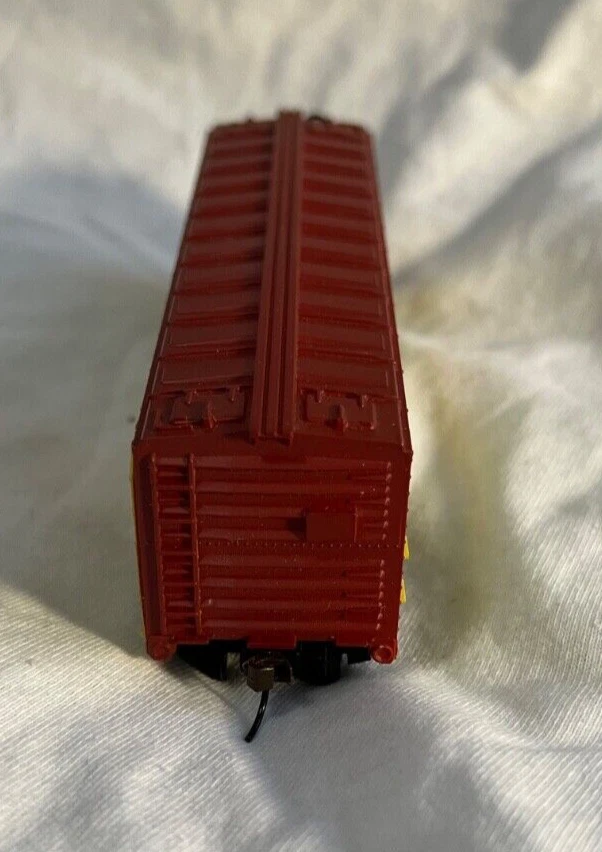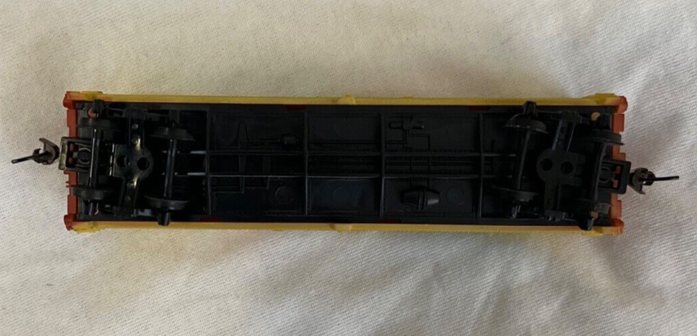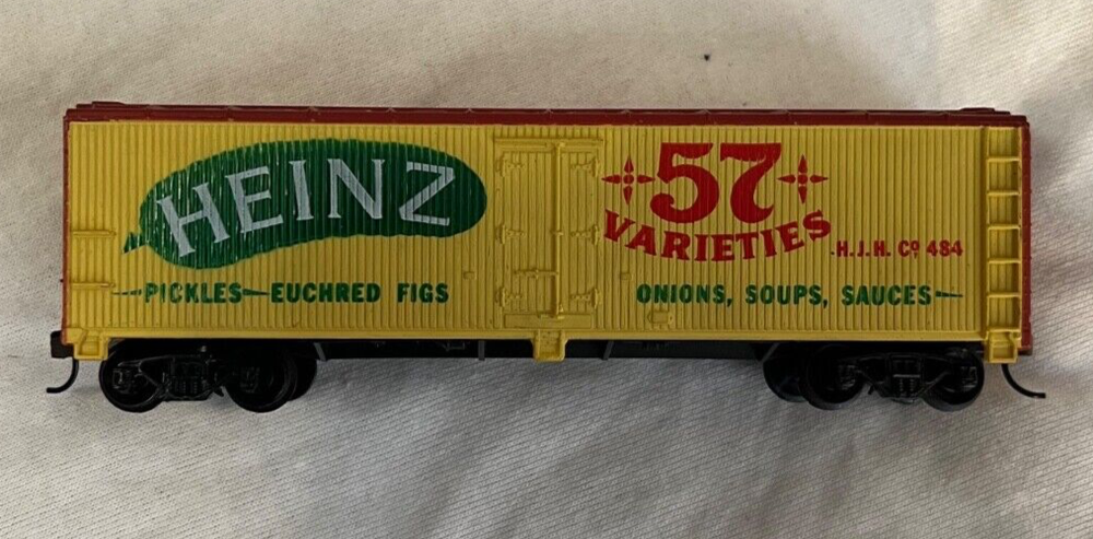 This Tyco HO Scale 40' Heinz 57 Pickle Refrigerator Box Car #484 is a vintage model train accessory that is ready to go. Featuring a bright yellow color and made of plastic with metal parts, this pre-built car is a replica of a refrigerator car from 1975. With its advertising specimen features and corporate roadname of Heinz, this collectible piece is perfect for model train enthusiasts of all ages. Manufactured by TYCO in Hong Kong, this H0 scale car is a great addition to any HO gauge railroad layout. Finish is in great condition with detail features such as stirrup steps and brake wheel intact. A little dirty, so it could use a little cleaning or weathering. No box. Smoke and pet free home Shipping to the lower 48 states only, unfortunately Alaska and Hawaii not included.