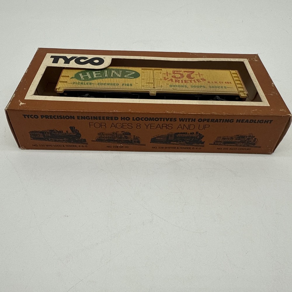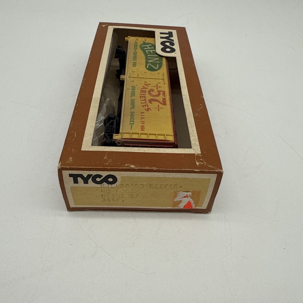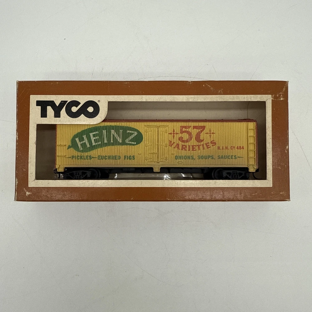 The Tyco HO Scale Train Car featuring Heinz 57 Varieties is a vibrant yellow box car designed for model railroads and trains. Made by TYCO, this HO gauge car is sure to add a nostalgic touch to any train layout with its iconic branding and classic design. Perfect for collectors or hobbyists looking to expand their collection, this train car comes with its original box for easy storage and display. Ideal for both play and display, this Tyco train car is a must-have for any enthusiast of model railroads and trains.
