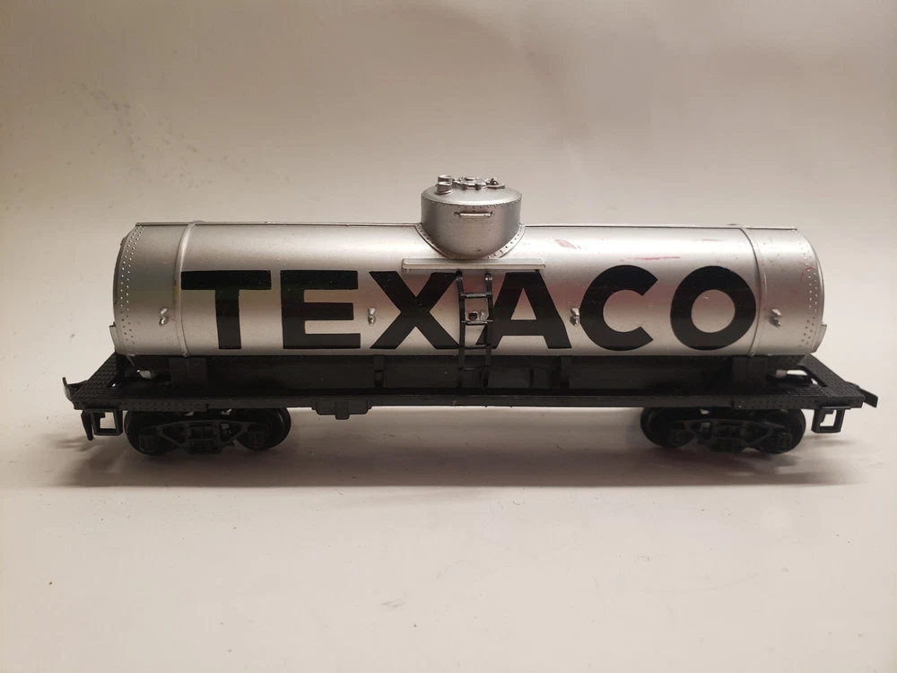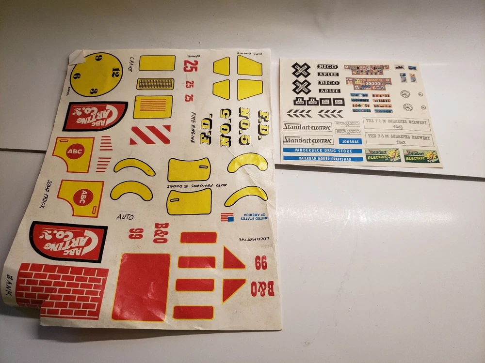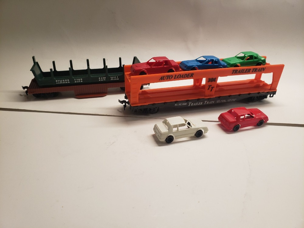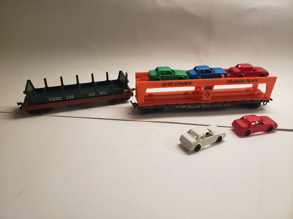 Comes with everything in the photos. The Railroad station and accessories, 4 train cars (Texaco, Cabose, Car Hauler, Log Hauler) The instructions, stickers, misc. pieces, and 5 automobiles ( some have missing wheels.) There is some wear on all the pieces.