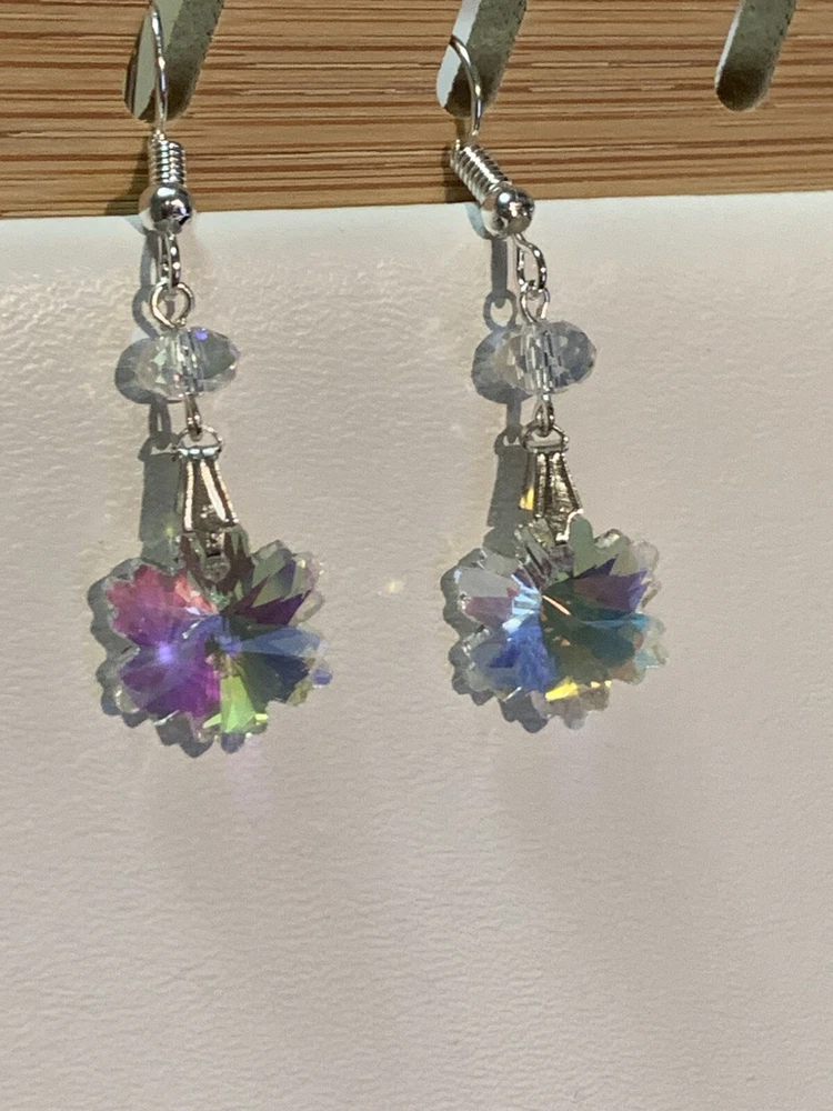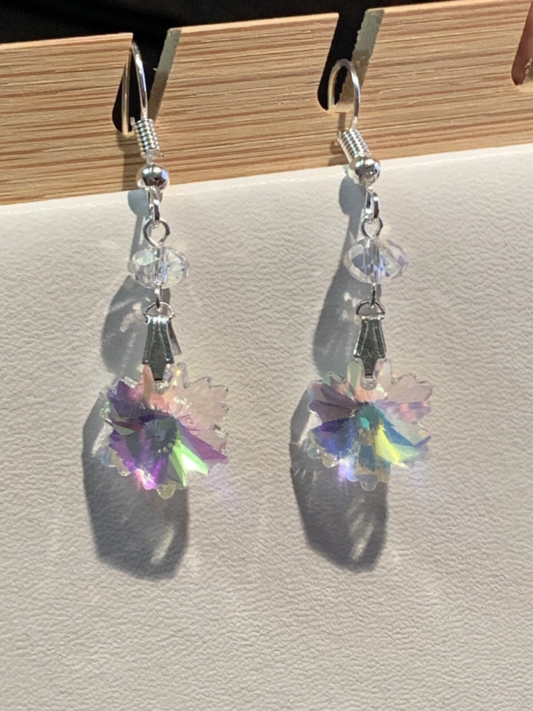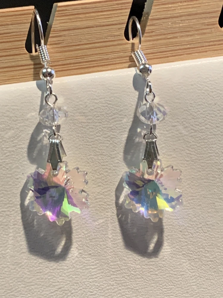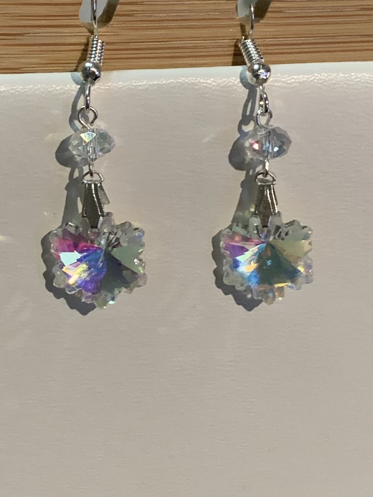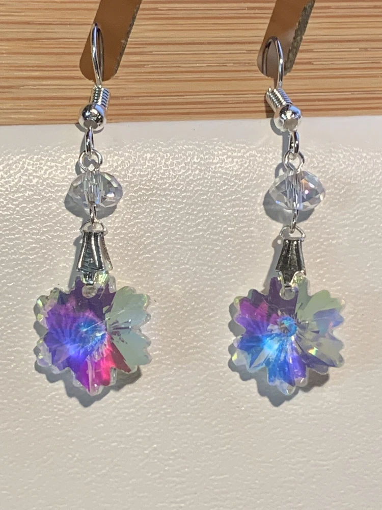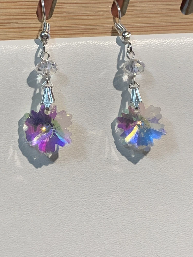 **STUNNING NEW HOLIDAY GIFT IDEA** These exquisite, handcrafted earrings feature a sparkling, 14mm faceted Austrian crystal snowflakes that have a stunning aurora borealis finish. The aurora finish gives the crystal an everchanging color show as the light plays off its facets. Hues of light blue, rose, pale green, violet and amber can be easily seen, making these very versatile jewelry accessories that will go beautifully with any color outfit. The snowflake earring drops are embellished with a matching 6mm faceted crystal rondelle bead with the same aurora borealis finish. The earrings measure 1 3/4" in length and are mounted silver French hook ear wires . ***SHIPPING COST INCLUDES USPS DOMESTIC GROUND ADVANTAGE WITH TRACKING, INSURANCE, AND DELIVERY CONFIRMATION**** *** SHIPPING FEES ARE NOT REFUNDABLE**AND RETURN SHIPPING IS TO BE PAID BY BUYER**