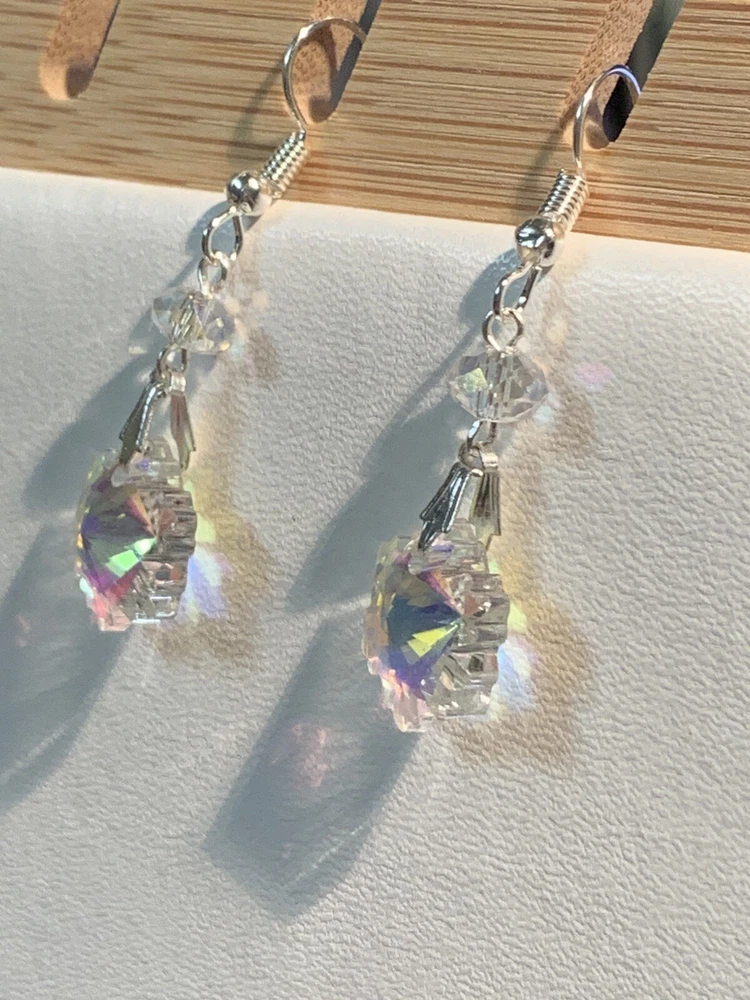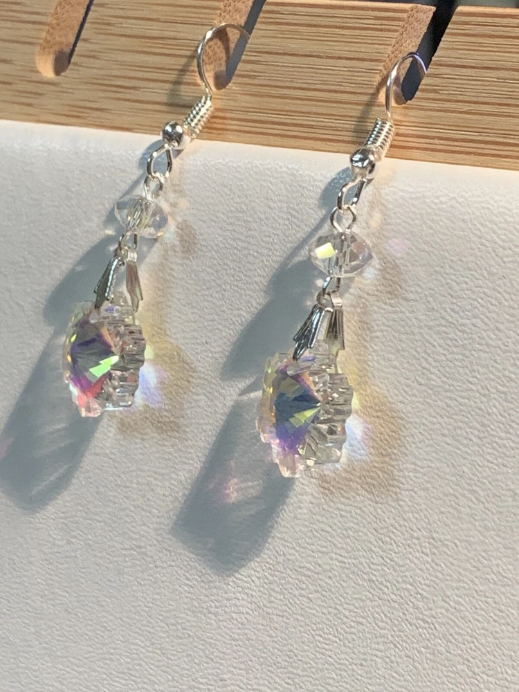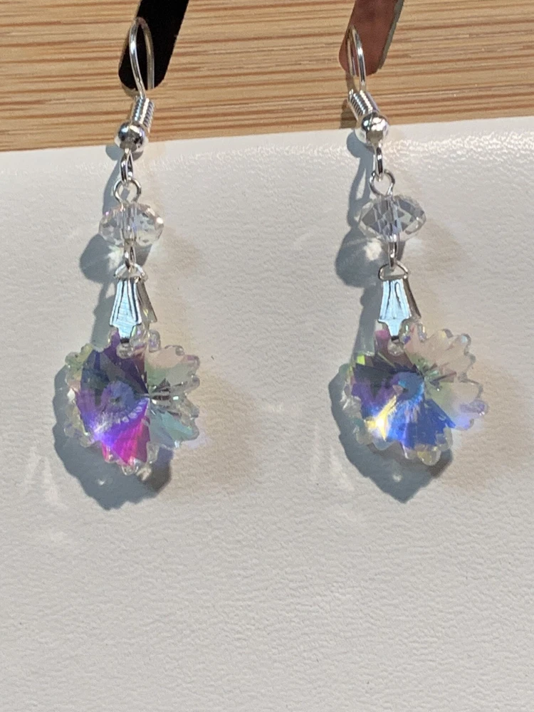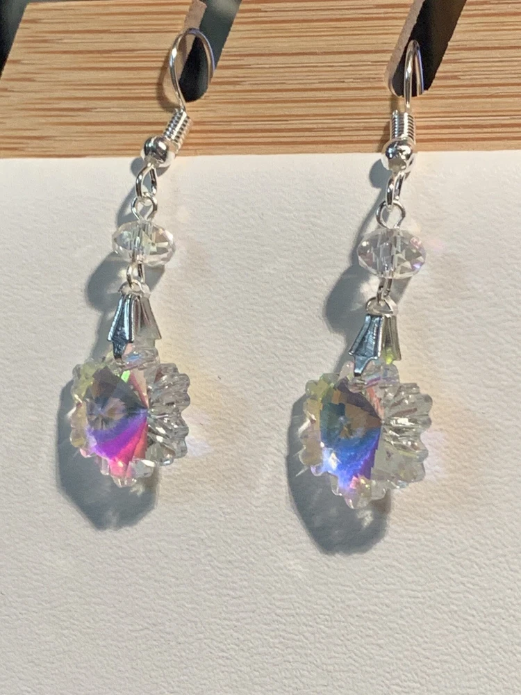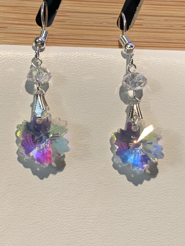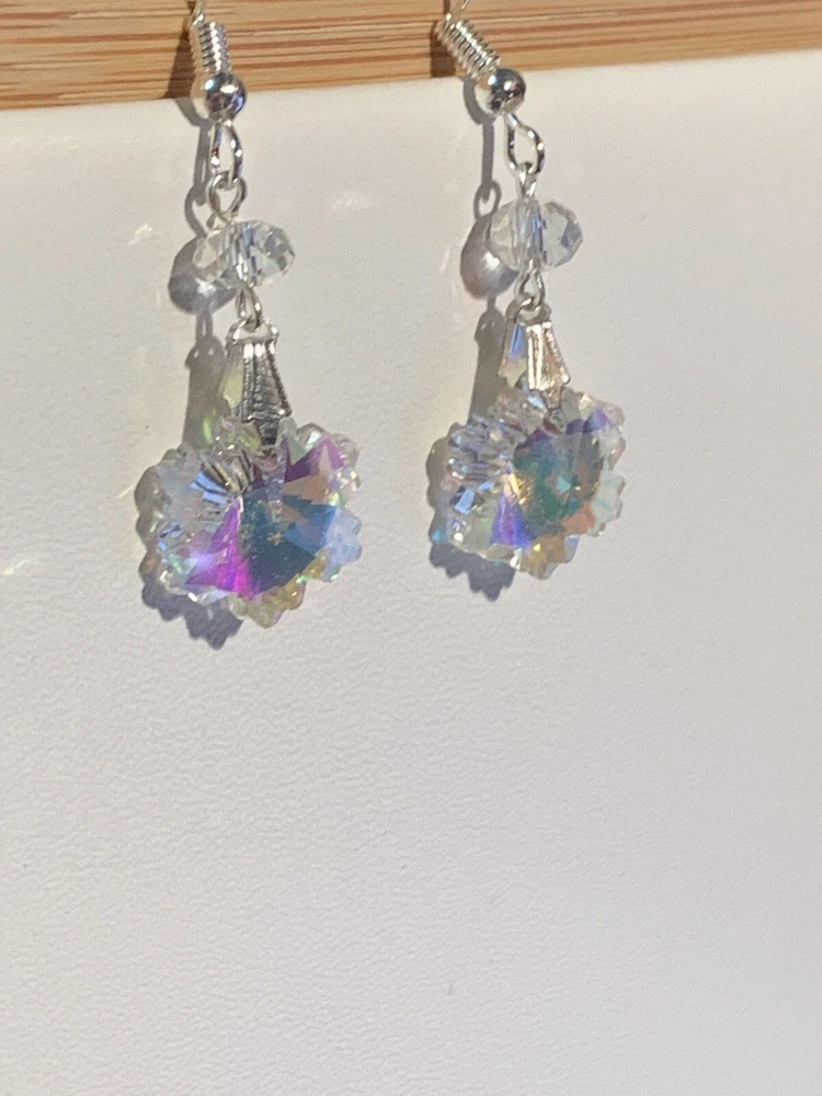 **STUNNING NEW HOLIDAY GIFT IDEA** These exquisite, handcrafted earrings feature a sparkling, 14mm faceted Austrian crystal snowflakes that have a stunning aurora borealis finish. The aurora finish gives the crystal an everchanging color show as the light plays off its facets. Hues of light blue, rose, pale green, violet and amber can be easily seen, making these very versatile jewelry accessories that will go beautifully with any color outfit. The snowflake earring drops are embellished with a matching 6mm faceted crystal rondelle bead with the same aurora borealis finish. The earrings measure 1 3/4" in length and are mounted silver French hook ear wires . ***SHIPPING COST INCLUDES USPS DOMESTIC GROUND ADVANTAGE WITH TRACKING, INSURANCE, AND DELIVERY CONFIRMATION**** *** SHIPPING FEES ARE NOT REFUNDABLE**AND RETURN SHIPPING IS TO BE PAID BY BUYER**
