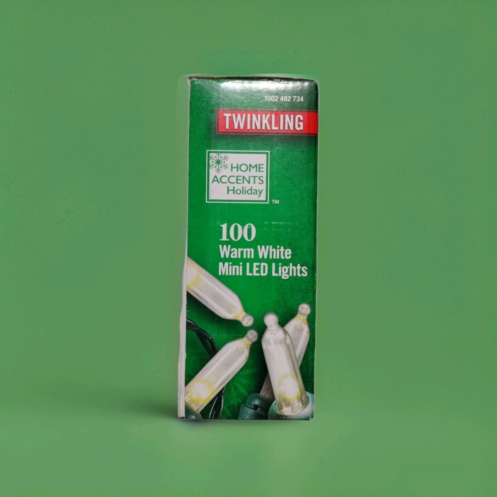 The HOME ACCENTS HOLIDAY 1002 482 734 100CT WARM WHITE MINI LED TWINKLING 28' string lights are perfect for adding a festive touch to your holiday decor. With 100 warm white mini LED lights featuring a twinkling design, these traditional style string lights are safe for both indoor and outdoor use. Easy to set up with a plug control style, these lights offer a warm white color temperature and are designed with a crystal pattern. The electric-powered lights are made of plastic and have a green cord, making them a versatile and charming addition to your holiday celebrations.
