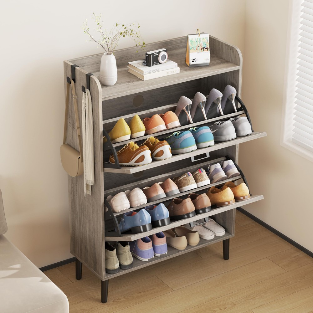 Hidden Shoe Cabinet for Entryway: This cabinet-style shoe storage helps keep the entrance free from clutter. With two flip doors and two open storage shelves, this modern shoe cabinet provides ample space for shoes to eliminate the chaos around your home. It can accommodate most types of shoes, including boots, high heels, and sneakers. It is ideal for placing in the front door entrance, foyer, hallway, or living room. The racks can be closed to keep the shoe mess under control. Space-Saving and Freestanding Shoe Cabinet Storage: Due to its slim design, this shoe dresser takes up minimal space and can fit against a small wall in the corner of your room. The narrow dimension of 30" Wx9.45"Dx43.3" H allows shoes to be stored inconspicuously without protruding into the walkway. Item weight:17.80kg/39.16 lbs. Flip Drawer Shoe Cabinet Organizer with Large Capacity: This shoe dresser is made of 15mm thick particleboard and comes with solid wood legs, ensuring a stable structure that can withstand daily use for years to come. The flip drawer contains two layers of storage racks, and each layer can fit about 4-5 pairs of shoes. The inside panel is removable and can be adjusted to two positions to accommodate various types of footwear, including high heels and boots. Farmhouse-style and Spacious Countertop Shelf: The clean lines and sleek profile give it a retro and stylish appearance and instantly enhance the visual appeal of the hallway or front door. It is an attractive shoe armoire and goes well with a farmhouse-themed home. The cabinet comes with an anti-tipping device for wall mounting to ensure safety. The spacious countertop shelf provides ample space for storing books, keys, photo albums, and other decorative items. Easy and Quick to Assemble: With clearly labeled assembly parts and well-illustrated instructions, this Farmhouse Shoe Rack Cabinet is easy and quick to assemble.