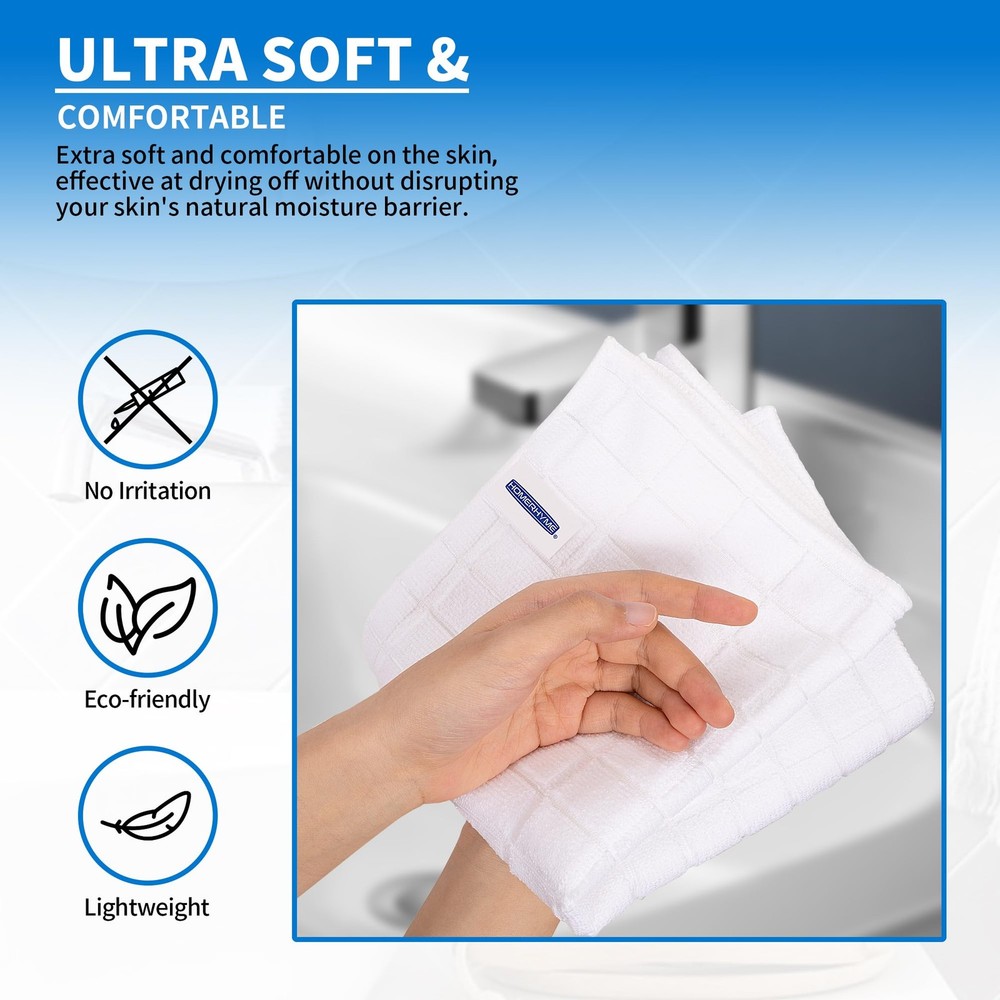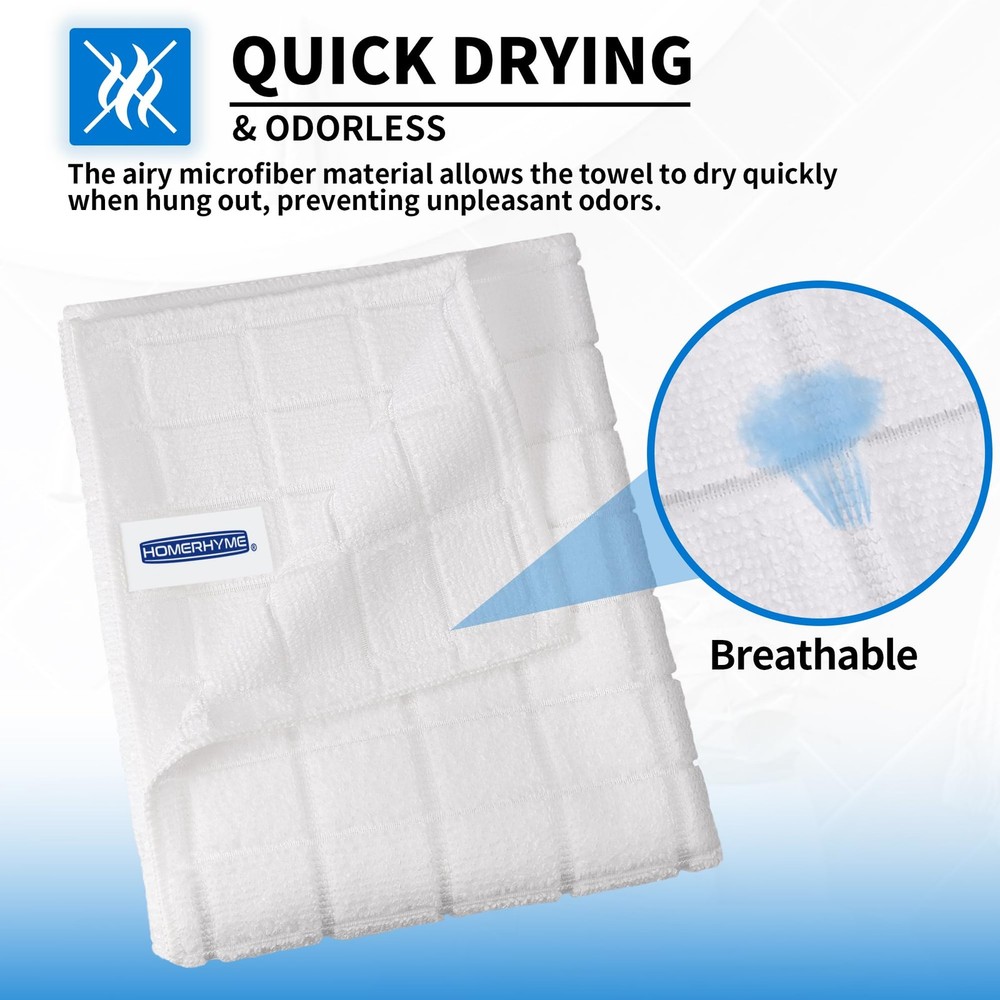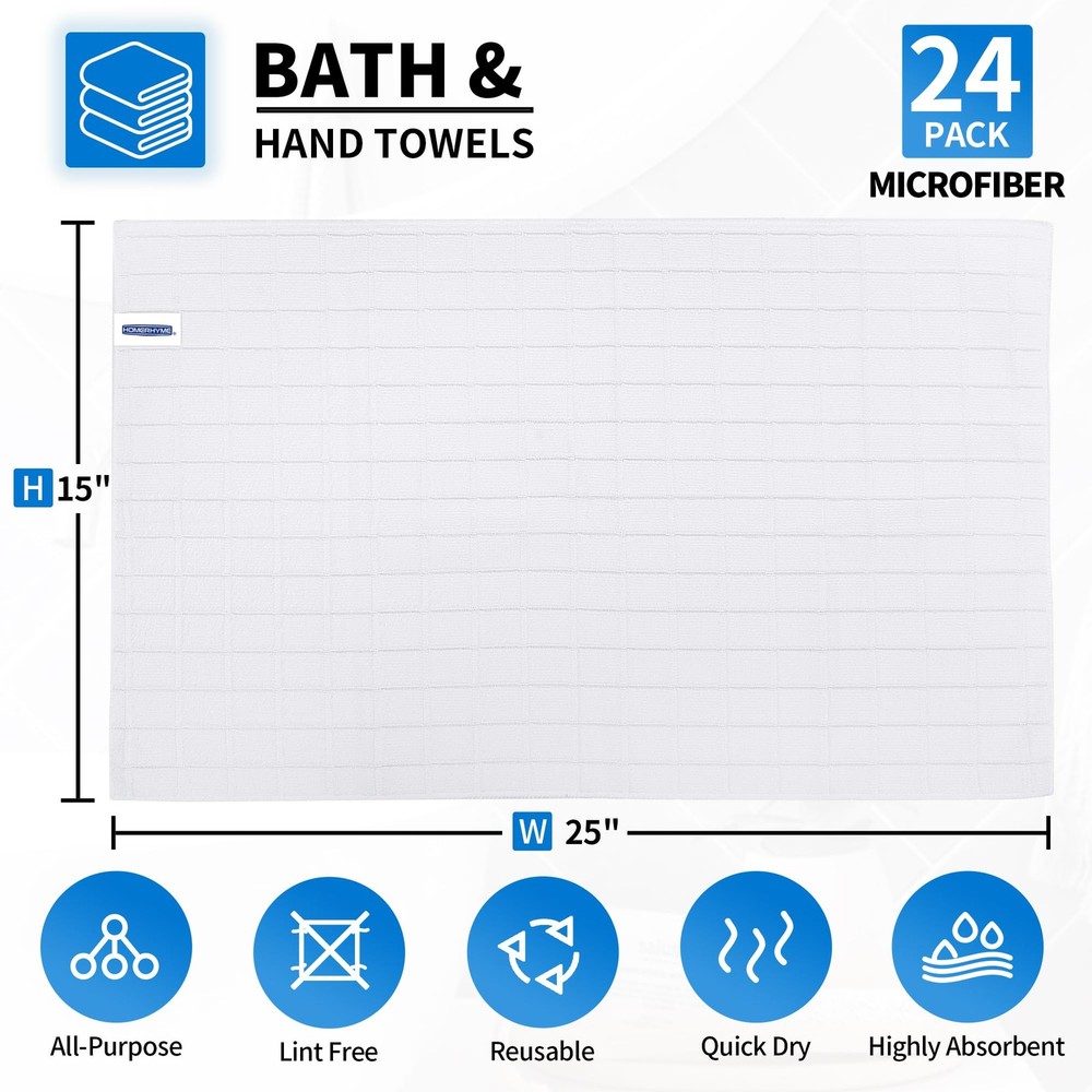 HOMERHYME White Hand Towels, 24 Pack 25*15 Inches Microfiber Bathroom Washcloths Checkered Travel Towels, All-Purpose Quick Dry Lint Free Soft Absorbent Bulk Fingertip Towels for Hotel Guest Gym ULTRA SOFT & SKIN FRIENDLY: High capacity, economical 24 Pack, Size 25" x 15", these white hand towels allow plenty of space to dry off fast and easily and won't leave any lint behind. Each hand towel feels luxuriously soft. Gentle on the skin without causing any discomfort, these hand towels for bathroom are hygienic and effective at drying off while not disrupting your skin's natural moisture barrier. STRONG ABSORBENCY & QUICK DRYING: Made of quality microfiber that offers super absorbency, these bulk washcloths can remove moisture from your hands and dry your face with ease. Able to absorb 10 times their weight while maintaining lightweight and fluffiness, these bathroom hand towels are easy to wash and quick to dry. The breathable microfiber material allows the towel to dry quickly when hung out, preventing unpleasant odors. FUNCTIONAL & DECORATIVE: These practical hand towels can be used as decorative pieces to enhance your home's style. Helpful in the kitchen and ideal for drying hands after rinsing or washing dishes or before and after meals. Lightweight and versatile for use in bathrooms, hotels, gyms, beaches, spas, guest room, and travel and even for use by college students. Giftable and thoughtful presents for holidays, weddings, and housewarming. STURDY & REUSABLE: These microfiber towels are machine washable and long-lasting. The reinforced edges and microfiber fabric provide extreme durability and help prevent towels from wrinkling, unraveling, or shrinking. Firm enough to withstand 500 times Machine Wash Cycle under normal conditions without losing their shape or effectiveness. MULTI-PURPOSE HAND TOWELS: These handy and quick-drying hand towels can serve a variety of purposes besides drying off hands. They can be used as facial towels or washcloths | table napkins | kitchen hand towels | fingertip towels | beach towels | salon towels or spa towels | bath towels | gym towels | sports towels. Or simply keep these white towels in the bathroom as guest towels | hotel towels to elevate the style of the room.
