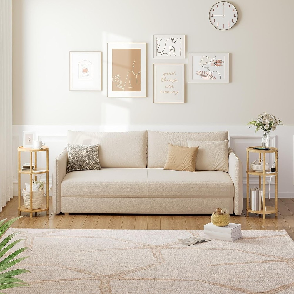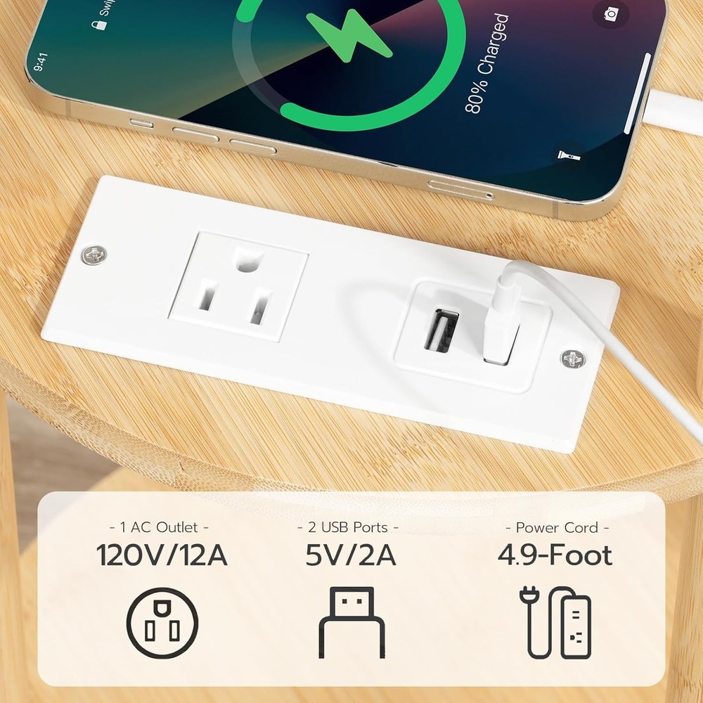 HOOBRO Small Round Side Table with Charging Station, 3-Tier Natural Product Details Brand: HOOBRO Product Dimensions: 11.8"D x 11.8"W x 25.6"H Maximum Weight Recommendation: 44 Pounds Color: Natural Product Care Instructions: Wipe with Dry Cloth Item WeightFrame Material: 5.7 PoundsBamboo Top Material TypeShape: BambooRound Handy Charging Station: The side table features 1 AC outlet and 2 USB ports with a 4.9-foot-long power cord for you to conveniently charge devices like phones, headphones, and lamps by your bed or couch, offering both convenience and flexibility Bamboo Material: Made of pure natural bamboo, the round end table is stable with a waterproof surface that's easy to clean. It has a good load-bearing capacity(max. static load capacity: 44 lb) with anti-slip pads underneath Versatile Roles: Sized in 11.8"Φ x 25.6"H, the compact and lightweight build makes the small round side table easy to move around and ideal for a bedside table, a living room sofa side table, a coffee table, or a handy snack station. The added guard prevents accidental falls, keeping your items safe Stylish Design: The round bamboo side table comes in natural hues, brings a warm, rustic charm to your home. It's not just a feast for the eyes but also a practical addition to your space, enhancing your daily living with a taste of high-quality comfort Easy Assembly: With a unique twist-and-lock structure and detailed illustrated instructions, the end table is quick to set up with no extra tools needed. Give it a twist and you'll have the bamboo table that's both beautiful and practical