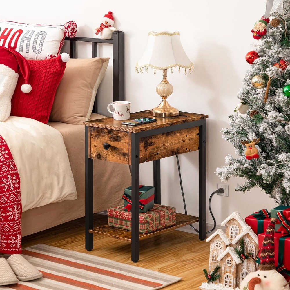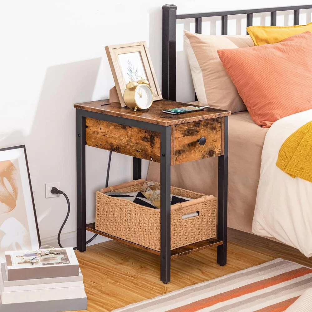 HOOBRO Rustic Brown and Black Narrow End Table with USB Charging Station