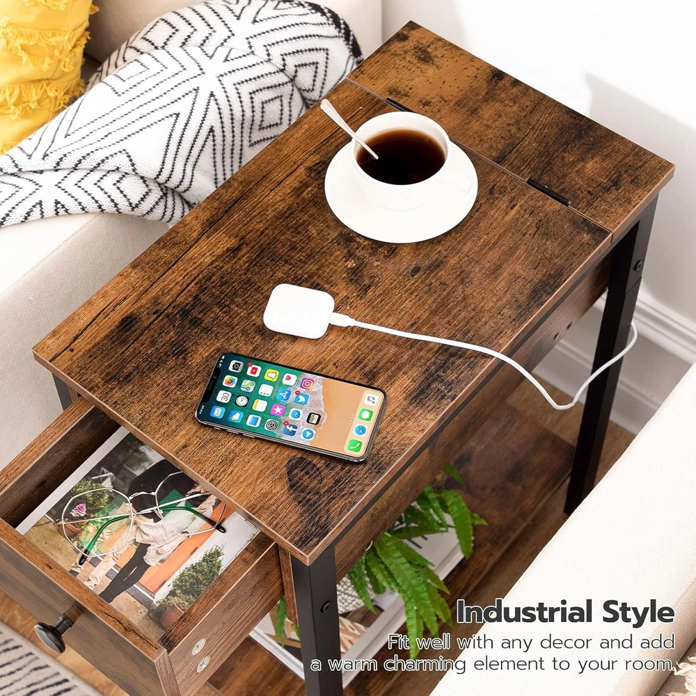 HomeHOOBRO Rustic Brown and Black Narrow End Table with USB Charging Station