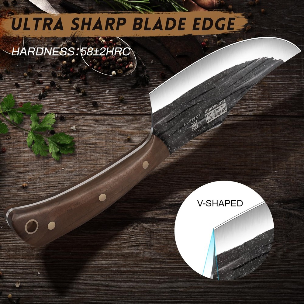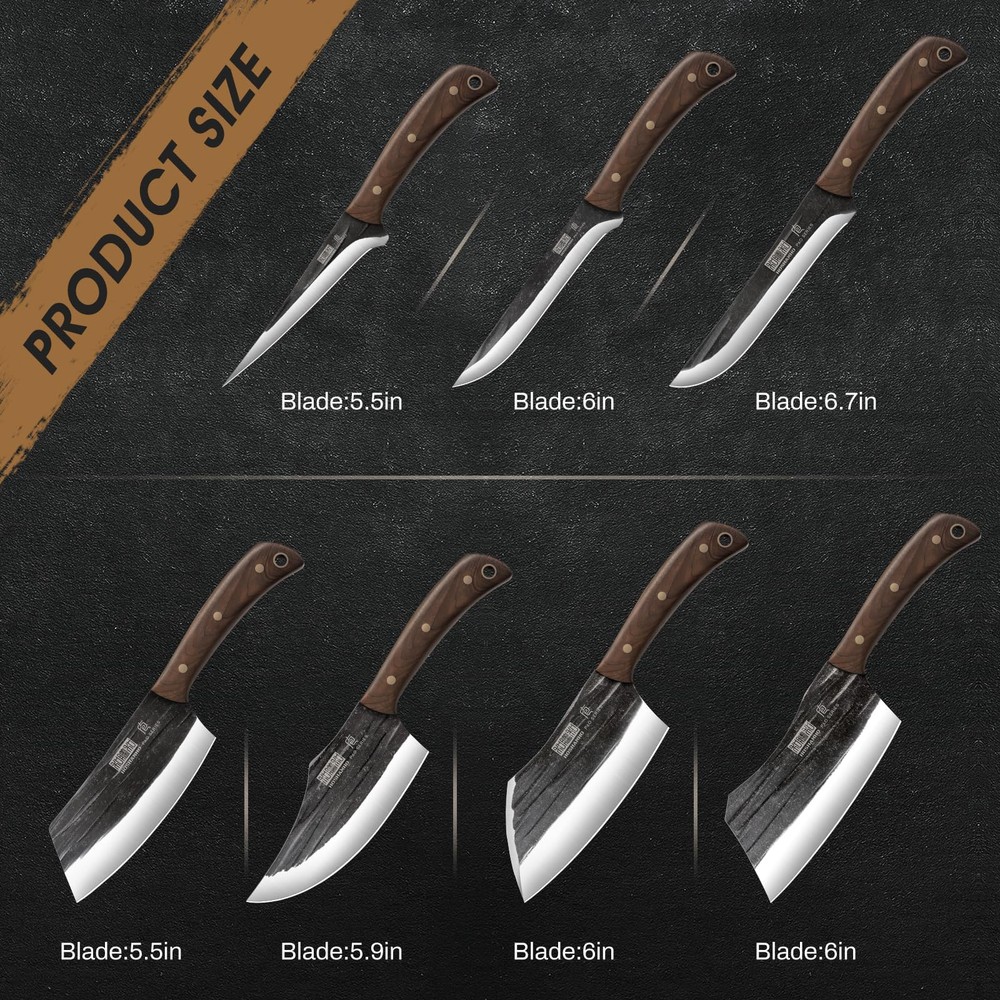 【Versatile Tasks Butcher Knife Set】Butcher knife set include: 6" bone chopper knife,6" meat cleaver knife, 5.9" viking knife, 5.5" cleaver knife, 6" fillet knife, 6" dividing knife, 5" paring knife and knife bag. Suitable to handle a variety of tasks such as slicing, chopping, dicing, mincing and cutting tough vegetables, meats, bone, fish, they suitable for BBQ, hiking and camping. 【High-end Stainless Steel】Each knife of this kitchen knife set is constructed from premium high carbon stainless steel, blade is forged using a stonewashed and hammer finish treatment, 58+2 high hardness, wear-resistant, and non-sticking. High quality material which makes its blade more solid and sharper for precise and efficient cutting and gives you a better usage experience. 【Masterful Forged Craftsmanship】Razor-sharp and powerful are the characteristics of the butcher knife.bringing the edge to a razor-sharp 16° degrees per side V-shaped cutting edge to achieve the best balance of hardness, durability, rust resistance and sharpness, maximum cutting performance. 【Ergonomic Comfortable Wood Handle】Butcher chef knives with ergonomic walnut wood handle which is well-balance and durable, full tang design with three rivets and a seamless transition from blade to handle retain the utmost comfort and safe, ensures optimal stability and balance that helps reduce hand fatigue. 【Portable Kitchen Knife Set】All knives can be neatly organized in a durable and portable bag, making them easy to carry for outdoor camping, hiking, and cooking. HOSHANHO butcher knife set is an great gift choice for occasions such as thanksgiving, weddings, birthdays, christmas, halloween, housewarming, and anniversaries.