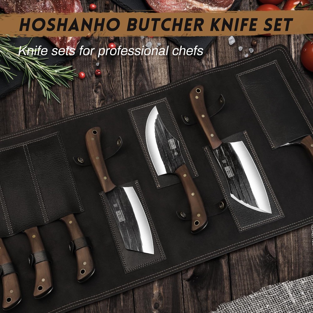 HOSHANHO Hand Forged Butcher Chef Knife Set with Roll Bag