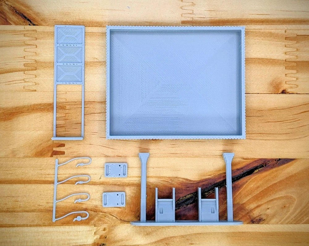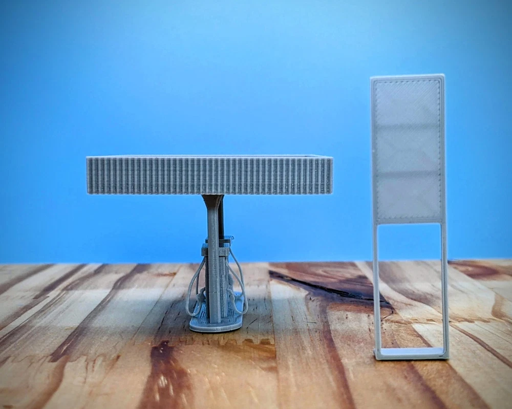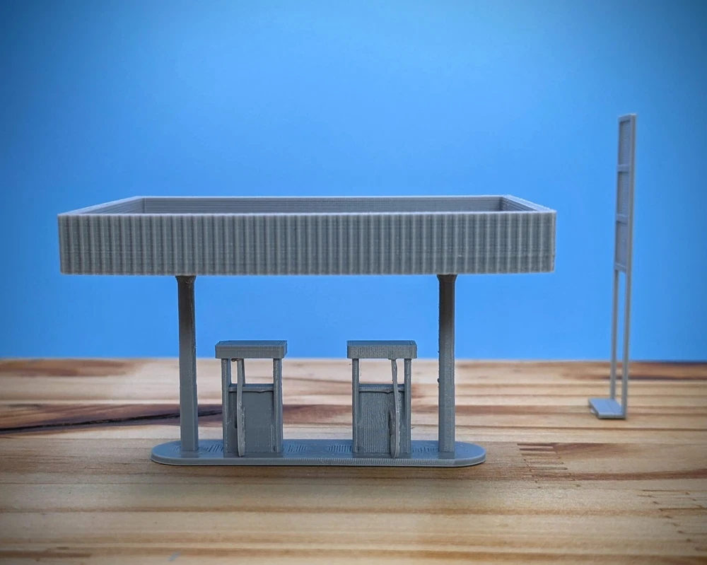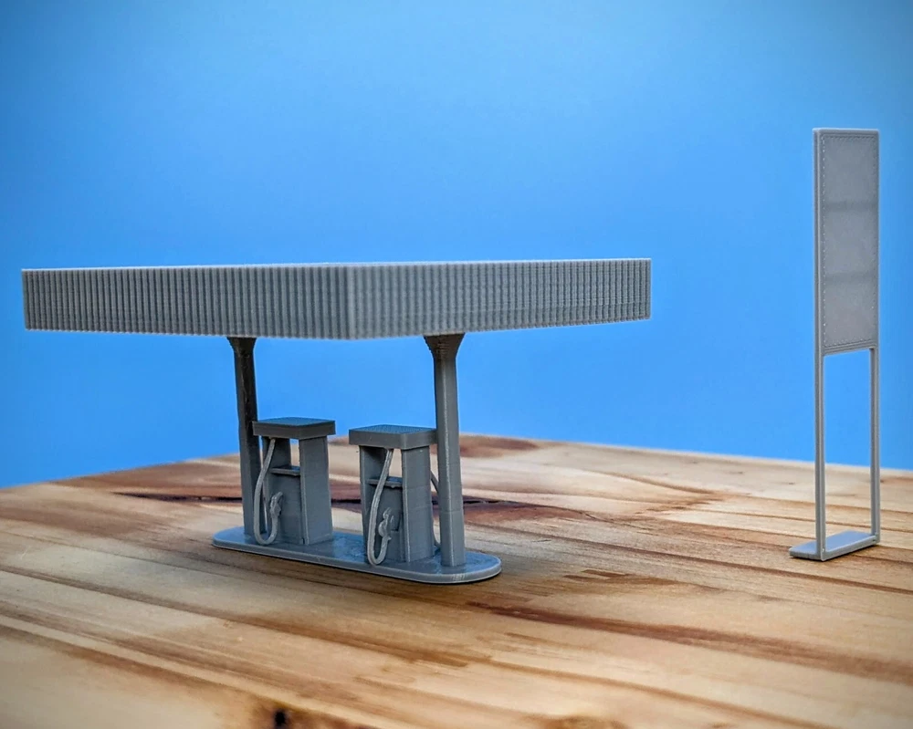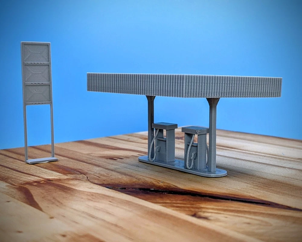 HO-Scale Gas Pumps High detail HO-Scale Gas Pumps! 1 to 5 pump set available Pictures and Measurements are for the 2 pump set Minimal assembly required Item in 6 pieces to make painting easier Model Footprint: 4.4" wide x 2.6" deep x 3.7" tall Recommended paint - Acrylic Recommended glue - Super Glue Gel Hole added in bottom plate for lighting 3D Printed in gray using high-quality PLA plastics Made in the USA Feel free to ask me any questions! Thank you!