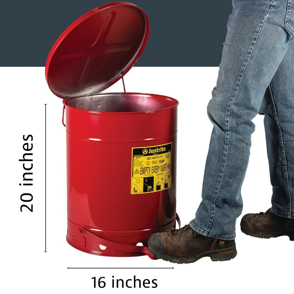 HOT JUSTRITE 14 Gallon, Oily Waste Can, Hands-Free, Self-Closing Cover, Red - 09500 Safe Storage - The Justrite oily rag safety can is a flammable rag container used for the temporary storage of shop rags and cloths soaked with oils, solvents, thinners, and other combustibles Made in America - Fashioned from galvanized steel with reinforcing ribs and a powder coat finish, our US-made oily waste safety can resists chemicals and fire and is built to last for years to come Smart Design - The oily rag waste can features a foot-operated self-closing cover that opens to no more than 60°, isolating its contents from fire and limiting oxygen to reduce the risk of combustion Elevated Base - The elevated base and specially designed air holes of the oily rag can allows the circulation of air around the can to disperse heat and reduce moisture build-up and rusting Encourages Compliance - Engineered as a flammable rag container, our cans are FM approved and OSHA compliant, making them superior in safety and compliance to a standard small trash can or garbage can Revolutionize your workspace with an American-made Justrite oily waste can, a necessity in workshop accessories and auto shop supplies. Engineered for superior safety and durability, our oily waste can is an essential fireproof storage upgrade for any workshop, auto shop, or laboratory. Unlike a traditional metal trash can, our oily waste can features a self-closing lid that remains securely shut when not in use. This innovative design isolates its contents from potential fire sources and dramatically limits oxygen availability, minimizing the risk of spontaneous combustion. The can's construction is robust, crafted from durable steel with a powder-coat finish for exceptional chemical resistance, far exceeding the capabilities of any other flammable storage can or fire safe trash can. Justrite oily waste cans are designed with an elevated base to promote air circulation around the can. This not only disperses heat but also minimizes moisture build-up and rusting. With a foot-operated pedal, the can offers hands-free opening, enhancing safety and convenience over a typical metal trash can with lid. Additionally, the swinging carry handle makes it effortlessly portable, essential for dynamic and varied work environments. With FM, UL/ULC and TUV approvals, and OSHA compliance, our oily waste can provides a reliable, safe, and efficient solution for disposing of flammable waste. Choose a Justrite oily waste can for a safer and more efficient workspace, and elevate the standard of safety in your workshop or auto shop today. Founded in 1906, Justrite is a leading manufacturer of storage, handling, and workplace safety products. Today, Justrite is a global leader in the design and manufacturing of products for the safe management of flammable liquids and hazardous materials. Shipping We offer FREE shipping on all orders! We ship within Three business days of payment, usually sooner. We use a selection of shipping services such as UPS, FedEx, USPS etc. We only ship to the lower 48 states, no APO/FPO addresses or PO Boxes allowed. Local pickups and combined shipping options are not provided at this time. Return You can return a product for up to 30 days from the date you purchased it. Any product you return must be in the same condition you received it and in the original packaging. Please keep the receipt. Payment We accept payment by any of the following methods: PayPal Please pay as soon as possible after winning an auction, as that will allow us to post your item to you sooner! Feedback Customer satisfaction is very important to us. If you have any problem with your order, please contact us and we will do our best to make you satisfied. Contact Us If you have any queries, please contact us via ebay. We usually respond within 24 hours on weekdays. Please visit our eBay store to check out other items for sale! Thank you for shopping at our store.