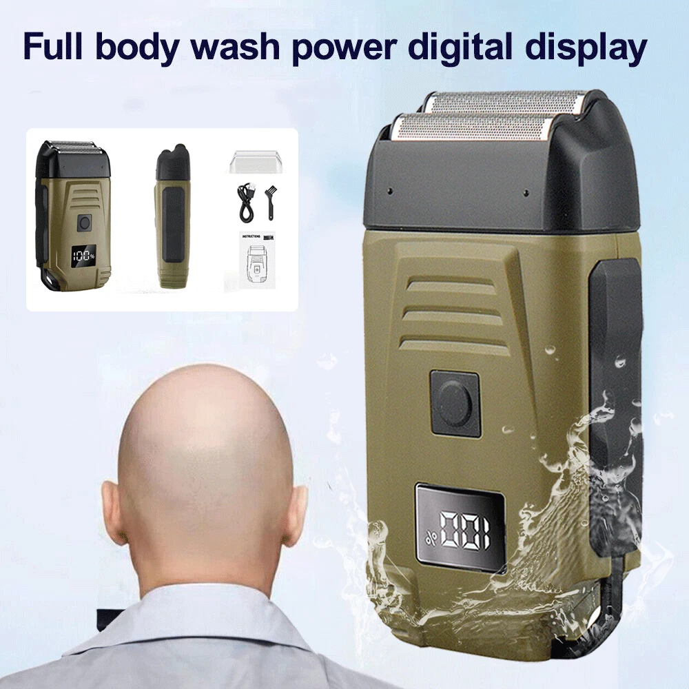 Specification Feature: Newly designed army green double-edged shaver, a machine to solve the problem of hair and beard, LCD display to check the battery at any time, IPX6 body waterproof performance, lightweight design and easy to carry. Work:Cord/cordless Type: USB Rechargeable Usage Time: 90 mins Charging Time: 2 hours Voltage: 100-240V,50/60Hz Material: ABS Weight : 250g Color : Army Green Machine Size : 4.96*2.76*1.4inch Package Size : 15.2*9.*4.5cm/6.1*3.7*1.7inch Package Included: 1* trimmer 1* Protective cover 1*charger 1* Cleaning brush 1* Manual NOTE: Due to transportation reasons, all our haircut products are not equipped with oil bottles, please understand the inconvenience
