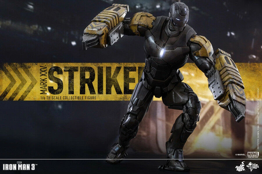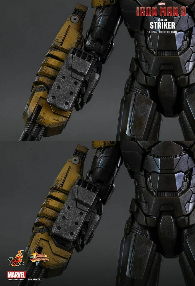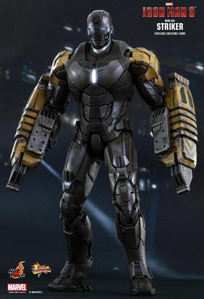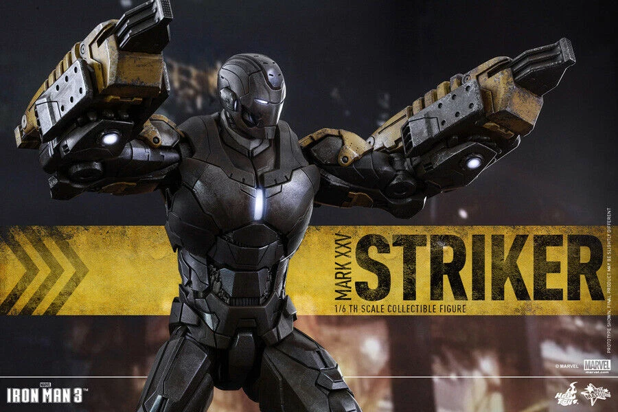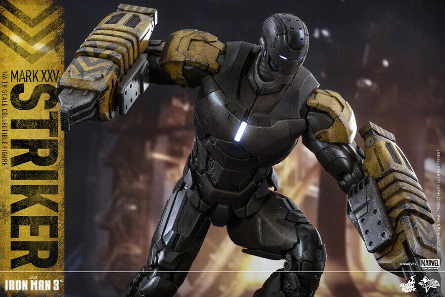 IRON MAN 3 MK25 STRIKER MARK XXV 1/6th scale Collectible Figures “It’s Christmas. Take them to church.” – Tony Stark. One of the suits Tony Stark has built in Iron Man 3 is the Striker (Mark XXV), the Heavy Construction Suit. This suit is designed for assisting in heavy construction with its distinctive Pneumatic Hammers. Although the hammers are not designed for combat, they still proved to be lethal when Striker assisted in eradicating the two Extremis soldiers who were trying to attack James Rhodes. Today Hot Toys is proud to present 1/6th scale Striker (Mark XXV) Collectible Figure featuring the suit’s distinctive design with the pair of Pneumatic Hammers, special paint application with distressed effects, LED light-up functions and figure stand. Expand your House Party Protocol and add this unique suit to your collection! Specifications Product Code // MMS277 Product Name // Striker (Mark XXV) Height // Approximately 34cm tall Points of Articulations // 30 Special Features // A pair of Pneumatic Hammers, special paint application with distressed effects, LED light-up functions and figure stand. Artists // Head Sculpted by . Head Painted by . Armor Painted by Lok Ho Head Art Directed by . Painting Art Directed by JC. Hong The 1/6th scale Striker (Mark XXV) Collectible Figure’s special features: - Authentic and detailed likeness of Striker (Mark XXV), the Heavy Construction Suit, in Iron Man 3 - Over 30 points of articulations - Approximately 34 cm tall - LED-lighted eyes and rectangular-shaped RT on chest (white light, battery operated) - Silver, gray, and yellow painting on armor with specially applied distressed effects - Special features on armor: - A pair of distinctive Pneumatic Hammers with LED light up function (white light, battery operated) - Articulated air flaps - Articulations on waist armor allowing flexible movement Accessory: - One (1) circular figure stage with flexible pillar **Prototype shown, final product may be slightly different **Product details could be subjected to change without further notice **Battery included for collectible figure. Button cells are required