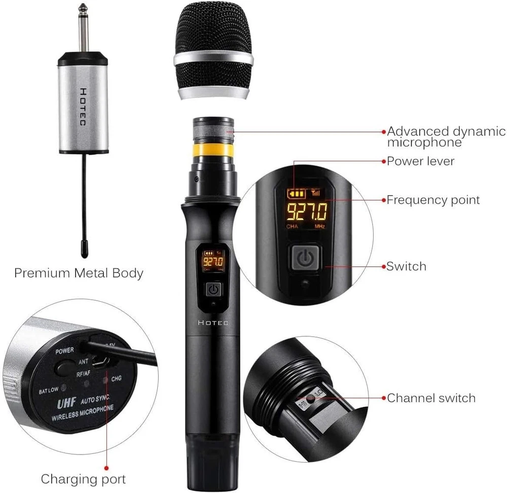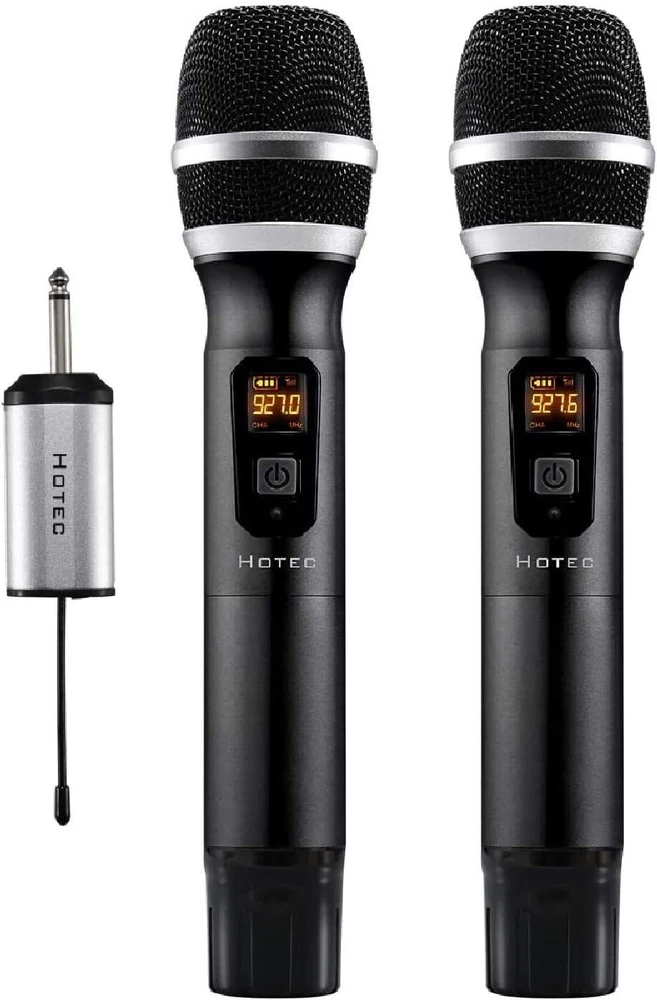 HOTEC Wireless Microphone, Metal Dual UHF Dynamic Handheld Microphone System for Karaoke, Singing, Speech (H-U26) FULL COMPATIBILITY: Connect the receiver to the 1/4” mic input of your sound device for voice amplifying. If your sound system is 3.5mm mic input, use the enclosed 3.5mm to 6.35mm adapter. Volume will be adjusted from the audio device end. SUPPORT RECORDING ON SMARTPHONES: This wireless microphone system comes with a 3.5mm adapter and the headphone splitter, you can connect this system with your iPhone or Android smartphones, tablet, laptops for recording on Facebook or Youtube. STAGE SOUND QUALITY: High quality sound transmission, clear voice and without feedback, free from distortion. This handheld wireless microphone is designed for vocal use in live performance, sound reinforcement, and studio recording. EASY SET UP: Plug and play. Battery-powered microphones (by 2 x AA battery) and wireless mini receiver (by rechargeable lithium battery) offers great freedom of movement on stage or in the room. You can have several sets working together. MULTI-USE APPLICATIONS: Perfect choice for karaoke party, DJ, wedding host, church, business meetings, classroom activities, outdoor or onstage performances or recording using iPhone/Android smartphones, tablets, laptops from Facebook, Youtube.
