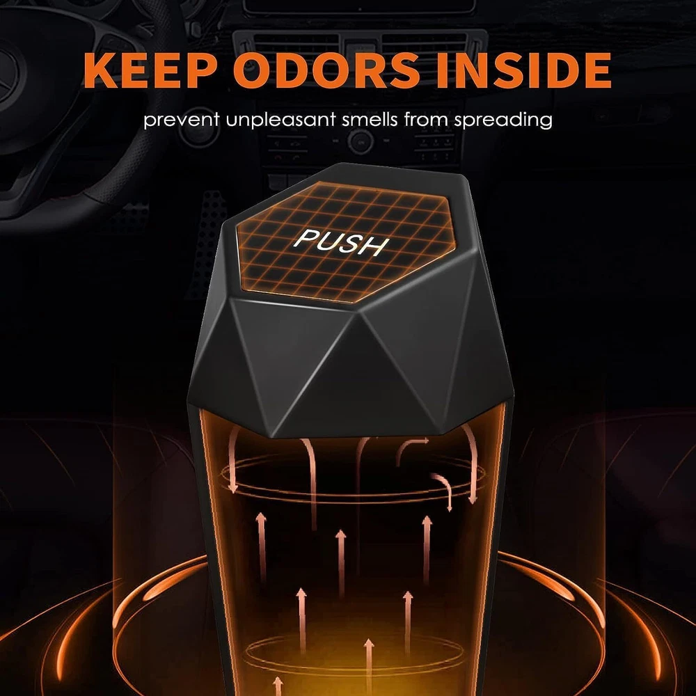 HOTOR Car Trash Can with Lid - 2 Pack, Mini Essential Accessories Black Product Details Brand: HOTOR Capacity: 1200 Milliliters Color: Black Opening Mechanism: Press-Top Material: Plastic Recommended Uses For Product: Vehicles Room Type: Office Special Feature: Waterproof,Portable,Compact Shape: Hexagonal Finish Type: Unfinished Item Weight: 9.59 ounces Product Dimensions: 8.1"L x 3.6"W x 3.6"H Unit Count: 2.0 Count Manufacturer: HOTOR Item Weight: 9.6 ounces Item model number: US11013 Manufacturer Part Number: US11013 Special Features: Waterproof,Portable,Compact Brand: HOTOR Capacity: 1200 Milliliters Color: Black Opening Mechanism: Press-Top Material: Plastic Recommended Uses For Product: Vehicles Room Type: Office Special Feature: Waterproof,Portable,Compact Shape: Hexagonal Finish Type: Unfinished WIDE APPLICATION: With a compact size of 8.1*3.6*3.6 inch, HOTOR car trash bins can be used in many areas of vehicles, such as cup holders, car door pockets, and seat back pockets. You can also set them on the desktop at home or office as a trash can or an organizer. EASY TO USE: With the flipping lids on HOTOR car storage organizers, you can easily put items or trash into them. Just push to open the lid and then it will close automatically. Moreover, the auto shut-off lid can effectively block odors, keeping the air fresh in the car. HOTOR car trash bins are one of the essential car gadgets for car owners. 30 ATTACHED TRASH BAGS: Each set of HOTOR trash cans for cars comes with 30 perfectly matching disposable trash bags. Even with a lot of waste, these durable bags are not easy to break. When the trash can is full, you can replace the used trash bag with a new bag in seconds. GREAT DECORATIONS: HOTOR car trash bins are made of premium ABS material that is durable and sturdy for long-term use. Although the HOTOR car trash can with cute in size, it can still show your exquisite taste with its unique diamond-shaped design. HOTOR car trash cans are the perfect decor for cars, homes, and offices. EASY TO CLEAN: Featuring waterproof material and a leakproof design, HOTOR car trash bins are suitable for wet waste. Besides, they are easy to clean with a smooth interior. When the trash can gets dirty, you can remove the lid, rinse the lid and body, and wipe them with dry towels.