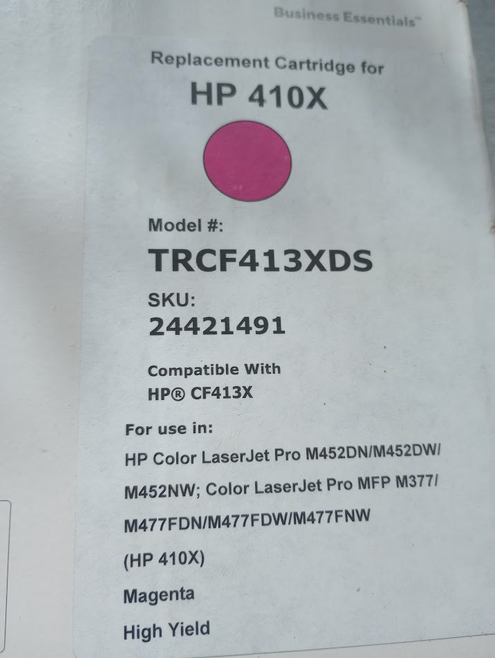 The HP 410X (CF413X) Magenta Toner Cartridge is a genuine original product by HP designed for use in laser printers. Specifically compatible with models M452 and M477, this toner cartridge produces high-quality prints in vibrant magenta color. As an authentic HP product, users can expect reliable and consistent printing results with each use. Ideal for professionals and high-volume printing environments, this toner cartridge is a dependable choice for those seeking accurate and professional-quality prints.