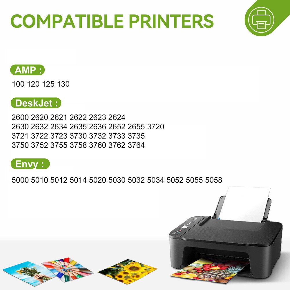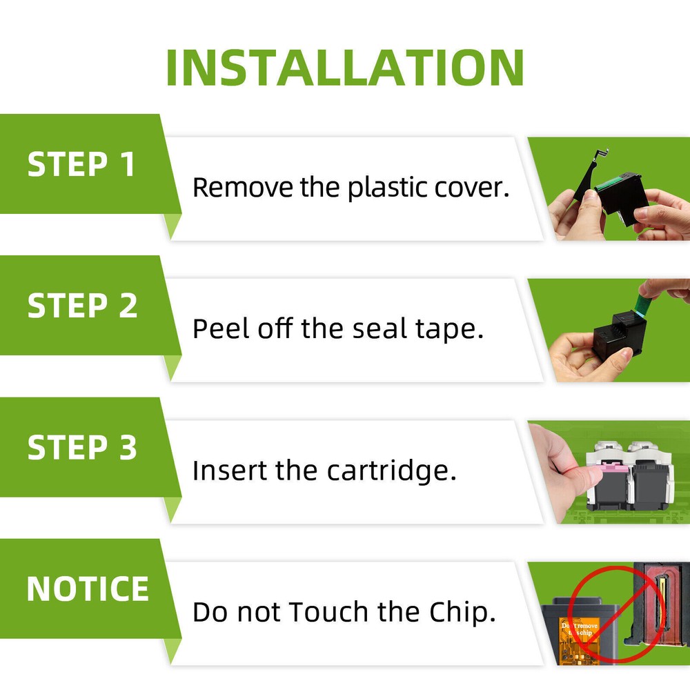 Kategorien Black Color For HP 65XL Ink Cartridge Information Type: Printer Ink Cartridge Condition: Manufactured Compatible Brand: For HP Part#: 65 XL 65-XL Color: Black;Tri-color Capacity / Page Yield: Up to 480 pages per 65 XL Black ink and 330 pages per 65XL color ink, at 5% coverage. Package Include: 1x Black + 1x Tri-Color -The picture is for reference only, not OEM Compatible Printer Models: For HP AMP 100 120 125 130 For HP DeskJet 2600 2620 2621 2622 2623 2624 For HP DeskJet 2630 2632 2634 2635 2636 2652 2655 3720 For HP DeskJet 3721 3722 3723 3730 3732 3733 3735 For HP DeskJet 3750 3752 3755 3758 3760 3762 3764 For HP ENVY 5000 5010 5012 5014 5020 5030 5032 5034 5052 5055 5058 ATTENTION When handling new ink cartridge,don’t touch the electrical contacts or print head nozzle on a cartridge. Please don’t remove the electrical contacts other than the protective tape.Otherwise, the machine will not function properly. If the printer may prompt as Low Ink or Empty(or similar message), you can click "OK", "Continue" or " √ " to bypass what printer indicates and use the cartridge directly.
