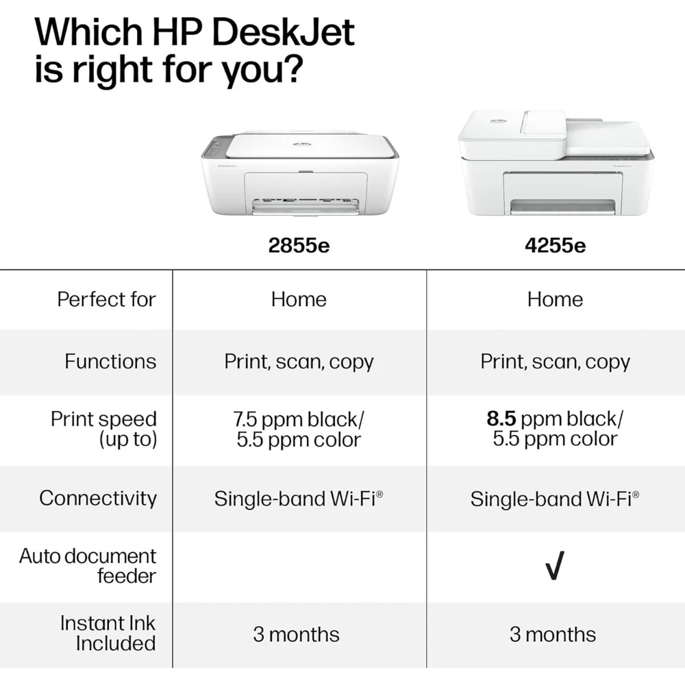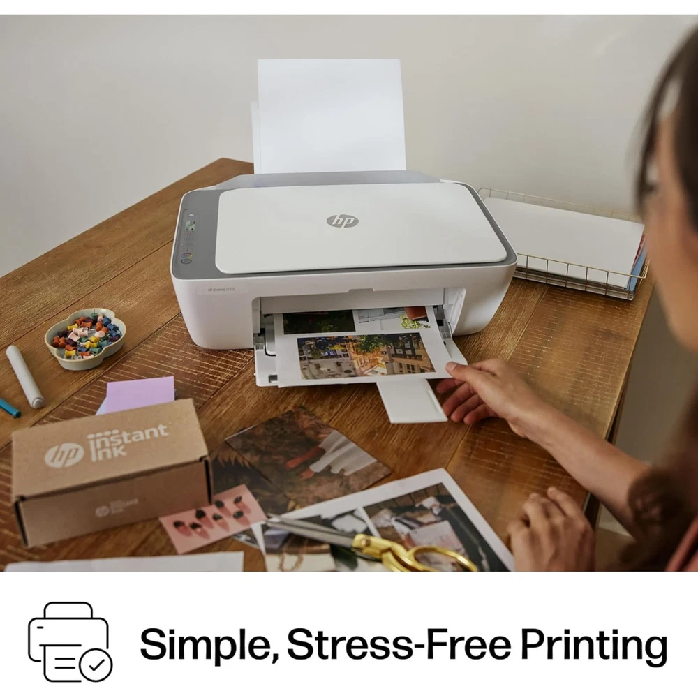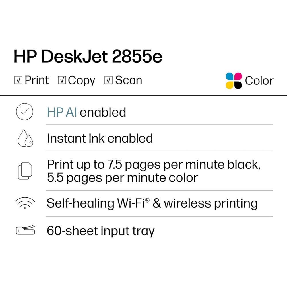 SHIPPING & CUSTOMER SERVICE INFORMATION 📦 ✅ We ship from the USA within 5–15 business days. ✅ Free Shipping – Free Returns – Money Back Guarantee ✅ No extra fees, no import tax — the price you see is the final price! If you see any message asking you to pay import taxes, please ignore it . Rest assured that all costs are already included in the listed price. 🚫 We do not ship to warehouse addresses or PO boxes , as this may result in lost packages. Please provide a valid residential or business address. 🛑 If you experience any issues with your order, please contact us directly via eBay message. ⚠️ Do not open a dispute — once a case is opened, we are unable to assist. Direct communication allows us to resolve your issue faster and more effectively. Thank you for shopping with us! Feel free to reach out anytime if you have questions. HP DeskJet 2855e Wireless All-in-One Color Inkjet Printer, Scanner, Copier, Best for home, 3 months of Instant Ink included, Single-band Wi-Fi connectivity (588S5A) HP DeskJet 2855e Wireless Color All-in-One Printer, Scan, Copy, 3 Months Free Instant Ink, AI Enabled (588S5A) Product Description The HP DeskJet 2855e delivers color printing, 60-sheet paper capacity, and a flatbed scanner for easy scanning and copying. It includes 3 months of Instant Ink with HP+ activation at printer setup. It's also AI-enabled to intuitively adapt to your workflow, with wireless and security features that keep your multifunction printer up to date and secure. Brand HP Connectivity Technology single band wi-fi Printing Technology Inkjet Special Feature wireless Color white Model Name DeskJet 2855e All-in-One Printer Printer Output Color Maximum Print Speed (Color) 5.5 ppm Max Printspeed Monochrome 7.5 ppm Item Weight 7.55 Pounds About this item The DeskJet 2855e is perfect for homes printing to-do lists, letters, financial documents and recipes. Print speeds up to 5.5 ppm color, 7.5 ppm black PERFECTLY FORMATTED PRINTS WITH HP AI – Print web pages and emails with precision—no wasted pages or awkward layouts; HP AI easily removes unwanted content, so your prints are just the way you want KEY FEATURES – Color printing, copy, scan, and a 60-sheet input tray WIRELESS PRINTING – Stay connected with our most reliable Wi-Fi, which automatically detects and resolves connection issues HP APP – Print, scan, copy, or fax right from your smartphone, PC, or tablet with the easiest-to-use print app 3 MONTHS OF INSTANT INK WITH HP+ ACTIVATION – Subscribe to Instant Ink delivery service to get ink delivered directly to your door before you run out. After 3 months, monthly fee applies unless cancelled COMPACT DESIGN – Made to fit any home ICON LCD – Print your basic documents with ease from the intuitive control panel SUSTAINABLE DESIGN – Made with at least 60% recycled plastics, plus it's ENERGY STAR and EPEAT certified This printer is intended to work only with cartridges with HP chips or circuitry and will block cartridges using non-HP chips or circuitry. Periodic firmware updates will maintain the effectiveness of these measures Product information Technical Details Product Dimensions ‎11.97"D x 16.7"W x 6.06"H Controller Type ‎iOS Maximum Media Size ‎3 x5 to 8.5 x 14 in Included Components ‎588S5A HP DeskJet 2855e All-in-One; HP 67 Setup Black Cartridge; HP 67 Setup Tri-color Cartridge; Regulatory flyer; Setup guide; Reference guide; Power cord [For ink volume and page yield information, visit http://hp.com/go/learnaboutsupplies ] Print media ‎Envelopes, Glossy photo paper, Paper (plain) Scanner Type ‎Flatbed Max Input Sheet Capacity ‎60 Max Copy Speed (Black & White) ‎7.5 ppm Compatible Devices ‎Smartphones Maximum Color Print Resolution ‎4800 x 1200 dpi Sheet Size ‎3 x 5 to 8.5 x14 Inches Maximum Black and White Print Resolution ‎600 dpi Warranty Type ‎Extended Warranty Color Depth ‎24 bpp Dual-sided printing ‎Yes Maximum copies per run ‎9 Wattage ‎2.8 watts Initial page print time ‎15 Seconds Max copy resolution color ‎4800 x 1200 dpi Printer resolution bw horiz max ‎14 Inches Max copy resolution black-white ‎600 dpi Duplex ‎Manual Hardware Interface ‎USB 2.0 Printer resolution bw vert max ‎8 Inches Ink Color ‎black, cyan, magenta, yellow Additional Printer functions ‎All In One Control Method ‎App Compatible Cartridge ‎HP 67 Output sheet capacity ‎25 Number of Trays ‎1 Processor Count ‎1 Number of USB 2 Ports ‎1 Total USB Ports ‎1 Model Series ‎2855e Specific Uses For Product ‎Office UPC ‎196337380097 Printer Ink Type ‎Dye Based Ink, Pigement Based Ink Supported Media Sizes ‎3 x 5 inches Memory Storage Capacity ‎64 MB Manufacturer ‎HP Item Weight ‎7.55 pounds Item model number ‎588S5A#B1H Number of Drawers ‎2 Size ‎standard Manufacturer Part Number ‎2855e