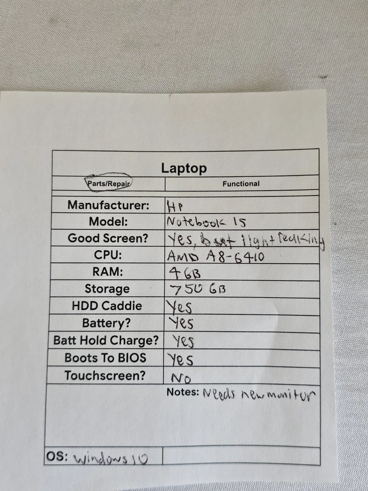 HP Notebook 15 Laptop - AMD A8-6410 - 4GB RAM - 750GB HDD - Win 10 - Read Desc. 4GB RAM. 750GB HDD. Operating System: Windows 10. Needs new monitor (Light leaking through). Laptop has been cleared and ready for use. See pictures. Laptop is sold as laptop only with no accessories or chargers included. SHIPPING: We will ship your item in 1-3 Business days. Most items are ship within one day but I work full time and cant always get all orders shipped. Your item will be packaged nicely to ensure safe arrival. We will always use the most cost effective shipping method. TERMS: Please pay for your item within 3 business days or we will be forced to open an unpaid item case after a week. No Returns accepted on items for Parts THANK YOU AND HAVE A GREAT DAY!!!!!