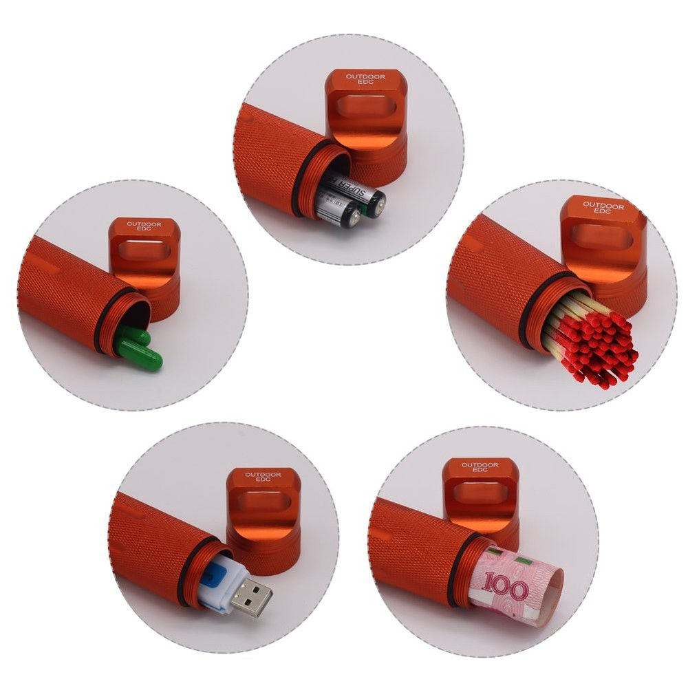 The tough Capsule can be used for so many different projects: - For containing medicine medications prescription supplements - For protection of USB drives containing vital documents - For camping, water activities, travel in general with matches, first aid items and survival supplies that you need to keep dry - For hiding a spare key ,money for emergencies or others which need a Secure Storage - For delicate mechanical items and other small valuables Small handy and portable, but also large enough to meet your imagination You can identify the contents by the different colors, Nice Black color and bright Orange color are easy to find Specifications: * Material: Strength cast metal materials - aluminum alloy * Shape: column/cylinder * Color: Black and Orange * Size : 3.9”/ 100mm (High), 1.18”/ 30mm(Outer Diameter) * Package includes: 1pcs Black outdoor EDC and 1pcs Orange outdoor EDC There may be little error of measuring due to manual measurement. Tips: Please make sure you clean it a little before first using it TIPS: For any questions or concerns, please don't hesitate to reach out to us. We're here to make things right for you. The Tough Metal Pill Fob / Container is made of Military Grade Aluminum Alloy, solid, well built, indestructible; and it’s good craftsmanship, the nice threads are extremely smooth, feels very good in the hand The small high capacity time capsule/cylinder is screwed with rubber O-ring seal which make it 100% waterproof, it screw on and off very well and won't open accidentally The handy EDC survival kit is small and portable but the capacity is large enough to meet your daily need and some outdoor activities, like camping, hiking, boating, fishing Perfect to store vitamins, capsules, even a small nitroglycerin pill bottle, coin, quarters, money, U-disk,easily-lost Bluetooth earpieces, floss stick, toothpicks, earbuds, batteries, matches, flintstones, outdoor seasoning, delicate mechanical items and other small valuables The Little Emergency First Aid Kit is lightweight, easy to carry in purse or pocket, lunch pack and hiking/snowboarding pack, and can be clipped easily to D-ring locking carabiner keychain