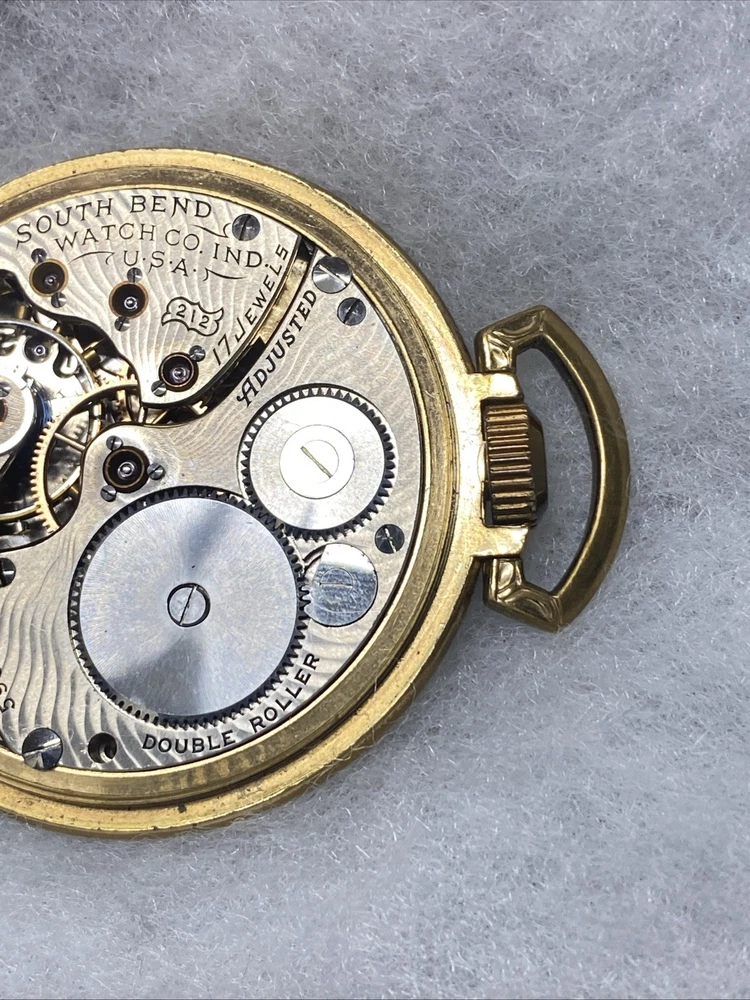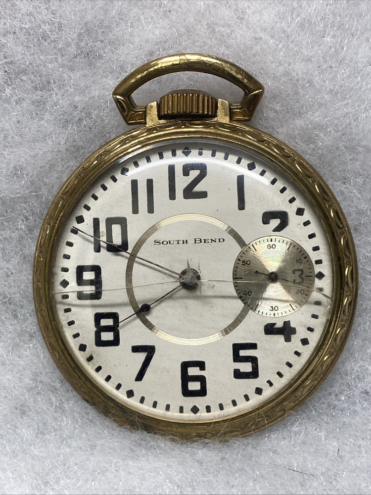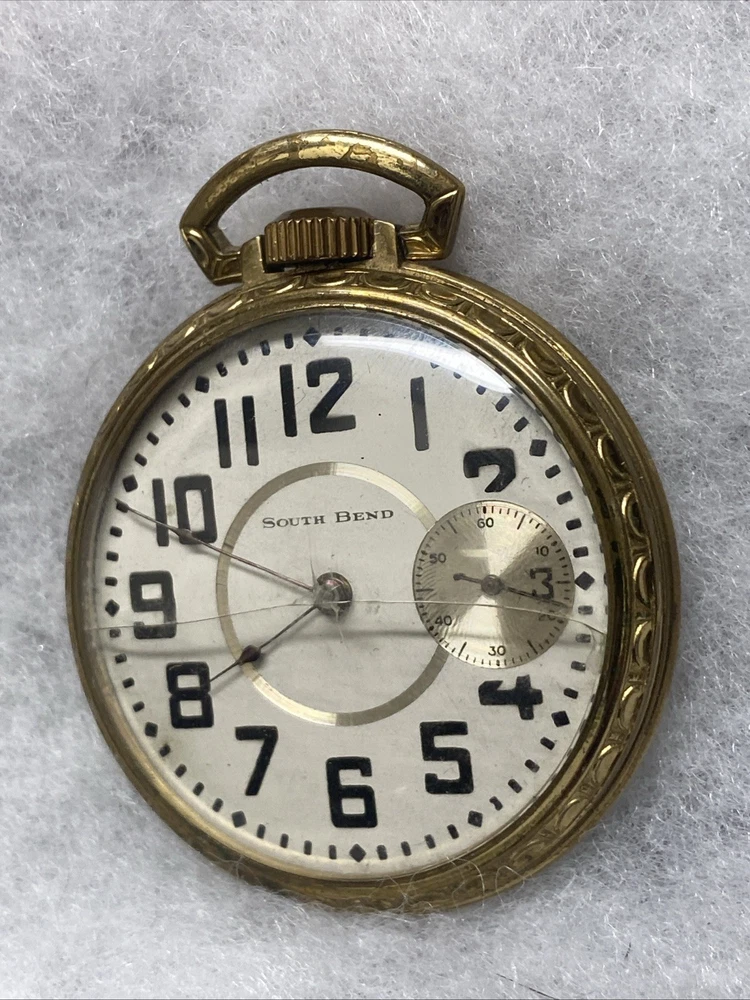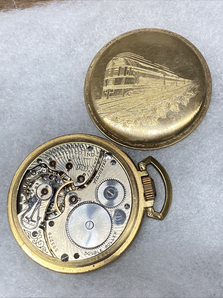 The product is a rare 1909 South Bend Model 2 Grade 212 16s 17J pocket watch with a train-themed case. This vintage timepiece features a mechanical manual movement, numerals on the dial, and a gold toned case with a polished finish. The open face closure and lever escapement type add to its unique charm. This pocket watch is a highly sought-after collectible for watch enthusiasts and collectors, especially those with a passion for antique timepieces. Selling only as parts/repair untested condition. Item doesn’t function have no knowledge on item testing or repair. Please review all images prior to your purchase. Crystal is damaged as shown.