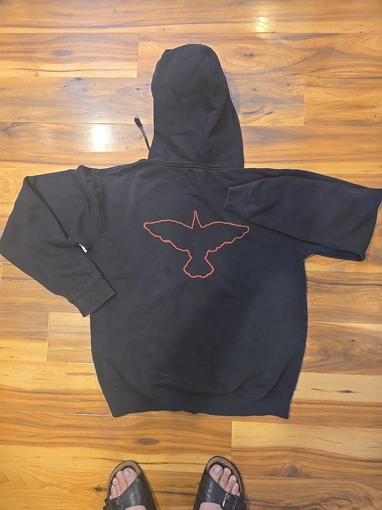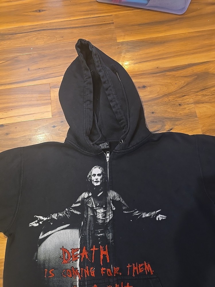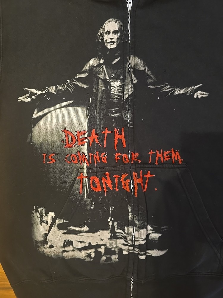 vintaged The Crow hooded zip up sweatshirt black. color looks good there are holes under arms. and couple little holes as pictured.also pocket is separated apart.