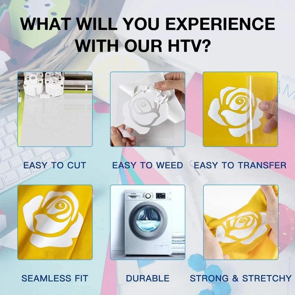 Fabric 【EASY TO CUT WEED TRANSFER】Our premium quality heat transfer vinyl will save time which you may waste on each image or letter, because you can cut and weed easily through the designs just right. The iron on vinyl is sensitive to temperature and pressure, which can be heat transferred to any t-shirt easily. Before cutting, make sure the blade is clean and sharp, so that your design can be cut well and weeding can be done better 【GREAT STICKINESS】Our htv vinyl rolls is pretty sticky, they adhere to the fabric seamlessly and has held up well in the wash without fading, peeling and crack. When ironing, please pay attention to the various parameters of ironing so that the ironing effect will be better. <300℉ -320℉, Mid-pressure 5-8 kg, 10s-15s> After cooling for 1-2 minutes Peel off afterwards Your designs of our white heat transfer vinyl will keep the same color and can't come off even after repeated washing cycles 【USE WIDELY & SAVE TO WEAR】Your shirt, tote bags, sportswear, aprons, hat and pillow, which use our white htv, make you stand out from the crowd. Heat transfer vinyl is suitable for athletic mesh fabrics, Cotton, polyester and cotton blend, lycra/spandex, textiles etc. Our htv vinyl materials are SGS certified and are safe to wear 【12 INCH x 8 FEET】HTVRONT htv vinyl rolls are easy and convenient to cut into different sizes of art designs or logos or letters and perfect for 12''x12" and 12''x24" cutting mats. Our iron on vinyl are compatible for all cutter machines 【PERSONALIZE GIFT & CUSTOM MADE】Perfect choice for Christmas, Halloween and anniversaries gift to your family or lover. I mean, who doesn’t love a fun new t-shirt? And with our heat transfer vinyl, you can easily customize it to be something personal that they will love. If you are not satisfied with our htv vinyl, please feel free to contact us Product Description Our iron on vinyl is pretty easy to cut and weed, allowing you to create projects of all sizes. Our htv is sensitive to pressure and temperature, which can be transferred on any Fabric easily. Our vinyl is made of PU material, it is not only thin but also more flexible and stretchable. 1 EASY TO CUT & WEED 2 EASY TO TRANSFER 3 STRETCHABLE Not Just a HTV Roll Our htv has a great applications on daily necessities, like T-shirt, hats, pillows, bags, wallet etc. HTVRONT Comparison Add to Cart Add to Cart Add to Cart Add to Cart Add to Cart Add to Cart Customer Reviews 4.6 out of 5 stars 3,632 4.6 out of 5 stars 1,187 — 4.7 out of 5 stars 1,305 3.8 out of 5 stars 65 — 4.5 out of 5 stars 38 Price $25.99 $ 25 . 99 $49.99 $ 49 . 99 — $19.99 $ 19 . 99 $129.99 $ 129 . 99 $79.99 $ 79 . 99 $45.99 $ 45 . 99 SIZE 12'' x 3FT 12'' x 3FT 15 X 15" 15"x15" 19.68"L x 15.74"W x 11.8"H Multi-size 4.3"L x 4.8"W x 6.1"H COLOR 12 Boho Colors 20 Vibrant Colors Bubble Blue Grey White Multicolor Misty Blue USAGE Used in shirt,hat & pillow,etc Used in shirt,hat & pillow,etc DTF,Heat Transfer, Sublimation Used in Heat Press Machines Heat Transfer, Sublimation Used in shirt,hat & pillow,etc Shirt Cup Shoes Doll Hat CLASSIC HTV ✔ ✔ ✔ ✘ ✔ ✘ ✔ PUFF HTV ✘ ✘ ✔ ✘ ✔ ✘ ✘ HTV BUNDLE ✔ ✔ ✔ ✘ ✔ ✘ ✘