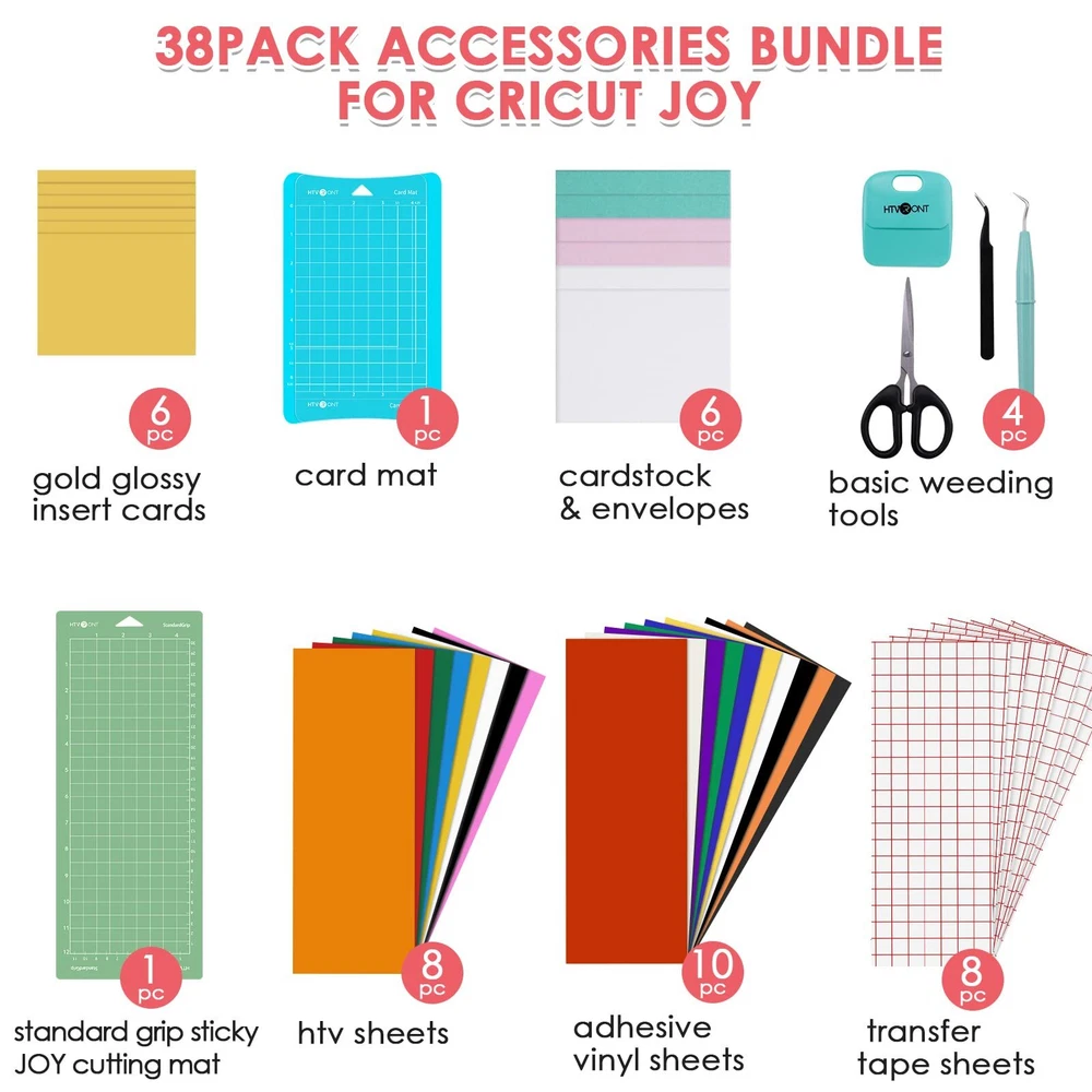 【Tools and Accessories Bundle】 A wealth of cutting tools can meet all your needs in the crafting time with cutting machine. Includes the following products: 6*gold glossy insert cards, 1*card mat, 6*cardstock&envelopes, 1*basic weeding tools bundle, 1*standard grip sticky joy cutting mat, 8*htv sheets, 10*adhesive vinyl sheets and 8*transfer tape sheets. 【Amazing Experiential Card&HTV&Adhesive vinyl】Different from traditional greeting cards and invitations, you can design a unique card pattern according to your own preferences. Our iron on vinyl is thin and smooth making it great for cutting and weeding. And the permanent vinyl has strong stickiness that makes vinyl hold on tightly to any smooth surface, even in wind and rain. 【Say Goodbye to Scattered Materials】Packed in a cardboard box. Keep the inside accessories tools from damage during transportation, and it can also be a good helper for your storage after use. Avoid losing and wasting of machine bundle. 【Beginners Friendly&Wide Applicability】The complete bundle and paper guide make this a great starter kit. Simple to operate and suitable for a variety of materials. Heat transfer vinyl are suitable for clothing, baseball caps, bags, shoes, etc. Permanent vinyl can be used for cups and decorations for indoor and outdoor use. Cards can also be used to make invitations, envelopes and greeting cards. 【Unique Wonderful Gift】Let you enjoy your crafting journey while making beautiful gifts for family and friends with the accessories bundle. It can also be a good Valentine's Day, Christmas, Thanksgiving, and other holiday and birthday gifts.