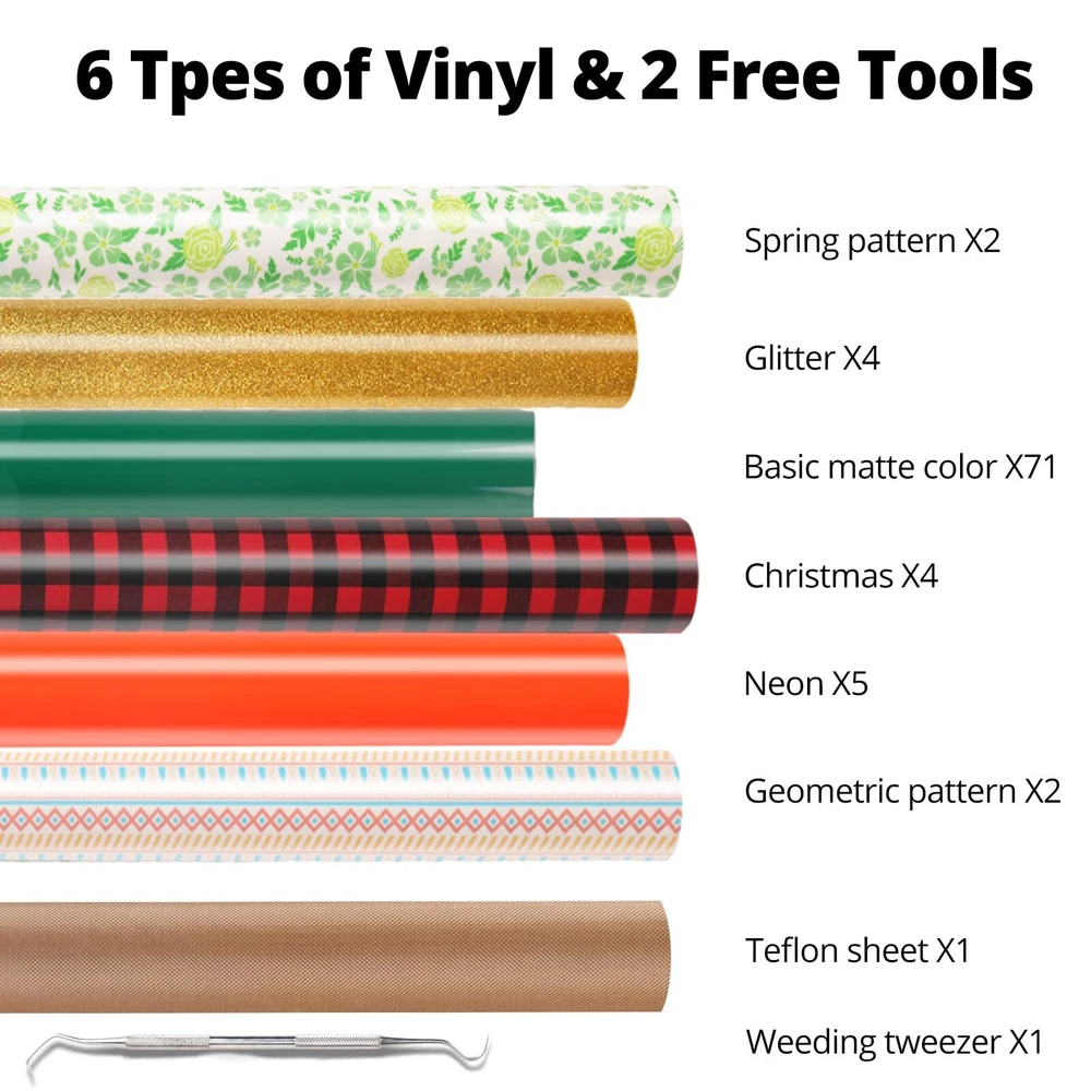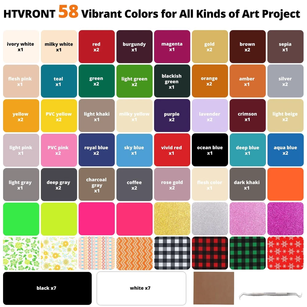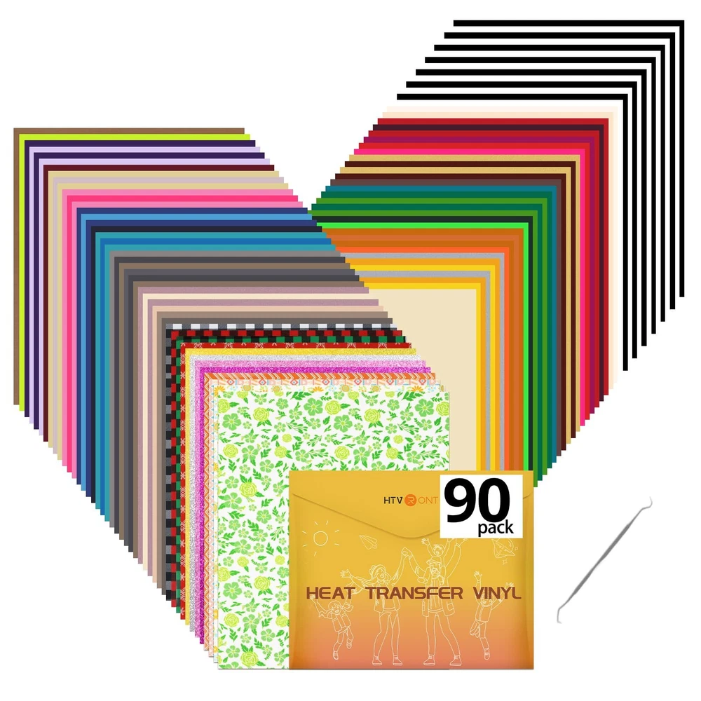 🔥【BUNDLE COLORS & UNIQUE MATERIAL HTV】🔥 The 90 sheets htvront heat transfer vinyl includes 58 vivid colors with custom SIZE 12" x 10". Our heat transfer vinyl includes not only 72 sheets of the most popular matte colors but also 5 of the most popular neon htv, 4 Christmas htv, 4 glitter htv, 2 spring Pattern htv, 2 geometric pattern htv, 1 pcs teflon sheet for heat press and 1 free weeding tweezer for htv vinyl project. 🍭【ECO &USING WIDELY】🍭 Your t-shirt, bag, sportswear, aprons, hat, and pillow, which use our iron on vinyl, make you stand out from the crowd. Our 2023 newest version htv vinyl upgraded to adhere to all kinds of fabric, suitable for athletic mesh fabrics, cotton, polyester and cotton blend, leather, lycra/spandex, textiles, etc. Our materials are SGS-certified eco-friendly and safe to wear. 🌈【GREAT STICKINESS & MACHINE WASHABLE】🌈 Unlike other htv heat transfer vinyl with fading, peeling, and crack. Our htv vinyl bundle are pretty sticky, once on the shirt it was pretty durable, adhered to the fabric seamlessly, and has held up well in the wash. Your designs will keep the same color even after repeated washing cycles. 🐳【Say Goodbye to Scattered Materials】🐳 Our HTVRONT heat transfer vinyl for t shirts is packed in a durable storage file folder. Keep the weeding tweezer and heat transfer vinyl sheets from damage during transportation, and it can also be a good helper for your storage after use. Avoid losing and wasting of htv iron on vinyl. ✂ EASY CUT & WEED & TRANSFER ✂: Our 90-pack htv bundle will save you time which you may waste on each image or letter, because you can cut and weed easily through the designs just right. The vinyl htv is sensitive to temperature and pressure, which can be heat transferred on any t-shirt easily. This is a perfect pack for beginners or someone who needs small amounts of a lot of colors.