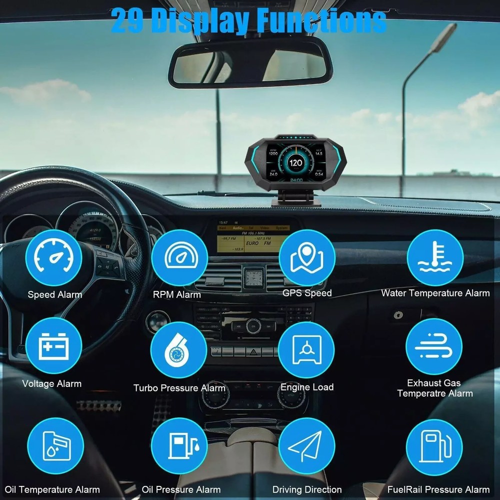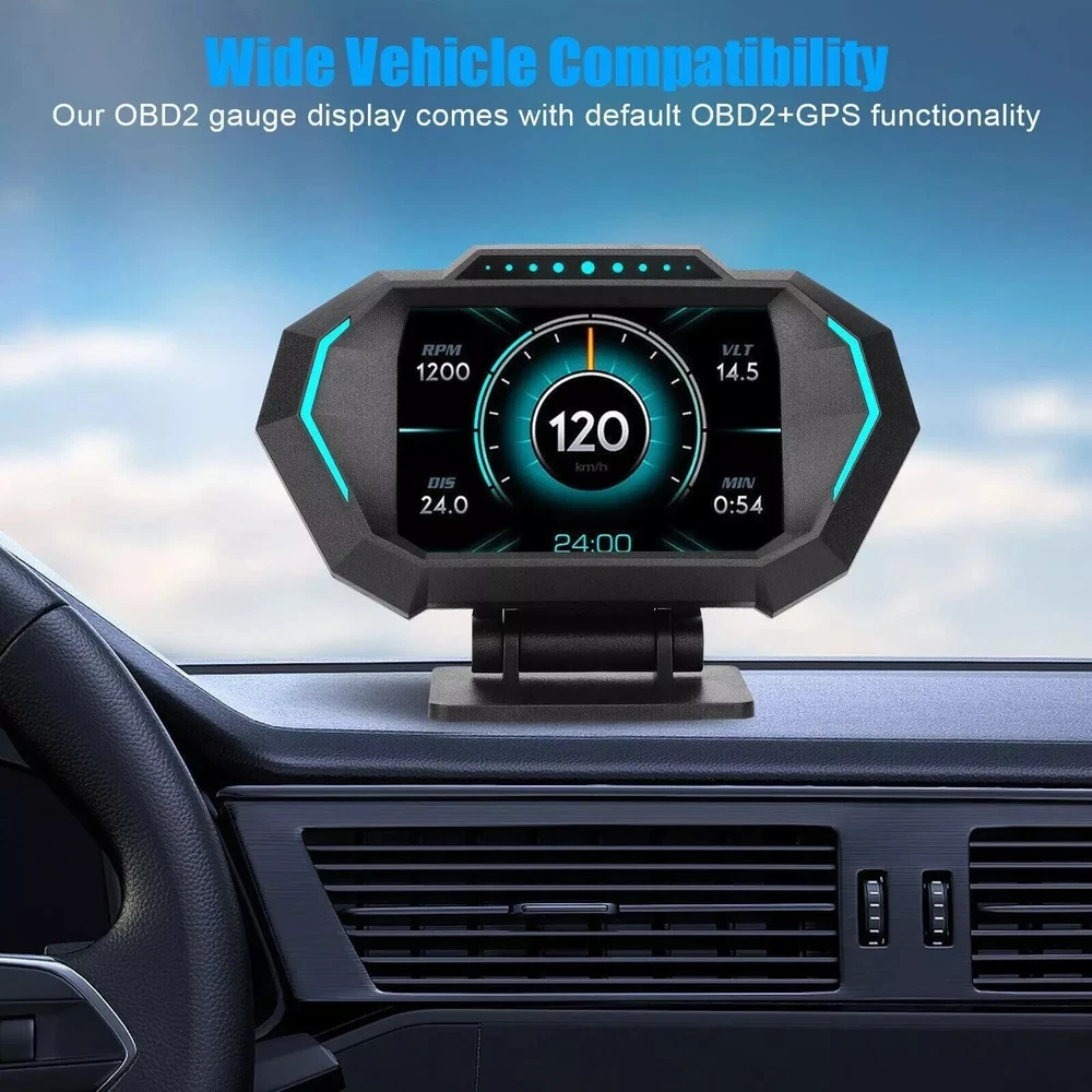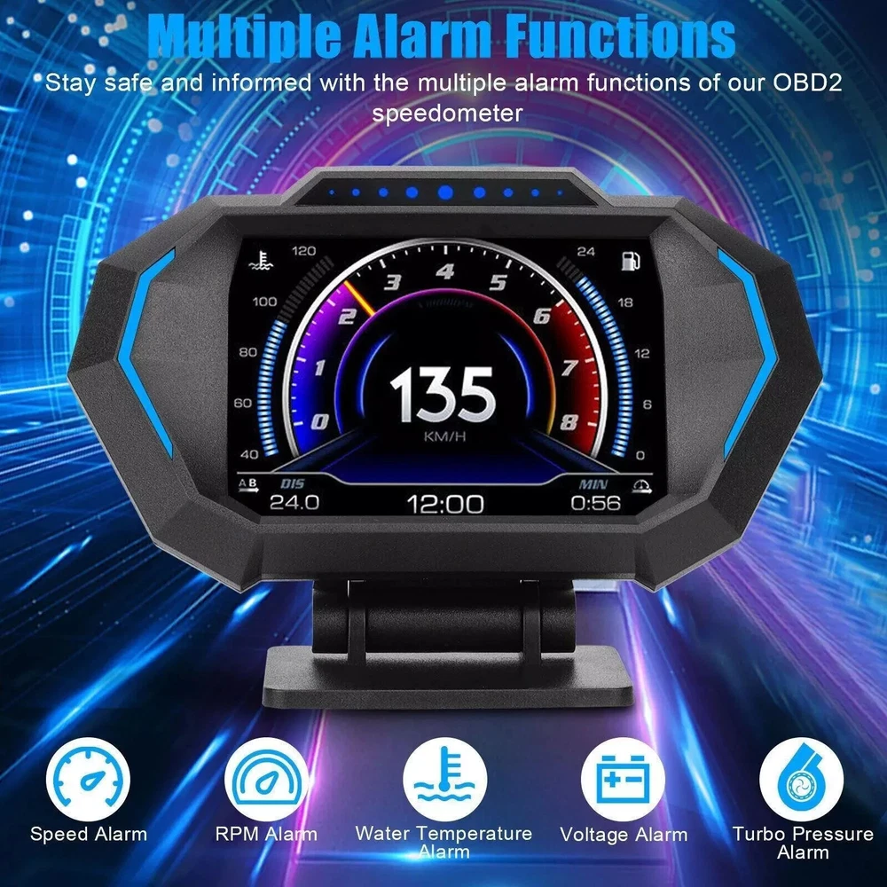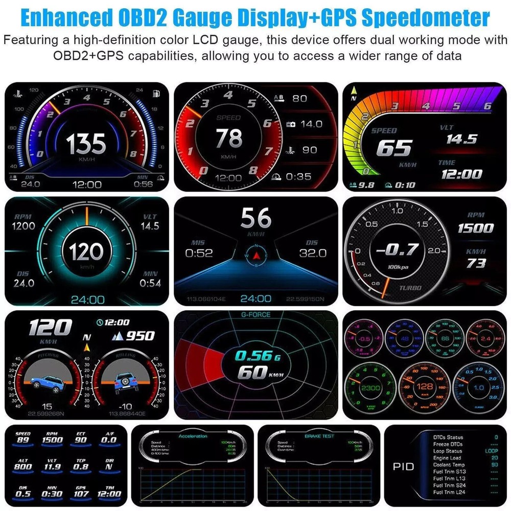 Product Feature ✨Enhanced OBD2 Gauge Display+GPS Speedometer: Featuring a high-definition color LCD gauge, this device offers dual working mode with OBD2+GPS capabilities, allowing you to access a wider range of data. With six adjustable color atmosphere lights and twelve unique UI display interfaces, you can effortlessly switch between them to enjoy a rejuvenating driving experience. ✨29 Display Functions: This HD heads-up display for cars offers a wide array of real-time information, including speed in KM/H and MPH, RPM, Speed MPH, Compass Direction, Driving Distance, Altitude, oil temperature, turbo pressure, engine load, and more. Stay informed about your vehicle's condition at all times. ✨Multiple Alarm Functions: Stay safe and informed with the multiple alarm functions of our OBD2 speedometer. It provides alerts for RPM, overspeed, water temperature, oil temperature, oil pressure, low voltage, turbo pressure, fatigue driving, and more, ensuring you are aware of any potential issues. ✨Simple Installation: With its adjustable bracket, this device can be easily installed on the dashboard or stuck onto the windshield. Enjoy a hassle-free installation process without causing any damage to your vehicle. ✨Wide Vehicle Compatibility: Our OBD2 gauge display comes with default OBD2+GPS functionality. If your vehicle doesn't support the OBD2 protocol, the GPS function automatically takes over, ensuring compatibility with a wider range of vehicles. Product Specification Type: Speedometer Material: ABS+PC Color: Black DisplayType: 5inch LCD Screen Applicable Models: Universal Dual System: OBD2 + GPS Package Included 🎁 1 x OBD+GPS Speedometer 🎁 1 x OBD Cable 🎁 1 x Holder 🎁 1 x Anti-slip Mat 🎁 1 x English Manual