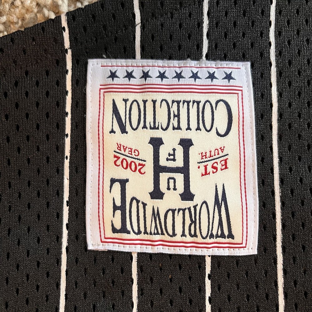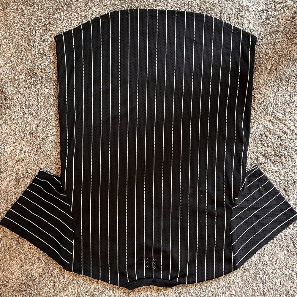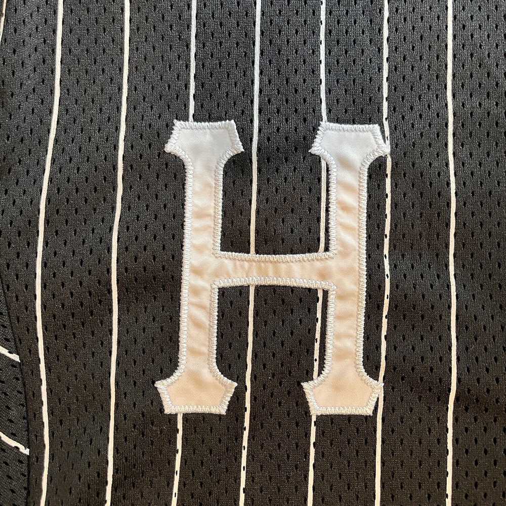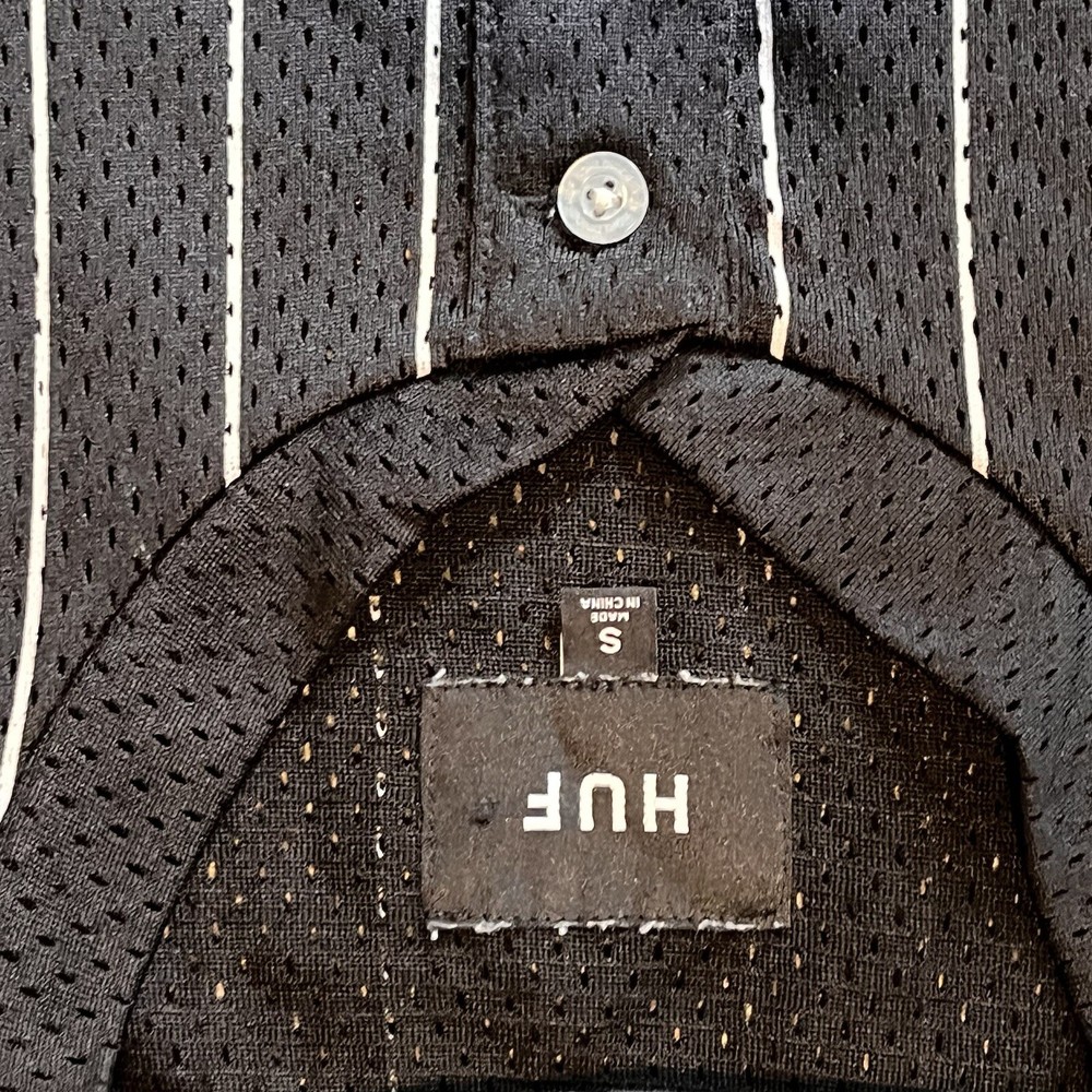 This HUF Worldwide Pinstripe Baseball Jersey in size S features a classic pinstripe pattern and a comfortable polyester fabric with a medium wash. It has short sleeves, a button closure, and a regular fit, making it suitable for casual wear or activities like baseball, skateboarding, and street wear. The breathable jersey style makes it ideal for all seasons, and it is easy to care for, perfect for everyday wear.