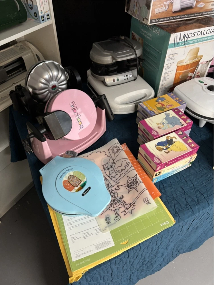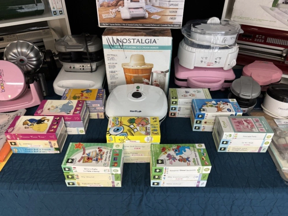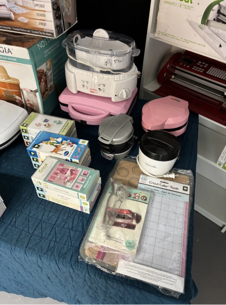 This is a significant collection of Cricut cake-related items, including cartridges and accessories. The items are of multicolor plastic material. The collection is ideal for baking enthusiasts looking to enhance their cake decorating skills and create unique designs using a Cricut machine. HUGE CRICUT CAKE/ BAKER COLLECTION FOR SALE Includes: (1) brand new Sizzix Embossing Machine (1) brand new Cricut CAKE (2) used Cricut CAKE (1) used Cricut Expressions 2 (2) used Cricut Expressions (2) used gypsy Provo design studio (50-100) cartridges with keyboard layovers (1) used BabyCakes Dozen Cupcake Maker (1) used BabyCakes CakePop Maker (1) Sunbeam Instant Steamer (1) Sunbeam CAKE maker (1) Nostalgia Ice Cream Maker & much more If shipping, will ship in a total of 3-5 boxes to ensure all items reach safely and in working condition as being sent out. Will provide tracking information once the items have shipped. Thank you for your purchase !