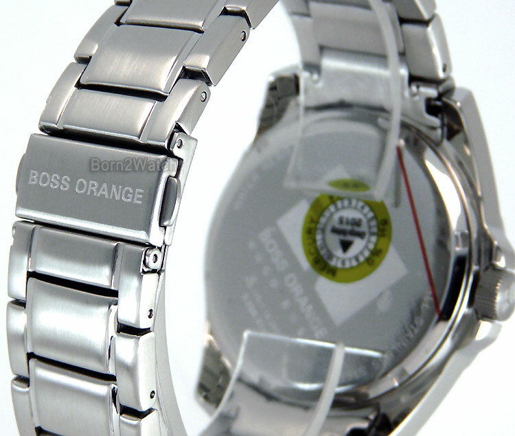 WE DO NOT SELL REPLICAS! 100% BRAND NEW AND AUTHENTIC! *SELLER RETIRED *SUPER CLEARANCE* MEN HUGO BOSS "BOSS ORANGE" 1512836 PRECISION JAPAN QUARTZ MOVEMENT MULTIFUNCTION DAY SUB-DIAL AT 9 O'CLOCK DATE SUB-DIAL AT 3 O'CLOCK AM-PM SUB-DIAL AT 6 O'CLOCK BLACK DIAL WITH ORANGE ACCENTS STAINLESS STEEL CASE IN POLISHED/BRUSHED SATIN FINISH MINERAL CRYSTAL SQUEEZE-RELEASE CLASP WITH EDGED HUGO BOSS SIGNATURE CASE DIAMETER IS 46mm EXCLUDING CROWN CASE IS 13mm HIGH LUG SIZE IS 24mm (WHERE BRACELET CONNECTS TO CASE) WEIGHS 6.0oz (170g) MAXIMUM WRIST SIZE 9" DOES NOT COME IN PRESENTATION GIFT BOX