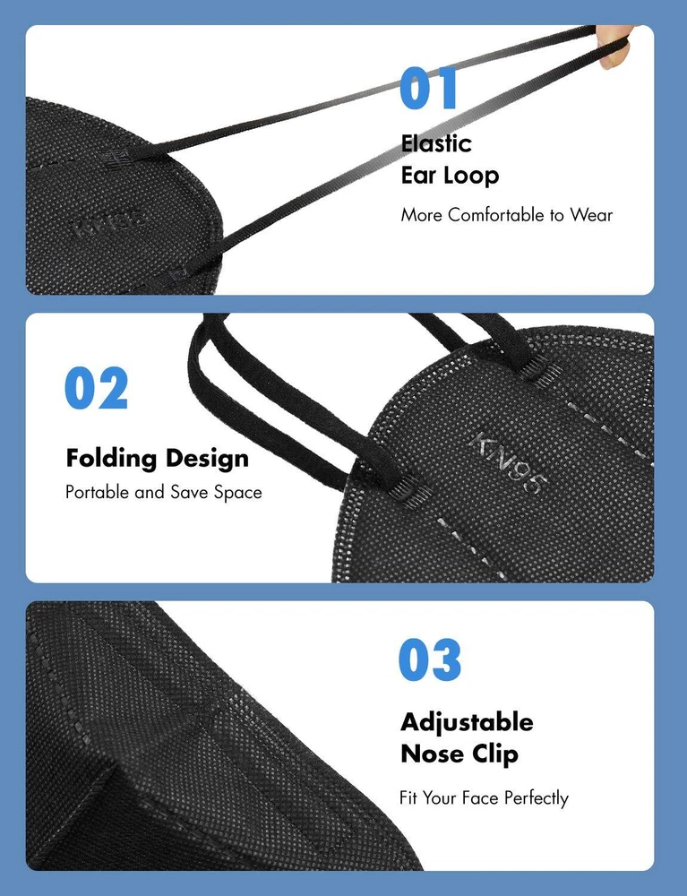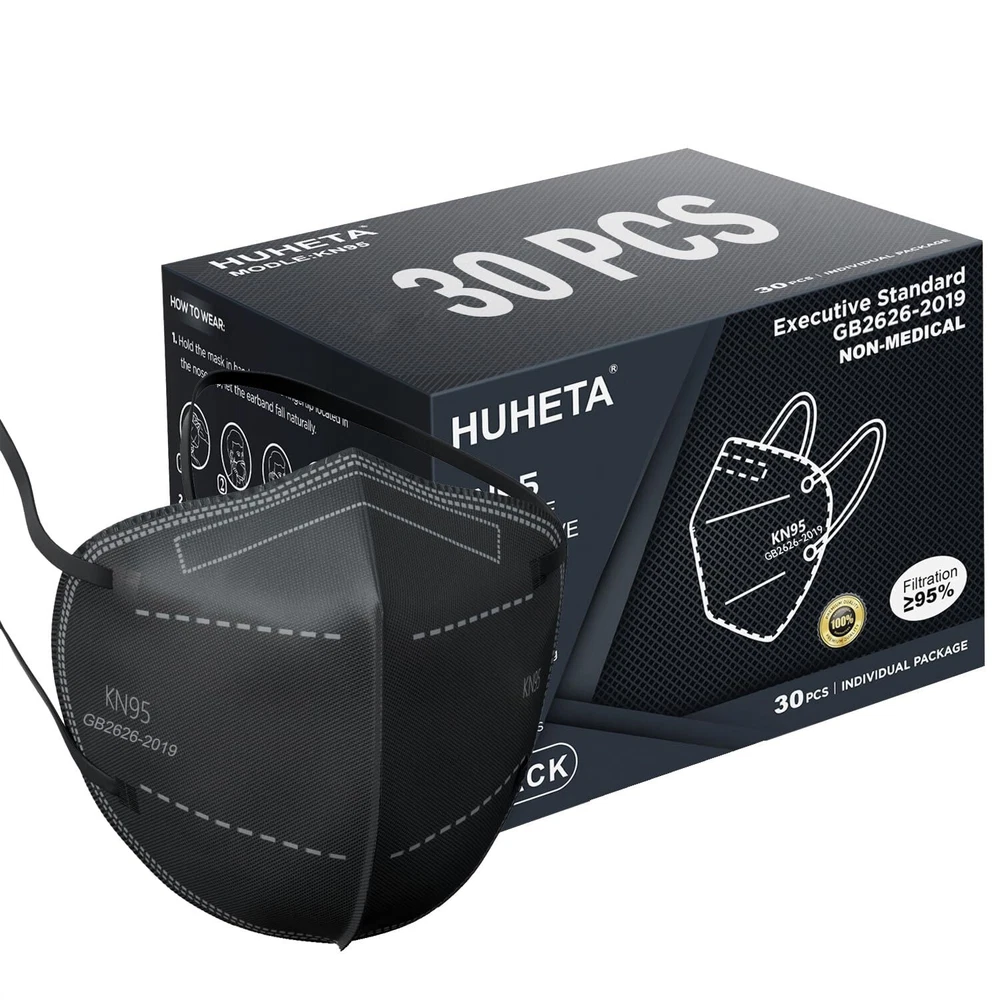 HUHETA KN95 Face Masks, Packs of 30 Individually 1 Count (Pack 30), Black Product Details Package Dimensions : 5.57 x 5.19 x 4.29 inches; 8.78 ounces Item model number : KN95 Department : Unisex Adult Manufacturer : Guangdong Nuokang Medical Technology CO., Ltd Brand: HUHETA Filter Class: KN95 Size: 1 Count (Pack of 30) Color: Black Number of Items: 30 5-Ply Protective: This mask is made of 2 non-woven outer layers, 2 melt-blown inner filter, 1 non-woven fabric middle layer absorbing the moisture. This 5-Ply mask is designed to offer more protection than a standard disposable 3-Ply mask. (PS: Has two layers of melt-blown fabric. When they are produced, they are easy to stick together, which will cause you to mistake them for one layer, You can separate them by rubbing them) Upgraded Packaging: This package was well packaged with a seal label which includes 30 individually wrapped masks, which can avoid the pollution caused by touch when taking the mask and also can be perfectly placed in your backpack, purse and pocket. Convenient to carry and use. High Filtration: The minimum filter efficiency is 98%, greatly keeping you from dust, PM 2.5, haze, smoke, automobile exhaust, etc. Perfect For families, office staff, warehouse workers. Comfortable & Breathable: High-elastic ear loops and adjustable nose clip to ensure a comfortable fit and no strain of ears. It's lightweight and foldable, can cover mouth, nose and chin easily. Creates a tight seal & stops glasses from fogging.