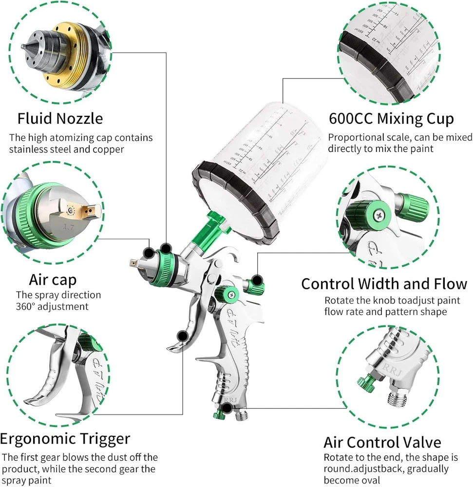 HVLP Air Paint Spray Gun Kits Gravity Feed Car Auto Primer 1.4/1.7/2.0MM Nozzles RRJ Category RRJ Category Spray gun Electric Spray Gun Corded Version Cordless Version Automatic Spray Gun Air Spray Gun Automotive Topcoat Spray Gun Touch-up spray gun Sandblasting Gun Spray gun Accessorie Disposable Spray Gun Cups Air Pressure Regulator Oil Water Filter Other Accessories Other PRO PAINT SPRAYER: This air spray gun has a pressure range of 2.5-3.5 bar, spray reach of 160-240 mm, air consumption of 200-280 l/min. The 15-hole hood is precision-engineered for consistent, fine spraying. Its comfortable handle design makes triggering a breeze, cutting down on fatigue PRECISE CONTROL: The RRJ HVLP paint gun provides total command with its 360° adjustable nozzles and three control buttons. The flow control valve regulates paint output; the spray width adjustment valve sets the spray width; the air valve allows for airflow regulation. Adjust these three knobs as needed to suit a variety of projects INDUSTRIAL GRADE SPRAYER: The one-piece gun body of the automotive paint gun is made of durable aluminum alloy, and the nozzle is made of brass, which provides better paint dispersion and atomization, giving you a smooth and even coating surface and a smoother painting experience EASY TO USE AND CLEAN: Assembly is a snap, even for newbies, thanks to our straightforward manual. Cleaning is a cinch too—just brush and needle the nozzle post-use, then hang it to dry. Proper maintenance keeps it ready for action. The auto spray paint is a convenient addition to your life, saving you time WIDE APPLICATION: The car paint kit contains three different nozzle sizes (1.3/1.7/2.0 mm), catering to all needs, whether you're a beginner or a pro. It's perfect for automotive priming, furniture, cabinet, wall painting, toy models, mural crafts, instruments, equipment, yard landscaping, fence staining, and more WHAT'S INCLUDED: 1x HVLP paint sprayer gun, 3x nozzle kit, 1x 650 ml paint cup set, 1x regulator, 5x paint filter papers, 1x strainers, 1x cleaning set, 1x threaded fittings, 1x set of connectors, 1x tape, 1x wrench, and 1x instructions manual. By owning this spray paint gun kits, you can save on pricey labor costs NOTICE: This is an air paint spray gun and needs to be connected to an air compressor! The RRJ spray paint gun excels in all paint tasks with its superior paint transfer and minimized health hazards. If you have questions about the spray gun for painting, reach out through your order. Our after-sales team is standing by to assist you SET B# Include : 1x 1.3/1.5/1.8mm HVLP Spray Gun kit 1x 600ml Plastic Cup 1x Spanner Wrench 1x Screw 1x Brush 1x Mesh Filter 1x US connector 1x O ring 1x Instruction Manual SET C# Include : 1x 1.4mm/1.7mm/2.0mm HVLP Spray Gun kit 1x Plastic Cup 3x Disposable cups 1x Air Pressure Regulator 1x Spanner Wrench 1xConnector set 1x Brush 1x Mesh Filter 1x Instruction Manual PAYMENT POLICY SHIPPING POLICY RETURN & REFUND FEEDBACK CONTACT PAYMENT POLICY Payment Policy For your safety and convenience, we process all payments through PayPal where all major Credit Cards are accepted (Amex, Visa, MasterCard, Discover, etc.). Import duties, taxes and charges are NOT included in the item price or shipping charges. These charges are the buyer responsibility. Please check with your country customs office before buying. Payment must be made within 7 days after you win the auction. Non-Paying bidders will be reported. SHIPPING POLICY Shipping Policy We do our best to ship it out within 1 business of receiving your order and provide tracking numbers on all orders. Please note that we can only ship to addresses verified with PayPal or your credit card. Import duties, taxes and charges are not included in the item price or shipping charges. These charges are the buyer's responsibility. Delivery time might be longer if the item(s) be inspected by customs RETURN & REFUND Return & Refund All our products come with a 30-Day Return Policy. If you would like to return your item and you are within 30 days of the purchase, and it is still in its original condition, you can return the item by contacting us through eBay messaging. If you are not 100% satisfied, please let us know the Detailed Problem,We will give you a 100% satisfactory solution If you received an incorrect, damaged, defective, or item not as described, contact us for a partial/full refund or replacement on our cost. Buyer should pay for the return shipping fee if All NON-Seller Mistake returns for refund . (E.g. you brought wrong size or wrong item). FEEDBACK Feedback We hope to give you a positive eBay experience by working hard, and we expect to receive a positive feedback and Detailed Selling Rating (DSR) of 5 Rating in ALL of the feedback categories (Item as described, Communication, Shipping Time and Shipping and handling charges) from the buyer upon receiving the item . If you are not satisfied with our items or service, please don't hesitate to contact us before you leave any Neutral/Negative feedbacks, we will always try our best for 100% customer satisfaction. Communication is the best way to solve problem. leaving a negative feedback will not help us solve any problems. CONTACT About Item All items sold by us are being described to the best of our abilities, as accurate as possible, and with utmost conscientiousness on our part. However, to avoid any potential oversights, I respectfully request your assistance in helping us to make this a mutually satisfactory transaction by THOROUGHLY reviewing item description and photos, and asking all questions PRIOR TO BIDDING. Customer Satisfaction Do not hesitate to contact us anytime before and after your purchase, we are committed to your 100% customer satisfaction. We back our commitment with superb service, 100% full money back and a customer satisfaction guarantee. Our goal is to make sure you are a happy customer and pleasant shopping with us. On Oct 29, 2024 at 00:38:23 PDT, selle