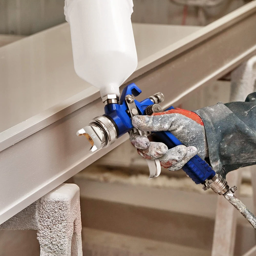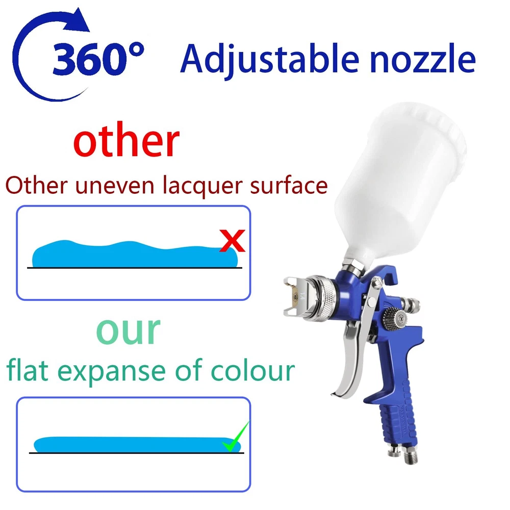 Application works well for spraying. Our Air Spray fits snugly and does not leak or overspray, but is loose enough to install and remove easily. Idea for automotive industry, home projects, walls, ceilings, shoes, painting, art and craft, equipment and furniture paint applications, air control and so on. This tool can spray many different types of paints if diluted correctly Easy to clean, for the tips could be used for lots of times. Specifications: Required air supply: 1-3 HP compressor . Required air pressure: 20-70 PSI . Air consumption: 6 CFM . Output: 200-300 CCS per minute. Nozzle size: 1.4mm . Cup capacity: 20 oz . Air inlet: ¼"-18 NPS. Using Tips: After receiving the goods, please try to use water as experiment, as the verified results are satisfied, then apply it in normal painting work. After using the , you must use the lacquer thinner and then spray a few times, keep the tank and the nozzle of the residual paint spray clean. It can prevent blocking the , which does not affect the later use of the . 【SPECIFICATIONS】Type of Feed: Gravity / Fluid Nozzle:1.4 mm / Air pressure: 3 bar (43 PSI) / Air consumption:15 cfm / Paint Capacity:600 CC / Air Inlet:1/4" 【HIGH QUALITY】air compressor spray ’s ergonomic designed handle for comfortable grip. Easy trigger reduce operating fatigue. Simply operate to touch up or painting. 【ADJUSTABLE】Three adjustment valve can flexibility to adjust the liquid volume/ air volume/ spray range to meet your various usage needs, such as car、wall、wood、metal、leather. 【600ML PAINT CUP】600CC detachable gravity feed cup, minimizes waste of paint in the cup and removable for easy cleaning. 【360°ADJUSTABLE NOZZLE】1.4mm Stainless Steel nozzle, Brass Airflow Cap, nozzle direction can be adjusted 360°by adjusting the nozzle cap, Stainless Steel material is very durable and can spray most light to medium viscosity materials, used for automotive painting, household appliances, furniture, iron plate, aluminum, plastic, etc.