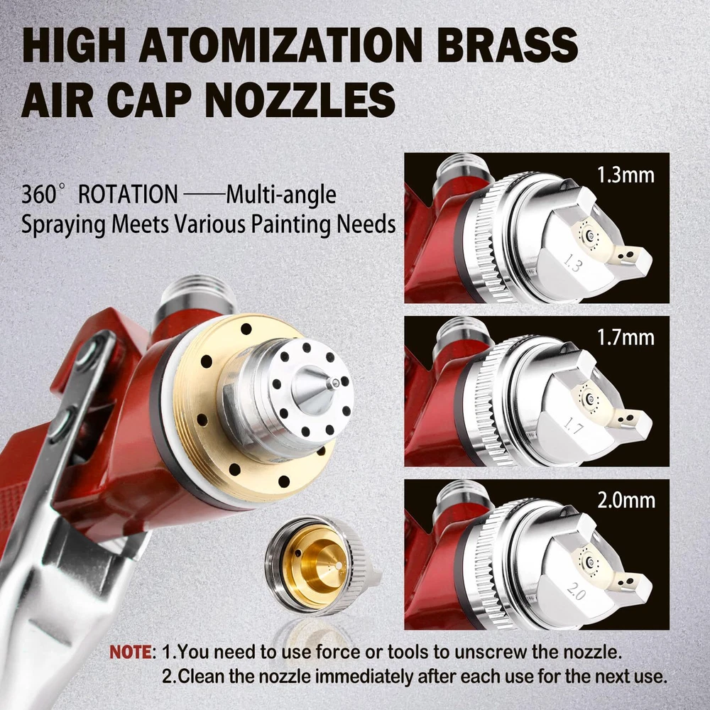 Why Choose Air Spray ? pneumatic spray is chosen for its efficiency and versatility in applying coatings such as paint, varnish, or primer to surfaces. It utilizes compressed air to atomize and propel the material, ensuring a smooth and even finish on various substrates. Specifications Air Pressure Requirement: Typically operates at 30-50 PSI (pounds per square inch), ensuring optimal atomization without overspray. Material Compatibility: Spray paint suitable for water-based and oil-based paints, enamels, lacquers, and primers. Nozzle Size Options: Available in various nozzle sizes (1.3/1.7/2.0) to accommodate different viscosity and application requirements. Called: automotive paint sprayer, spray for painting, hvlp paint sprayer, pistola para pintar carros,auto paint ,car paint ,air paint sprayer Considerations Air Compressor Requirements: Ensure the air compressor the 's air consumption rate to maintain consistent performance. Cleaning and Maintenance: Regularly clean the after each use to prevent clogging and ensure longevity. Use appropriate cleaning solvents recommended by the manufacturer. Safety Precautions: Wear appropriate personal protective equipment (PPE), including goggles, gloves, and a respirator, especially when working with solvent-based coatings. air paint sprayer combines reliability, efficiency, and ease of use, making it an ideal choice for professionals and DIY enthusiasts alike. Its ability to deliver a flawless finish on diverse surfaces makes it indispensable in automotive refinishing, furniture restoration, and various industrial applications. PROFESSIONAL SPRAY : The working pressure is 2.5-3.5 bar, spraying distance is 160-240mm, and air consumption is 240-280L/min. The HVLP structure ensures smooth spray control, delivering uniform atomization and particle effects for coating various surfaces. By owning this spray paint , you can save on pricey labor costs! ADJUSTABLE CONTROLS: The HVLP spray has a higher paint transfer rate, reducing overspray and ensuring even coatings and fine atomization. You can adjust the flow control knob to control paint output, accommodating a range of projects. Attaching the air spray kit's 2-in-1 air regulator to captures water vapor and oil particles, providing precise air control of the paint sprayer and improving spray quality. EASY TO USE AND CLEAN: The air paint sprayer is easy to assemble. Even if you are a beginner, you can get started quickly after reading the manual. You need to disassemble the paint spray for cleaning after use. The kit comes with cleaning kits, which can help you effectively clean the hardened paint left on the nozzle part, so you can enjoy a more efficient cleaning experience! BUILT TOUGH: This car spray paint is built to last, with a solid aluminum body, stainless steel nozzle, and brass air cap, all resisting paint corrosion. The precision-machined 15-hole cover ensures that paint is mistin' right. Additionally, the ergonomic handle design provides a comfortable grip, reducing fatigue during extended use. HVLP AIR SPRAY : The paint set includes three nozzle sizes (1.4/1.7/2.0mm) suitable for a wide range of painting projects, such as automotive spraying, priming, craft spraying, toy painting, art murals, and anti-rust protection. Paint automotive are suitable for different types of paints, including water-based and oil-based. Please filter and dilute the paint before use to avoid clogging. YOUR GEAR: 1 HVLP paint , 3 Nozzles Kit (1.4/1.7/ 2.0mm), 1 600ML Mixing Cup Set, 1 2-in-1 Air Regulator, 5 Paint Filters Papers, 1 Filters, 1 Wire Brush, 1 Cleaning Brush, 1 Set of Threaded Fittings, 1 Set of Connectors, 1 Tape, 1 Wrench, 1 Instruction Manual. Got questions about air paint sprayer? Reach out through your order, Our dedicated after-sales teams are standing by to assist you.
