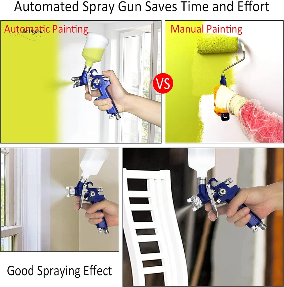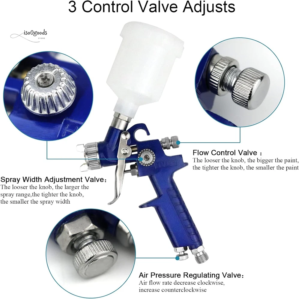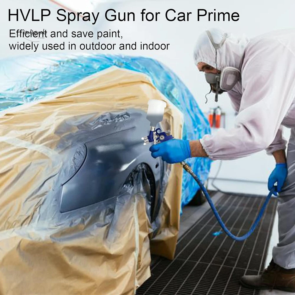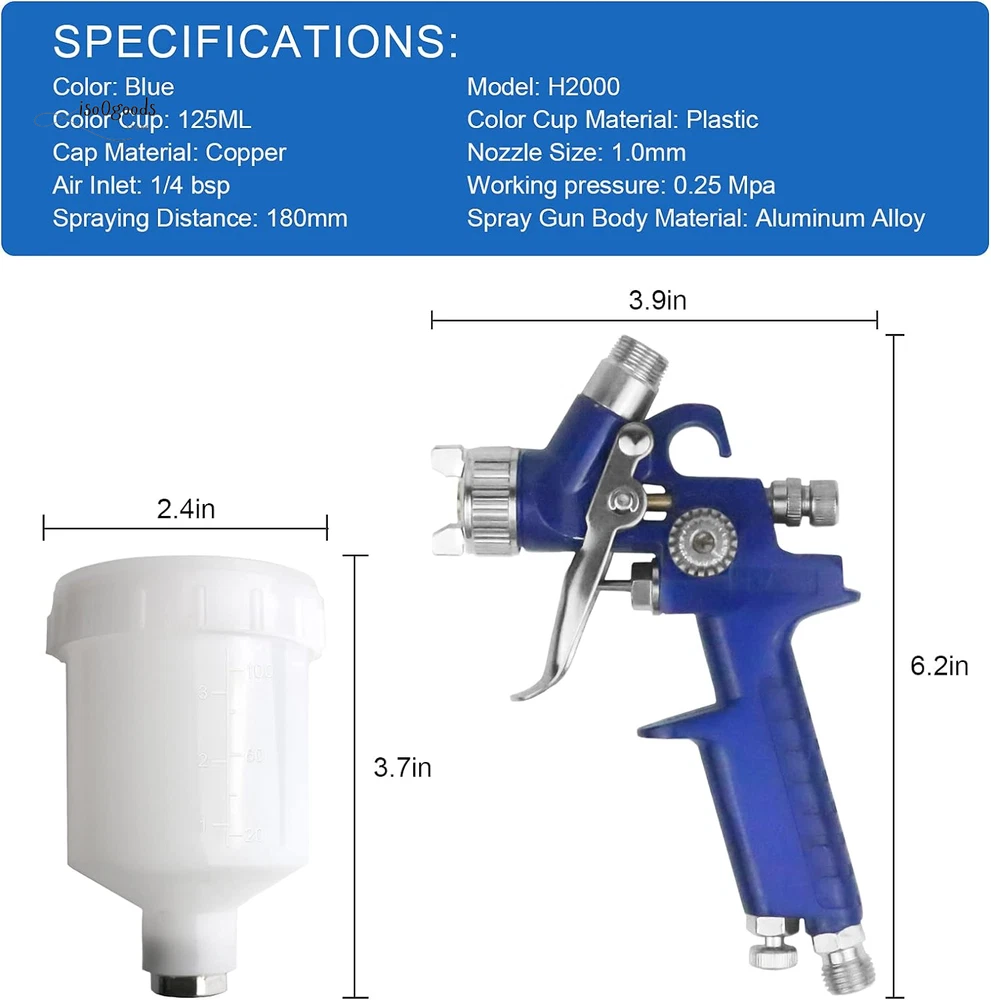 HVLP Car Paint Spray Gun – High-Performance Tool for Precision Painting 【Wide Application for Multiple Projects】 This HVLP spray gun with a 125cc color cup is perfect for a variety of painting tasks, including: Car primer and painting Furniture surface painting Wall painting Art and craft projects Base coating and automotive refinishing Whether you’re a professional or a DIY enthusiast, this versatile tool is designed to meet your needs. 【Cost-Effective Gravity Feed Design】 The gravity feed system minimizes residual material waste, ensuring that every drop of paint is efficiently used. This innovative design helps you save costs and reduce material waste , making it an eco-friendly and budget-friendly choice. 【Complete Accessory Kit for Enhanced Performance】 Durable 125ML PVC Color Cup : Resistant to falls and longer-lasting than standard cups. Integrated Paint Filter : Effectively removes dirt particles to prevent defects in your finish. Cleaning Brush : Makes post-use cleanup easy and keeps your spray gun in top condition. 【User-Friendly Design for All Skill Levels】 Crafted with a lightweight stainless steel needle and nozzle , this spray gun is built for durability and longevity. Its ergonomic design ensures comfortable operation, making it easy to use for beginners and professionals alike . 【3 Adjustable Control Valves for Precision】 Achieve professional results with the spray gun’s three control knobs : Air Pressure Regulator : Adjust air pressure for improved atomization and paint-saving functionality. Paint Flow Valve : Control the paint output with precision to suit your project. Spray Width Adjustment : Customize the spray width for small details or larger surfaces. 【Durable & Lightweight Build】 1.0mm Copper Nozzle : Ensures smooth, even spraying with a 360° rotatable design for flexibility. Aluminum Alloy Spray Gun Body : Offers durability without adding weight, making it easy to handle. 125ml Color Cup : Designed with sturdy plastic for long-term use and fall resistance. 【What’s Included in the Package】 1 x HVLP Spray Gun with 1.0mm Fluid Nozzle 1 x 125ml Plastic Color Cup with Lid 1 x Cleaning Brush 1 x Connector 1 x Nut 1 x User Manual Specifications: Nozzle Size : 1.0mm Color Cup Capacity : 125ML Air Inlet : 1/4 BSP Working Pressure : 0.25 Mpa Material : Aluminum Alloy (Body), Copper (Cap), Plastic (Cup) Color : Blue Key Features: Efficient Gravity Feed System : Saves paint and reduces waste. Ergonomic Trigger Design : Provides a comfortable grip for long use. Easy-to-Clean Components : Comes with a cleaning brush for hassle-free maintenance. Quick Connector Installation : Includes a detailed guide for easy setup. Perfect for Professionals and Hobbyists Whether you’re working on automotive paint jobs , furniture refinishing , or DIY art projects , this HVLP spray gun delivers precise, professional-quality results every time. Upgrade your painting tools with this high-performance spray gun and bring your projects to life with ease! Order now to experience effortless and efficient painting.