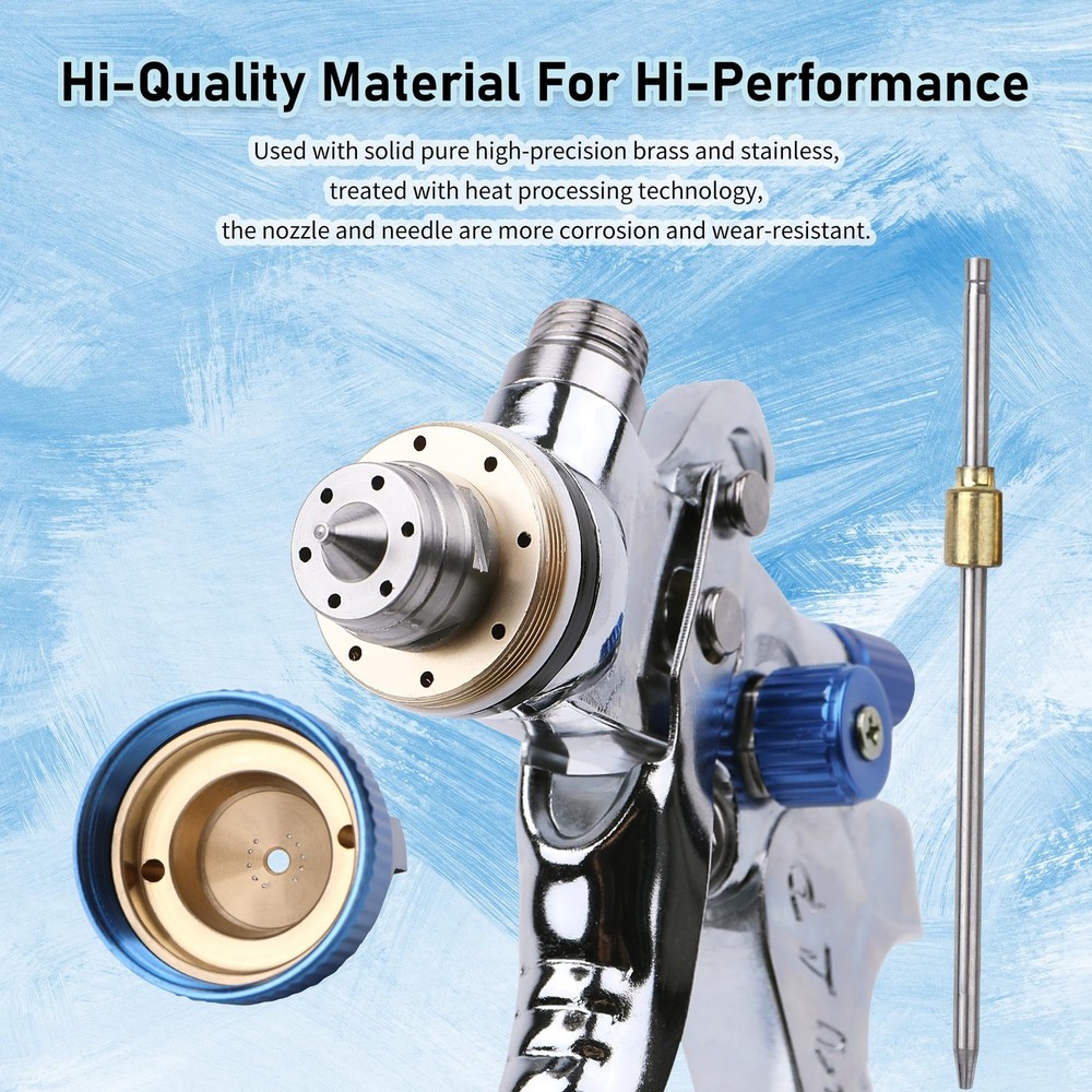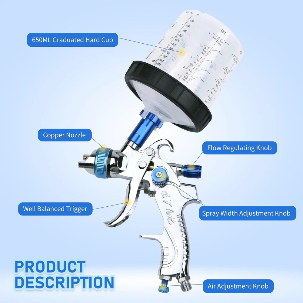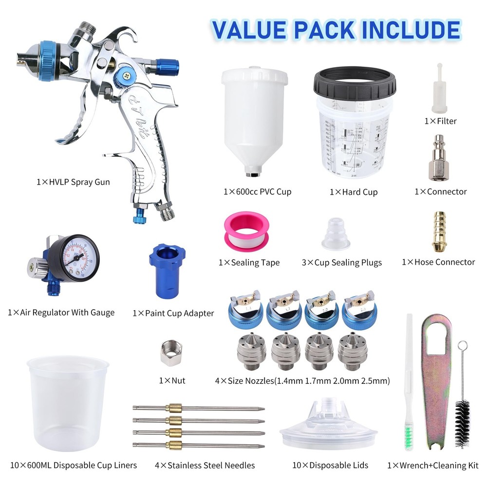 HVLP Spray Gun with 10Pcs 600ML Disposable Paint Cups, Automotive Gravity Feed Spray Gun Kit with 4 Nozzles,1.4/1.7/2.0/2.5mm, Sprayer Gun with Air Compressor Regulator for Auto Paint (Blue) Product Details Brand: Zeinlenx Tank Volume: 600 Cubic Centimeters Color: blue Recommended Uses For Product: Painting Material: Stainless Steel, Brass Brand: Zeinlenx Tank Volume: 600 Cubic Centimeters Color: blue Recommended Uses For Product: Painting Material: Stainless Steel, Brass Product Dimensions: 5.9"W x 7.4"H Power Source: air_powered Included Components: Instruction Guide, Gun Lubricant, Measuring Cap, Nozzle, Viscosity Cup, Nozzle Adapter, Shoulder Strap, Strainer, Replacement Seal, Cleaning Kit Model Name: 2008-4-blue Item Weight: 3.25 pounds Manufacturer: Zeinlenx Country of Origin: China Item model number: 2008-4-blue Our Advantages: This HVLP spray gun kit provides 4 nozzles of 1.4mm 1.7mm 2.0mm and 2.5mm, which can fully meet your various needs. Equipped with high-quality brass air cap, high-grade stainless steel needle, and nozzle, making the painting more smooth and even. Package includes 1600CC pp paint cup and also 1 quick paint mixing cup, more choices for you. 65% High Transfer Efficiency: This body repair paint spray gun features a 15 hole copper atomizer, can save 20% of paint, paint utilization rate up to 65% to reduce pollution. Working pressure 2.5-3.5bar; Air consumption 275L/min; Spraying width 240mm; Pattern range 170-240mm;1/4" NPT inlet and the same size quick adapter. High Quality Material Paint Gun: This car paint sprayer is designed with a one-piece aluminum alloy body, 4 sizes of stainless steel nozzles, and solid brass gun cap, which can withstand heavy use for a long time. Light weight, ergonomic design can reduces operating fatigue. Cost Saving & Package Include: Our automotive spray gun kit comes with 1 air car paint gun, 4 sizes nozzle set, 1 PP paint cup,1 hard cup with 1 retainer ring,10 disposable cups liners and 10 lids, 1 pressure gauge, 1 brush, 1 wrench and 1 sealing tape. Using the disposable cup system will reduce the waste of paint material also saved time for cleaning the cup. Wide Application: This auto paint spray gun is ideal for spraying, base coat, clear coat, and other coatings. Very suitable for primer, painting cars, furniture repair, industry, and other paint applications. Easy to use for beginners and professionals.