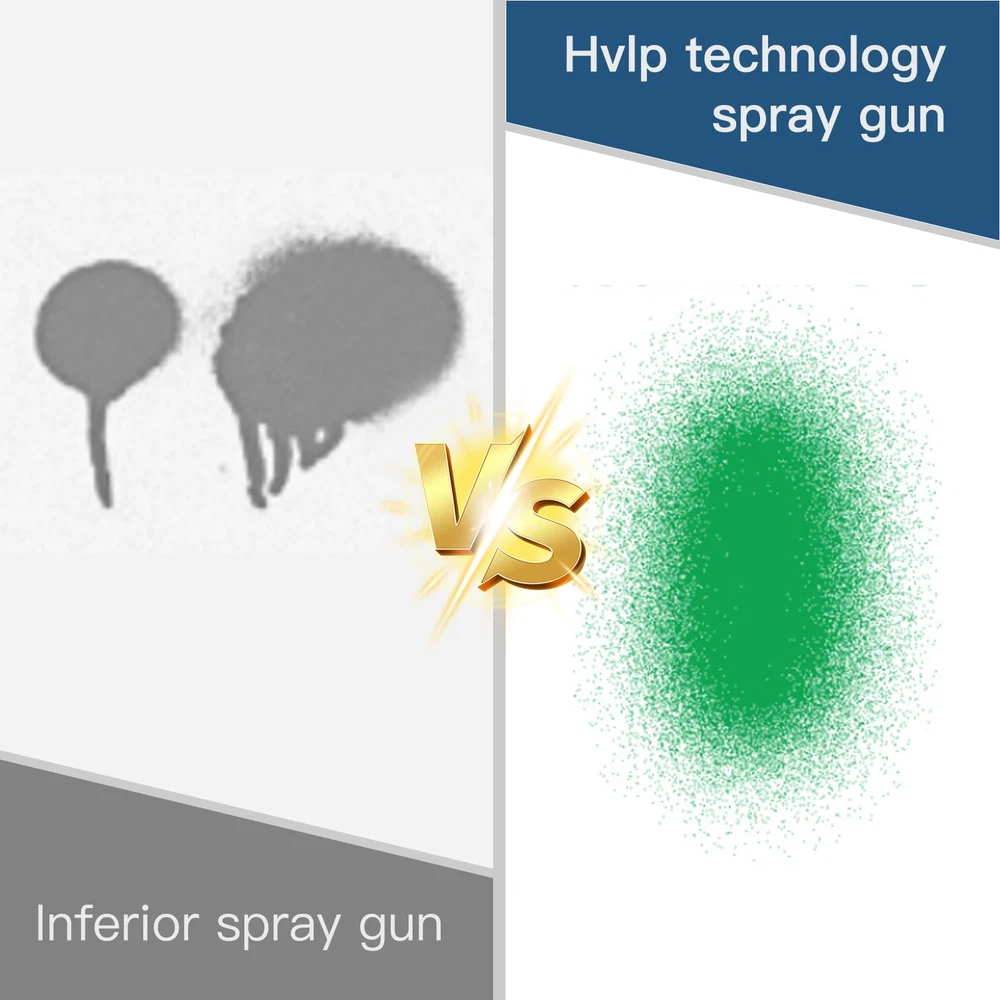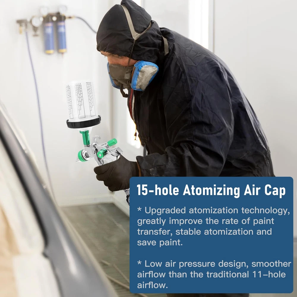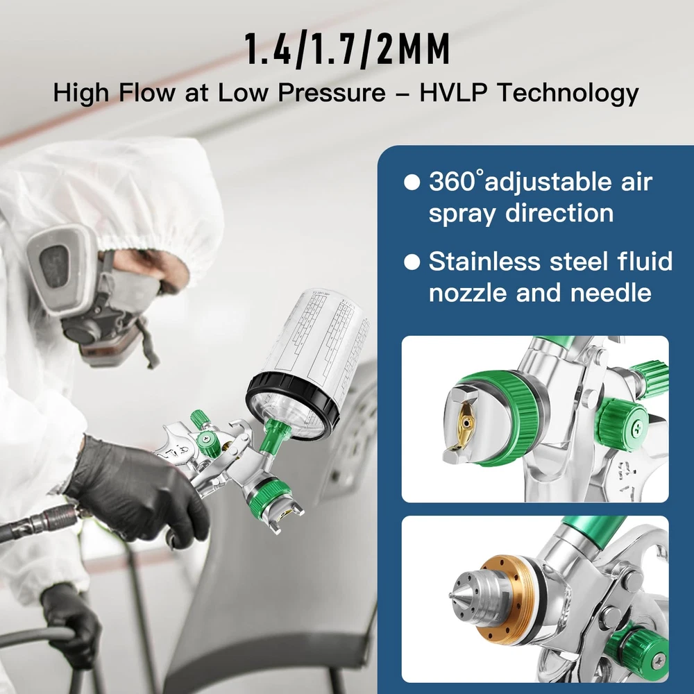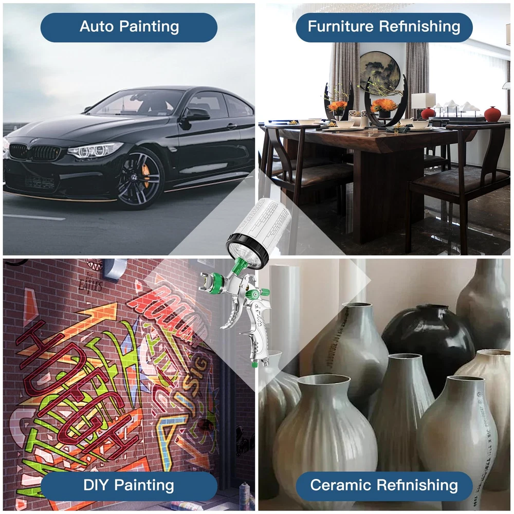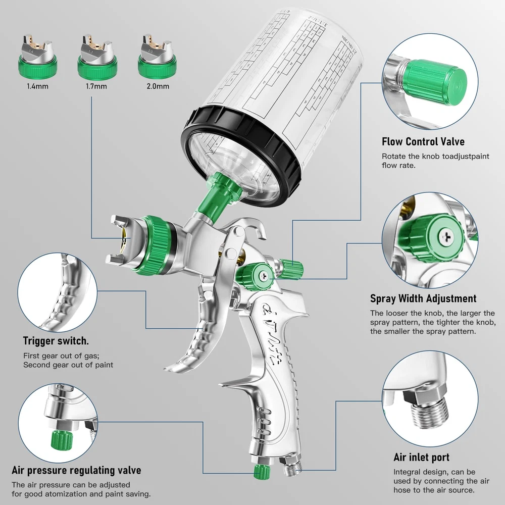 【Professional Spray Gun】: Spraying distance: 160-240 mm; Working pressure: 2.5-3.0 bar; Air consumption: 260 L/min; Paint capacity: 600cc; Spraying width: 300mm. Our HVLP spray gun saves up to 20% of the paint, with an optimal paint utilization rate of 65%-80%. G1/4 air inlet and quick adapter of the same size. 【3 Adjustable Nozzles】: The spray paint gun comes with three different nozzle sizes (1.4 mm, 1.7 mm, 2.0 mm). Note: The 1.4 mm nozzle is already installed in paint gun. 1.4 mm nozzle is suitable for topcoats, 1.7 mm nozzle for primers and 2.0 mm nozzle is more suitable for spraying large areas. 【Fast Atomization】: The hvlp paint sprayer is equipped with a brass diverter valve and a 15-hole hood that is precision machined for high atomization. The spray gun can be adjusted in terms of spray volume and spray range to achieve faster atomization than traditional LVLP spray guns. 【50 Replacement Cups】: The package of the spray gun includes 1* automotive paint gun, 3 types of nozzles, 1* spray can, 50* disposable cups (600cc), 1* brush, 1* wrench, 2* green adapter. More replacement cups can reduce the time and cost of cleaning the spray can after each spraying, thus saving you money. 【Wide Range of Applications】: The mini paint gun makes spraying softer, easier to control and reduces overspray. Ideal for spraying primers, clear coats and other high-viscosity paints, as well as basecoats, topcoats and detail paints for the automotive and furniture industries. 【Exclusive Customer Service】: We strictly control the production process and do our best to provide high quality paint sprayer gun with 365 days warranty. If you have any questions, you can contact our reliable service staff to help you solve them within 24 hours.
