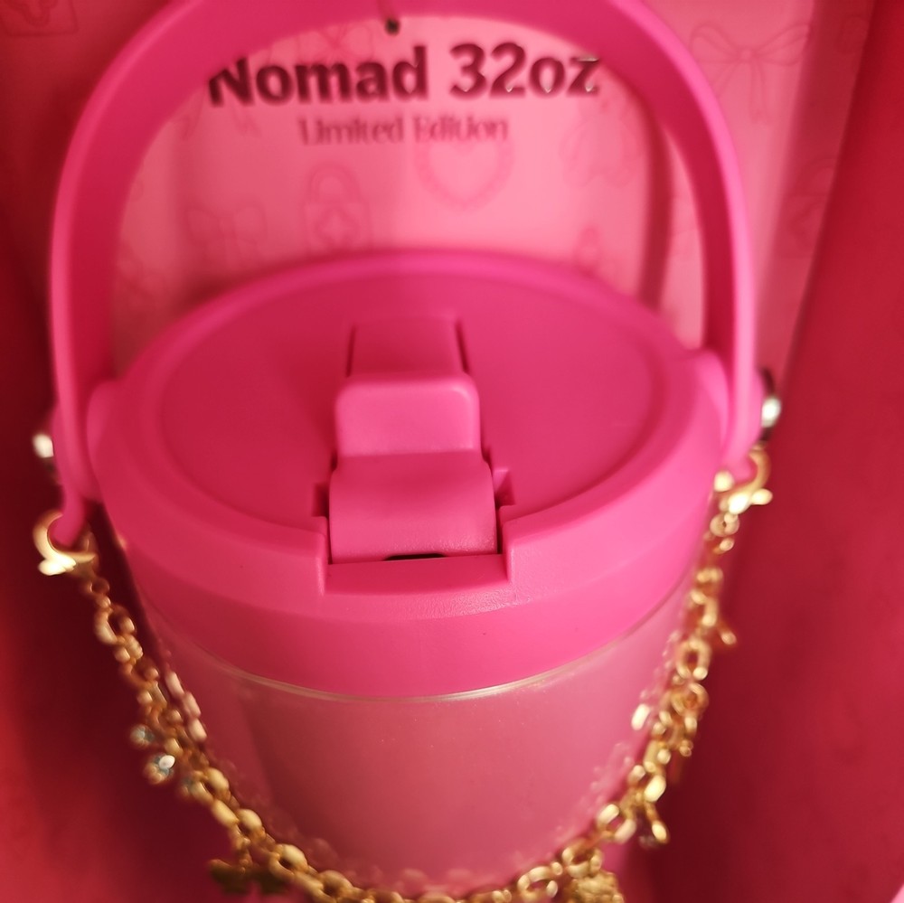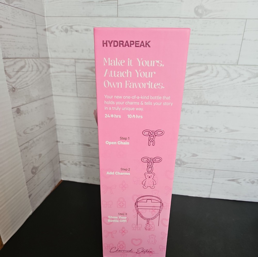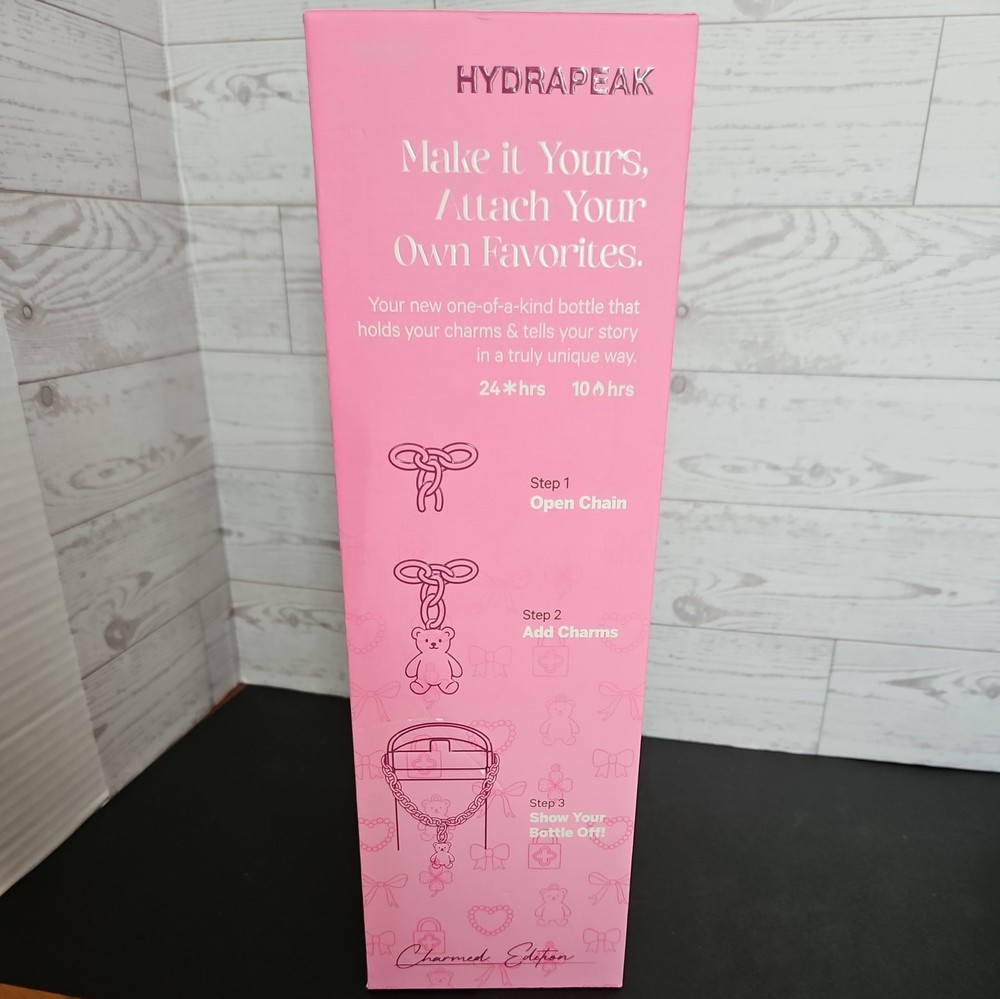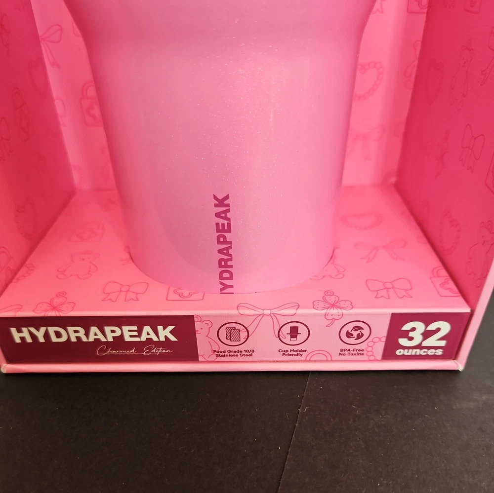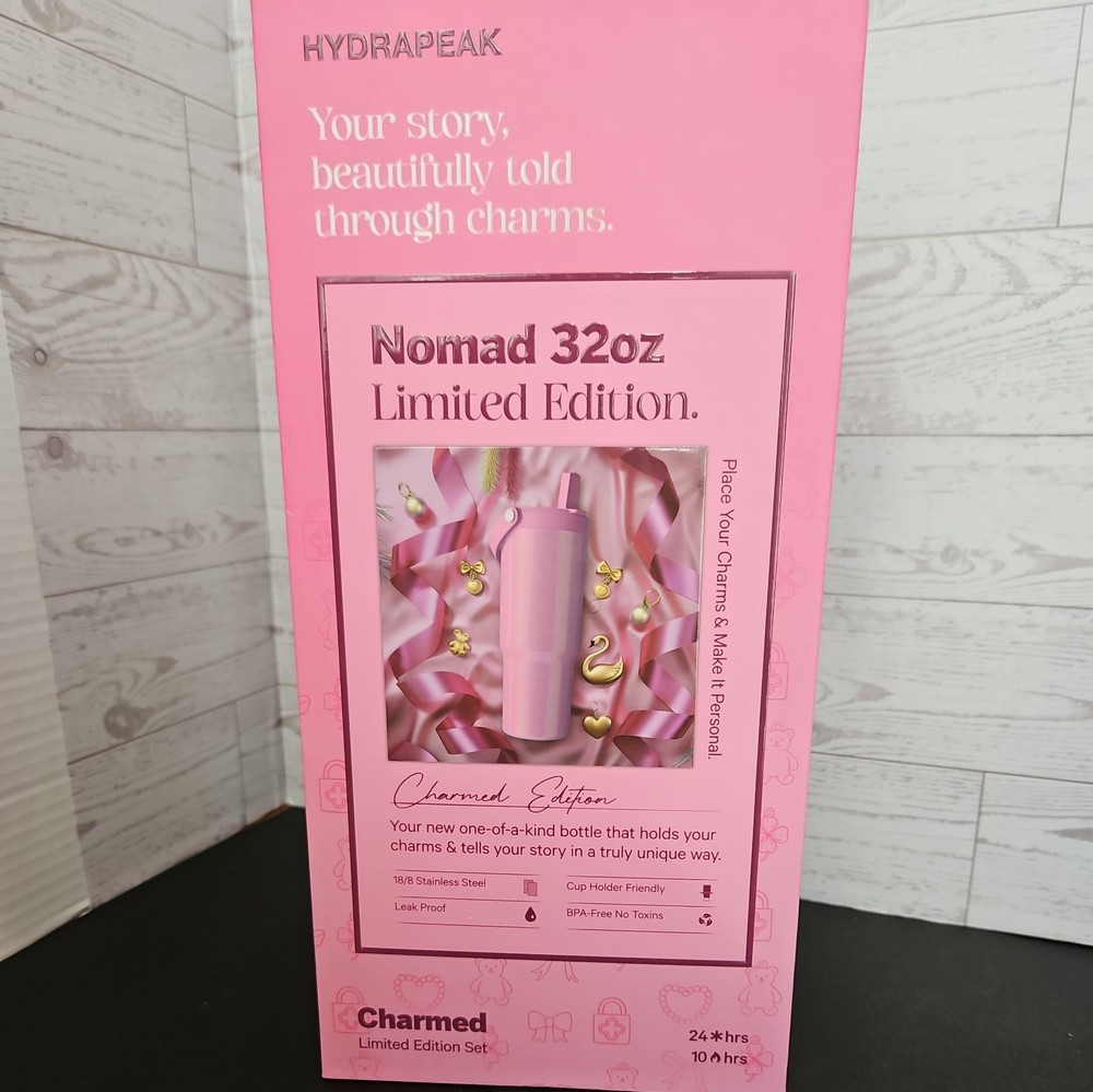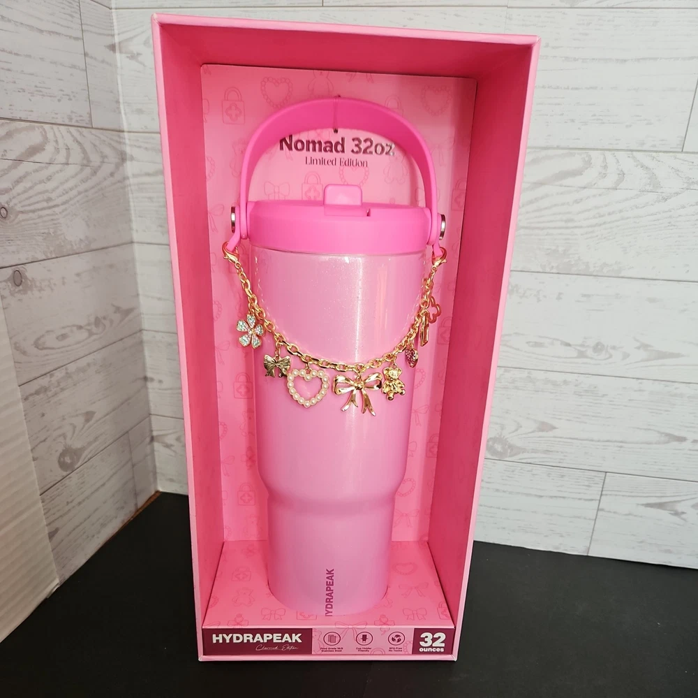 New in box The HYDRAPEAK Nomad 32 oz Charmed Edition Pink Heart Teddy Bear Bow Charm Bracelet is a limited edition water bottle featuring a charming pink color and adorable heart and teddy bear design. Made from steel and BPA-free plastic, this tumbler can keep drinks cold for 24 hours and hot for 10 hours. It includes a spill-proof lid and comes with a presentation box, making it a perfect gift for teens, kids, and adults alike. With a straight shape and double-walled insulation, this water bottle is designed for all occasions and is sure to stand out with its unique design.