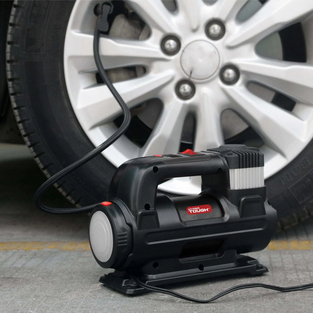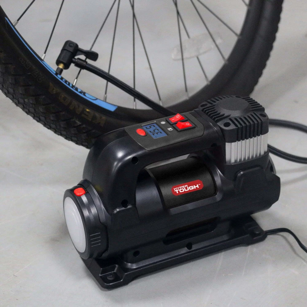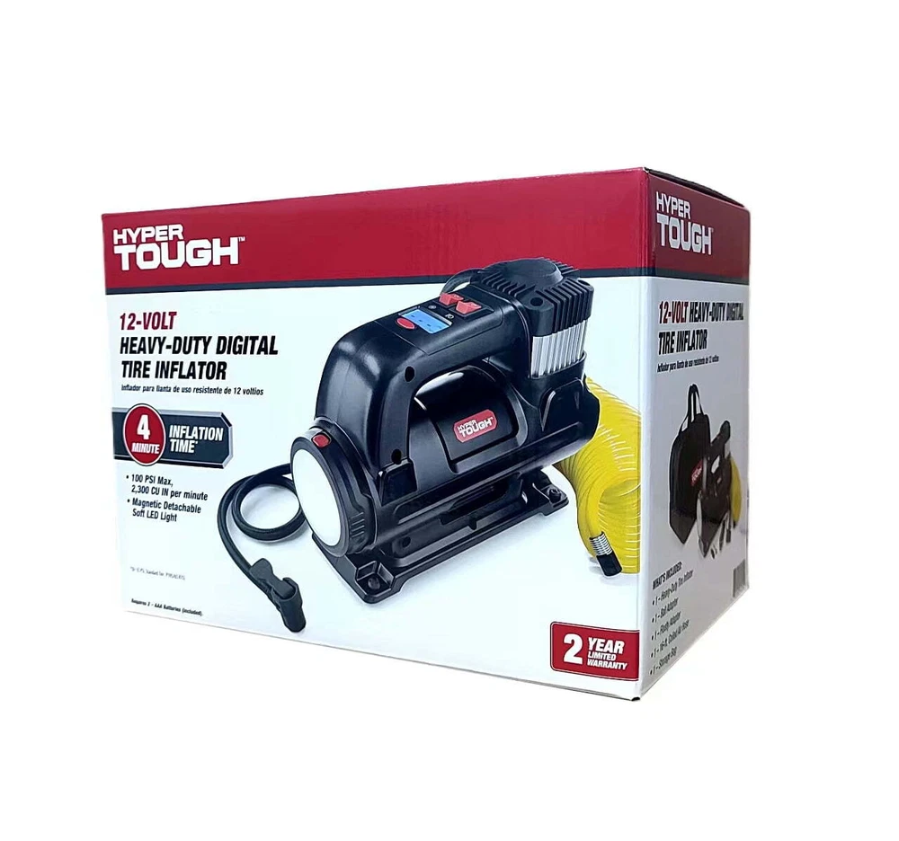 Hyper Tough DC 12V Heavy Duty Direct Drive Digital Tire Inflator. 1. Quick Inflation Time : Inflate195/65R 15" car tire from 0 to 35ps≤4'. 2. Magnetic Detachable Soft LED light: For nighttime emergencies and emergency road repair. 3.Easy to use: Just plug the car tire inflator to the 12V cigarette lighter socket and its powered by the vehicle. 4. LCD Digital Display with backlight -The inflator for car tires features a LCD digital display, ideal for when working in the dark. 5. Units available: PSI, KPA, BAR, the max working pressure is 100PSI. 6. Multiple Uses-The inflator comes with a 10ft power cord and 2 extra nozzles, which makes it perfect for cars, motorcycles, bicycles, sports balls, air mattress, water toys. 7. Portable-The car tire inflator comes with a compact design, you can put it in your automobile, easy to carry around, use it anytime anywhere. 8. Extra Coil Hose - Yellow coil air hose 490cm in length with twist disconnect. 9. Direct Drive Motor - Powerful direct drive motor (air cooled).10. Included Carring Bag - Good for Storage. On Dec 9, 2024 at 07:14:26 PST, seller added the following information:
