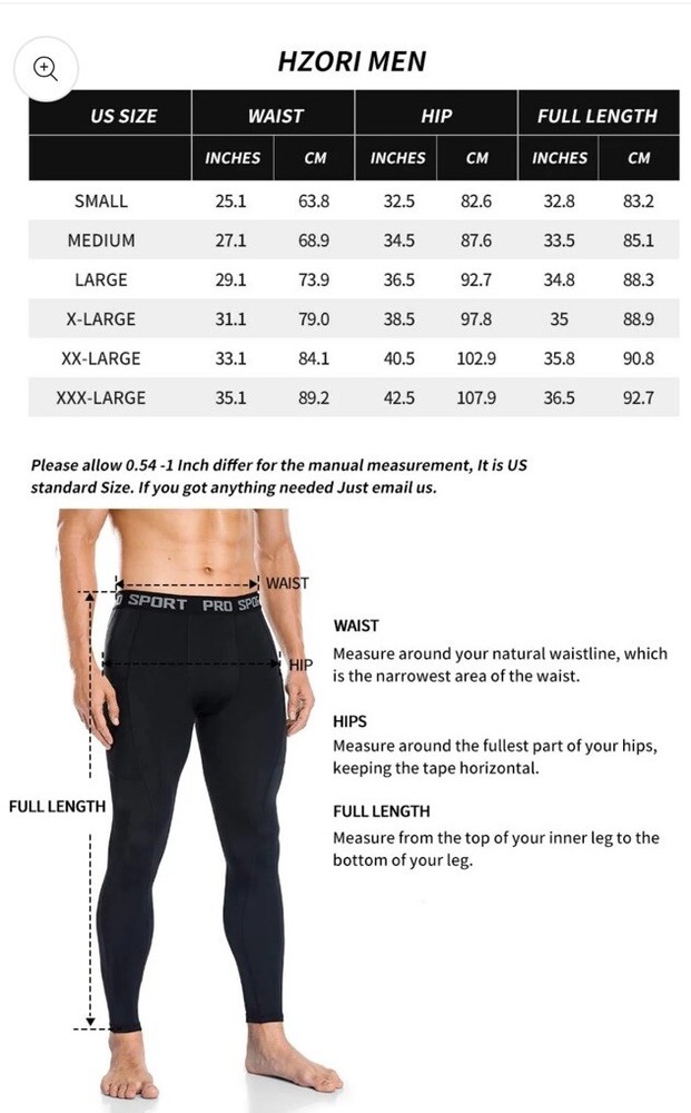 For men’s size L: • Waist: 29.1 inches • Hip: 36.5 inches • Full Length: 34.8 inches DESCRIPTION&DETAILS: -These fitted running tights are made for road warriors who don't let the environment dictate their workouts. -These leggings have targeted areas on the quads and calves specifically meant to reduce muscle fatigue. -If you’re into a more minimal aesthetic, then start dominating your every lift in these sharp-looking HZORI leggings. -Compression garments (including pants, socks, shirts, and shorts) are intended to improve circulation during periods of sustained physical activity.