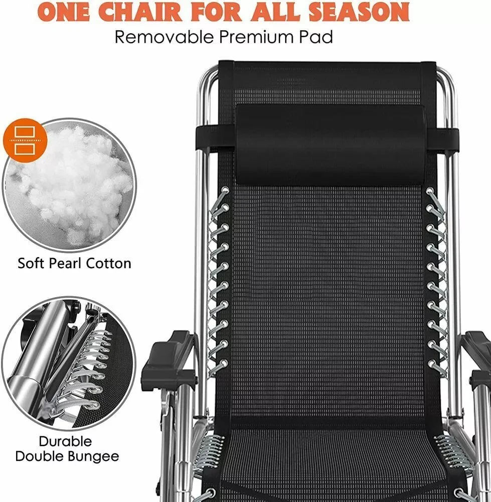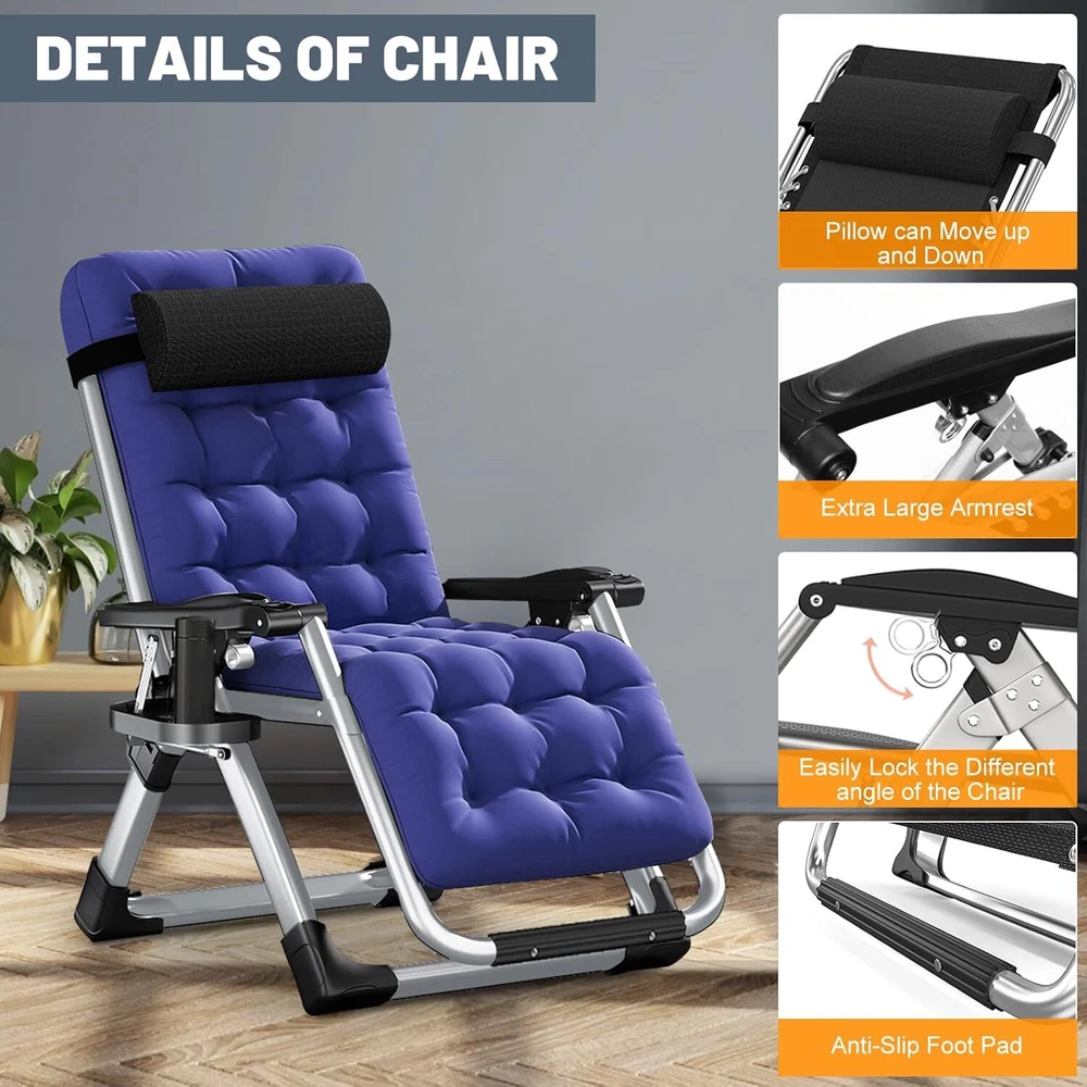Sturdy Frame - The folding chair is built with premium quality materials, which provide increased durability and resistance. The living room chairs can take over 440 pounds of weight and it is extra sturdy and will last you a lifetime. Removable Soft Pad - Intuitive design features that this recliner chair can be used by anybody. The pad is soft and removable which is more comfortable and warm when sitting. You can remove the soft cushion from the folding lounge chair to promote better airflow during hot summer days. Adjustable Foldable Chair - The reclining chair uses a triangle locking system to lock the chair in different positions, this amazing feature helps you select the optimal angle that brings you to a comfortable, relaxing position. Easy to Use - This lounge chair is very easy to assemble. No tools needed! Just open the box and take out of the chair and unfold it, then you can use it. It'll only take you a few seconds. The foldable design makes it easy to carry. Wide Application - Perfect chairs for indoor and outdoor use. Whether relaxing by reading a book or take a break, this comfortable folding chair is the best choice. It can be used indoors, living room and office, for outdoor activities, such as camping, beach, patio, pool, lawn, garden, deck, balcony. Package include: 1 Pack 90º to 170º adjustable chair 1 Pack Headrest 1 Pack Removal Cushion ☁ Feature: 1. Multi‑angle adjustable and ergonomic design. Satisfy your comfortable experience. 2. Using thick composite high‑strength Oxford cloth, safe and breathable, dirt‑resistant. 3. Reinforced fastener, sturdy steel pipe structure, more durable ad comfortable. 4. Safety non‑slip foot pads are used at the bottom to prevent rollover when turning over. 5. Light weight and folding design for easy storage, transport and perfect of summer. ☁ Specification: ▶ Item Type: Folding Chair ▶ Material: Steel Pipe + Oxford Cloth ▶ Color: Gray ▶ Size: Approx.45X26X28inch ▶ Weight: Approx.18.7lbs ▶ Adjustment Angle: 90°-170° ▶ Bearing Weight: 440lbs ▶ Mattress Color:Blue ▶ Mattress Material:Pearl Cotton Mattress & Gray short fleece