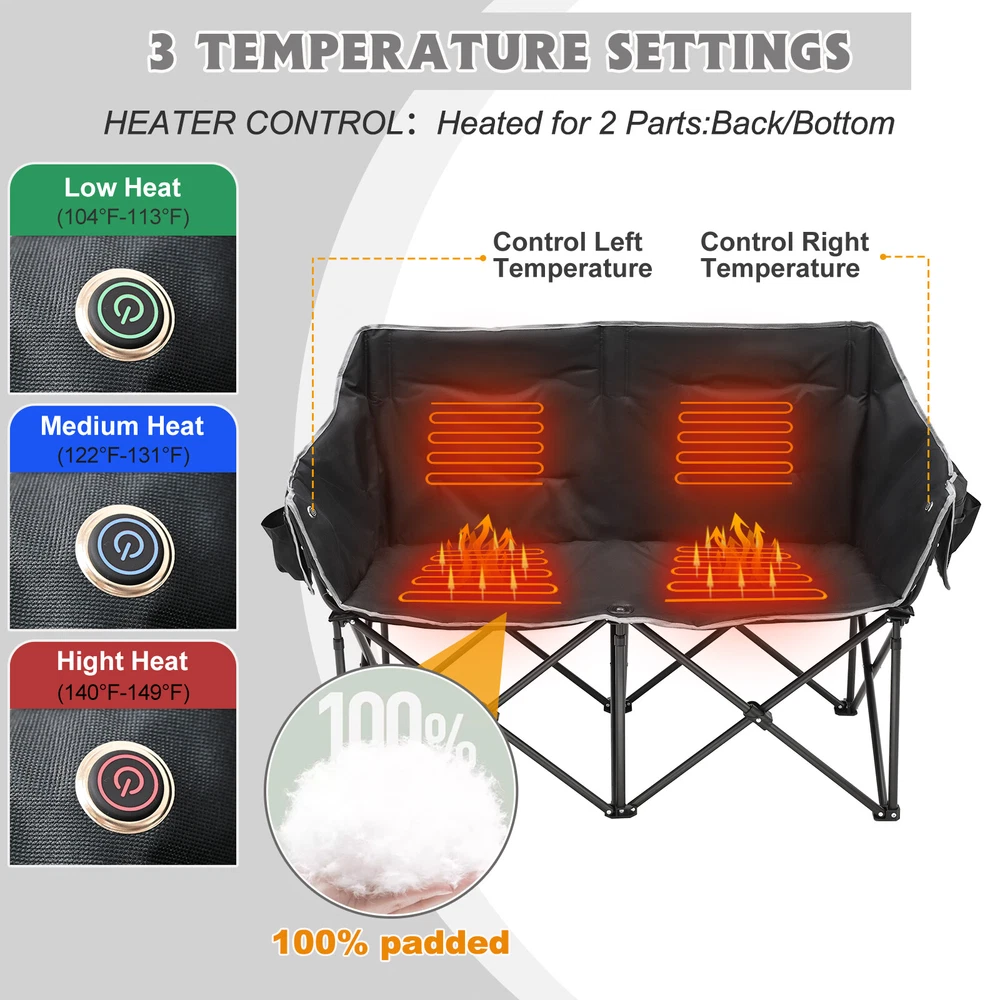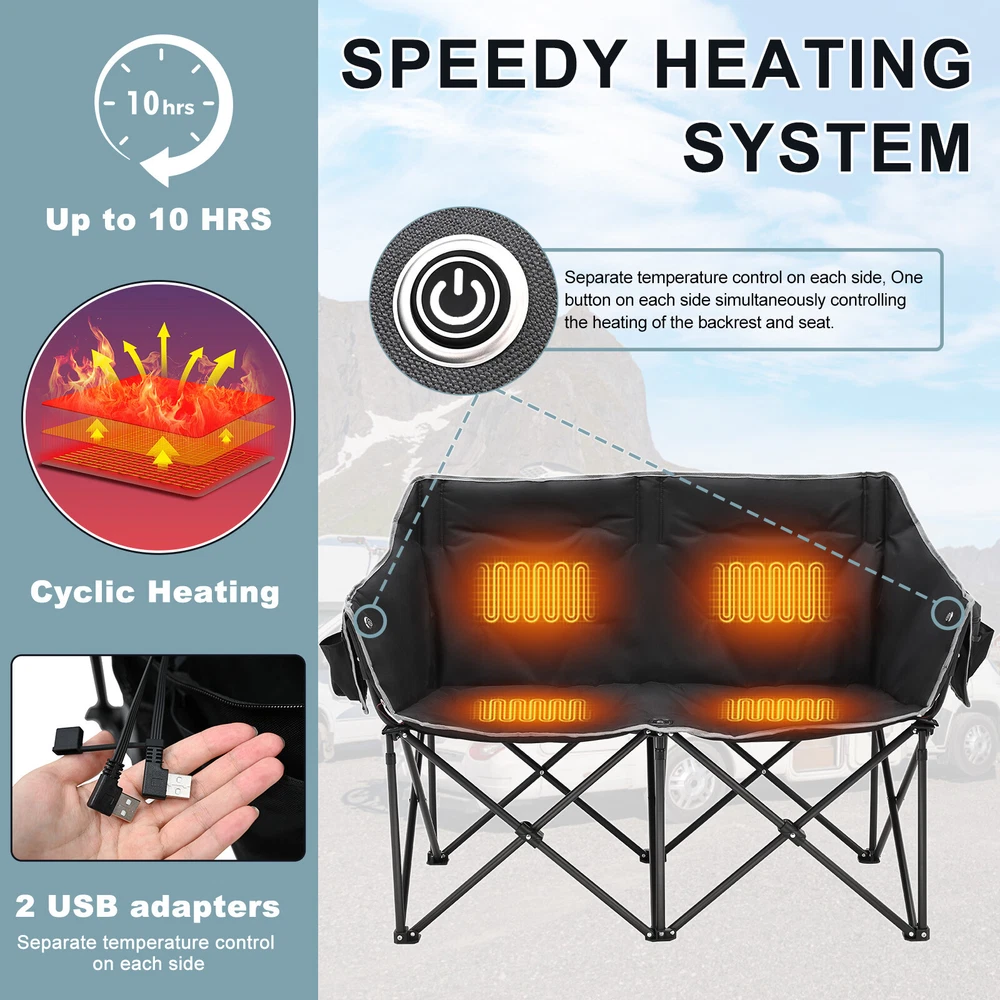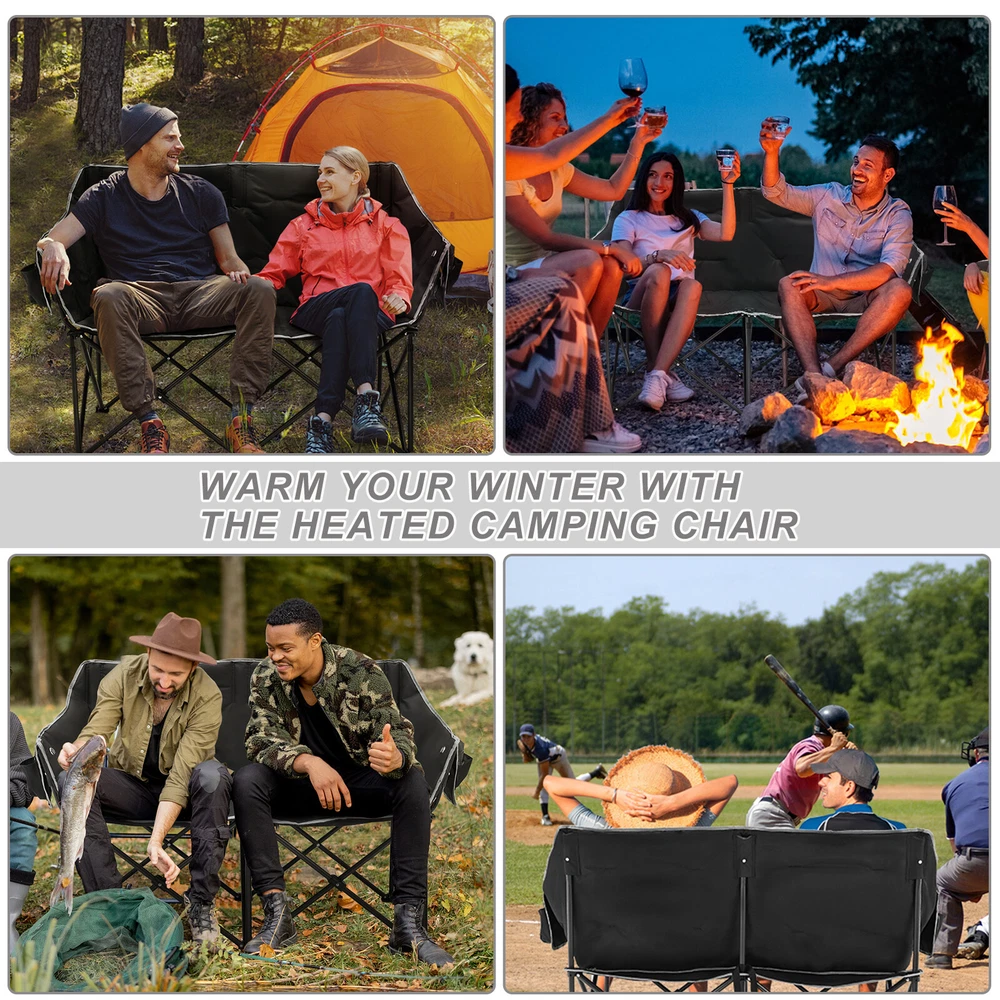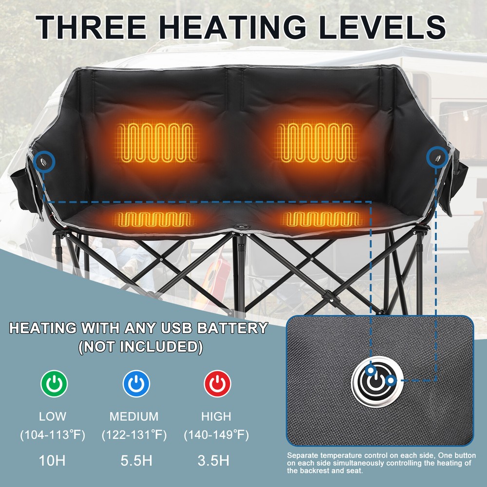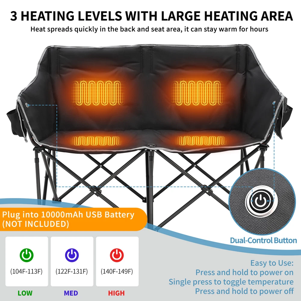 Our Store heated double outdoor chair features 4 heating zones and 3 adjustable heating levels with USB-powered heating technology (Output: 5V/2A, battery is included ). Long Press The Button to Control on/off, and short press the button can easily adjust 3 heating levels for back and seat ( 122°F/ 113°F/ 104°F ). Keeping you warm and safe for cold baseball football games, or other outdoor activities. Durable oxford fabric make the chair extra sturdy. Stable steel frame construction make it can support up to 550 lbs. Enough load-bearing capacity for two adults to sit down at the same time, and enjoy the warmth together brought by this heated outdoor chair. You can easily fold and open it in a minute. We will provide a closing strap and a beautifully carry bag with carrying strap, you can put it on the car or carrying it on your shoulder to outside, this heated portable chairs for adults will provide you with a relaxing and pleasant outdoor experience. 【 4 Heating Zones 】Our Store heated double outdoor chair features 4 heating zones, Separate temperature control on each side. One button on each side simultaneously controlling the heating of the backrest and seat. Provides the ultimate warmth and comfort for your body in cold weather, keeping you warm and comfortable at any outdoor sports, beach, lawn, picnic activities. 【 3 Levels of Temperature 】Designed with 3 heat settings (green for low, blue for medium, and red for high). A simple push of the button can warm up your seat. Works with any USB battery pack ( Battery is Included) and lasts for hours. Simply plug the USB cable into the USB Port of your battery and warming up your portable camp chair. The chair needs to be kept plugged in during working. 【 High Durability & Stabilit y】Foldable Hard Alloy steel frame with coating prevent corrosion and fading. Durable oxford fabric make the chair extra sturdy. Stable steel frame construction make it can support up to 550 lbs . Enough load-bearing capacity for two adults to sit down at the same time, and enjoy the warmth together brought by this heated outdoor chair. 【 Portable and Foldable 】No worry about assembly and carrying, you can easily fold and open it in a minute. We will provide a closing strap and a beautifully carry bag with carrying strap, you can put it on the car or carrying it on your shoulder to outside, this heated portable chairs for adults will provide you with a relaxing and pleasant outdoor experience. 【 High Quality After-sale Service 】Our Store is committed to providing customers with the best shopping experience and high-quality after-sales service. If you have any questions, please do not hesitate to contact us immediately, and we will answer your questions within 24 hours. Friendly customer service is always there for you. And We guarantee 12-month warranty. Come and have a try ! user's manual
