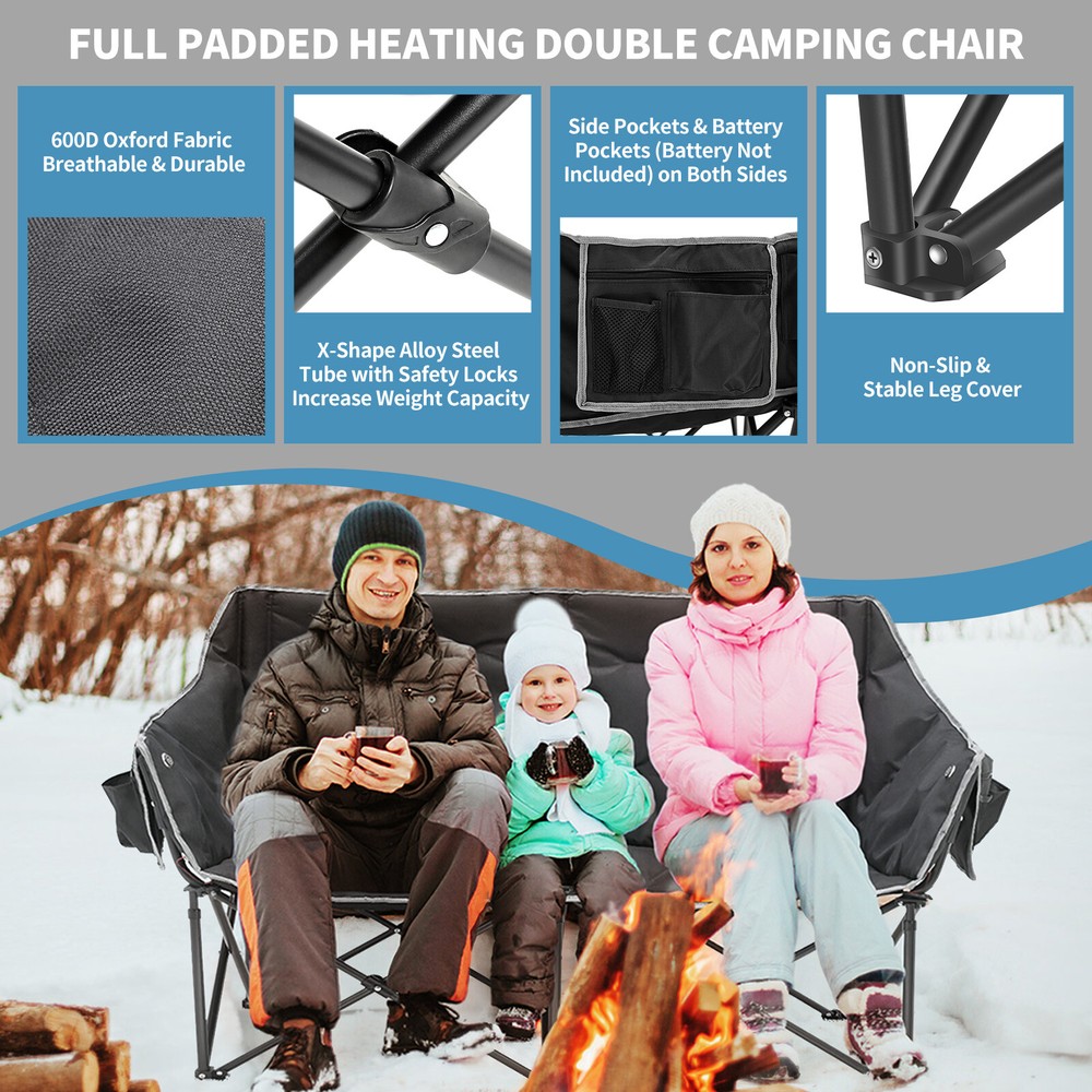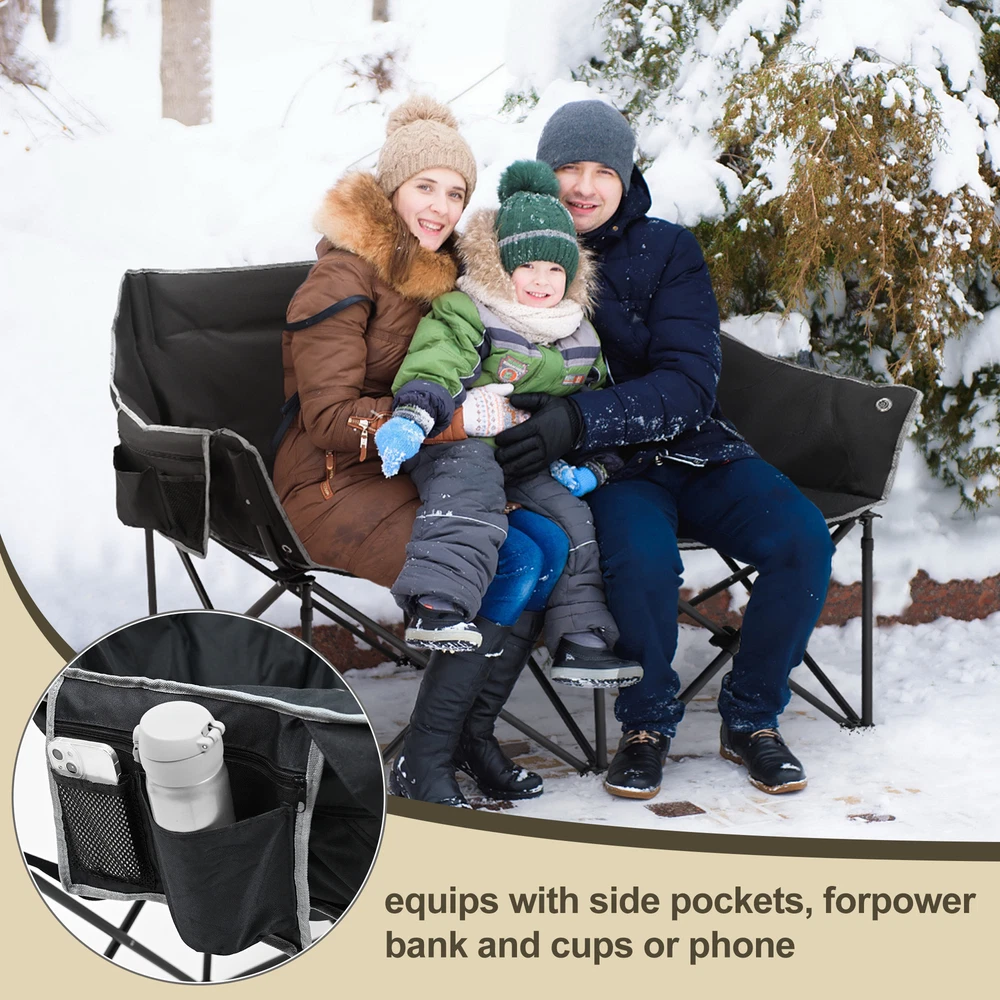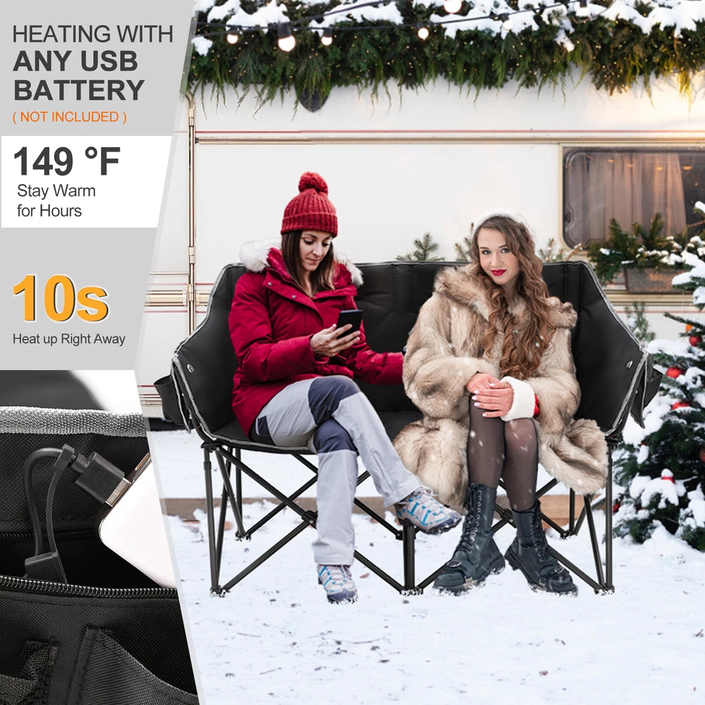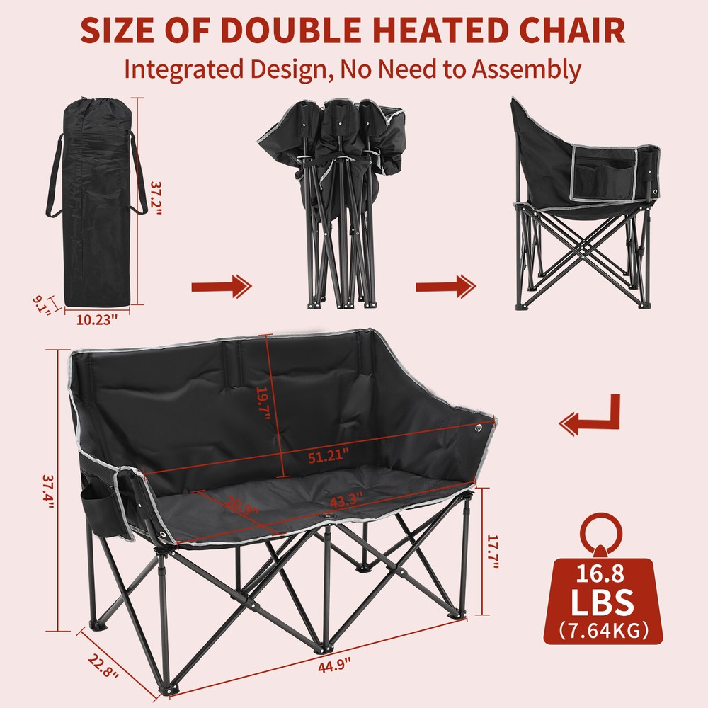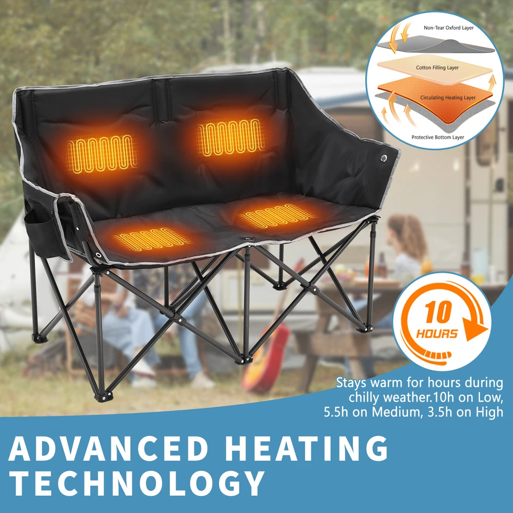 Our Store heated double outdoor chair features 4 heating zones and 3 adjustable heating levels with USB-powered heating technology (Output: 5V/2A, battery is included ). Long Press The Button to Control on/off, and short press the button can easily adjust 3 heating levels for back and seat ( 122°F/ 113°F/ 104°F ). Keeping you warm and safe for cold baseball football games, or other outdoor activities. Durable oxford fabric make the chair extra sturdy. Stable steel frame construction make it can support up to 550 lbs. Enough load-bearing capacity for two adults to sit down at the same time, and enjoy the warmth together brought by this heated outdoor chair. You can easily fold and open it in a minute. We will provide a closing strap and a beautifully carry bag with carrying strap, you can put it on the car or carrying it on your shoulder to outside, this heated portable chairs for adults will provide you with a relaxing and pleasant outdoor experience. 【 4 Heating Zones 】Our Store heated double outdoor chair features 4 heating zones, Separate temperature control on each side. One button on each side simultaneously controlling the heating of the backrest and seat. Provides the ultimate warmth and comfort for your body in cold weather, keeping you warm and comfortable at any outdoor sports, beach, lawn, picnic activities. 【 3 Levels of Temperature 】Designed with 3 heat settings (green for low, blue for medium, and red for high). A simple push of the button can warm up your seat. Works with any USB battery pack ( Battery is Included) and lasts for hours. Simply plug the USB cable into the USB Port of your battery and warming up your portable camp chair. The chair needs to be kept plugged in during working. 【 High Durability & Stabilit y】Foldable Hard Alloy steel frame with coating prevent corrosion and fading. Durable oxford fabric make the chair extra sturdy. Stable steel frame construction make it can support up to 550 lbs . Enough load-bearing capacity for two adults to sit down at the same time, and enjoy the warmth together brought by this heated outdoor chair. 【 Portable and Foldable 】No worry about assembly and carrying, you can easily fold and open it in a minute. We will provide a closing strap and a beautifully carry bag with carrying strap, you can put it on the car or carrying it on your shoulder to outside, this heated portable chairs for adults will provide you with a relaxing and pleasant outdoor experience. 【 High Quality After-sale Service 】Our Store is committed to providing customers with the best shopping experience and high-quality after-sales service. If you have any questions, please do not hesitate to contact us immediately, and we will answer your questions within 24 hours. Friendly customer service is always there for you. And We guarantee 12-month warranty. Come and have a try ! user's manual