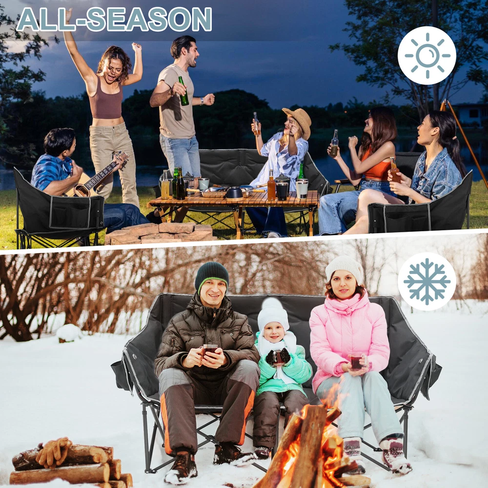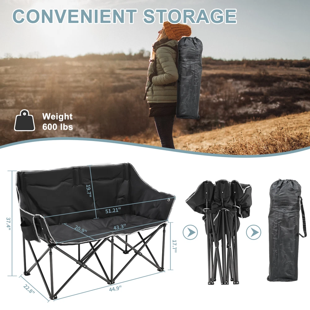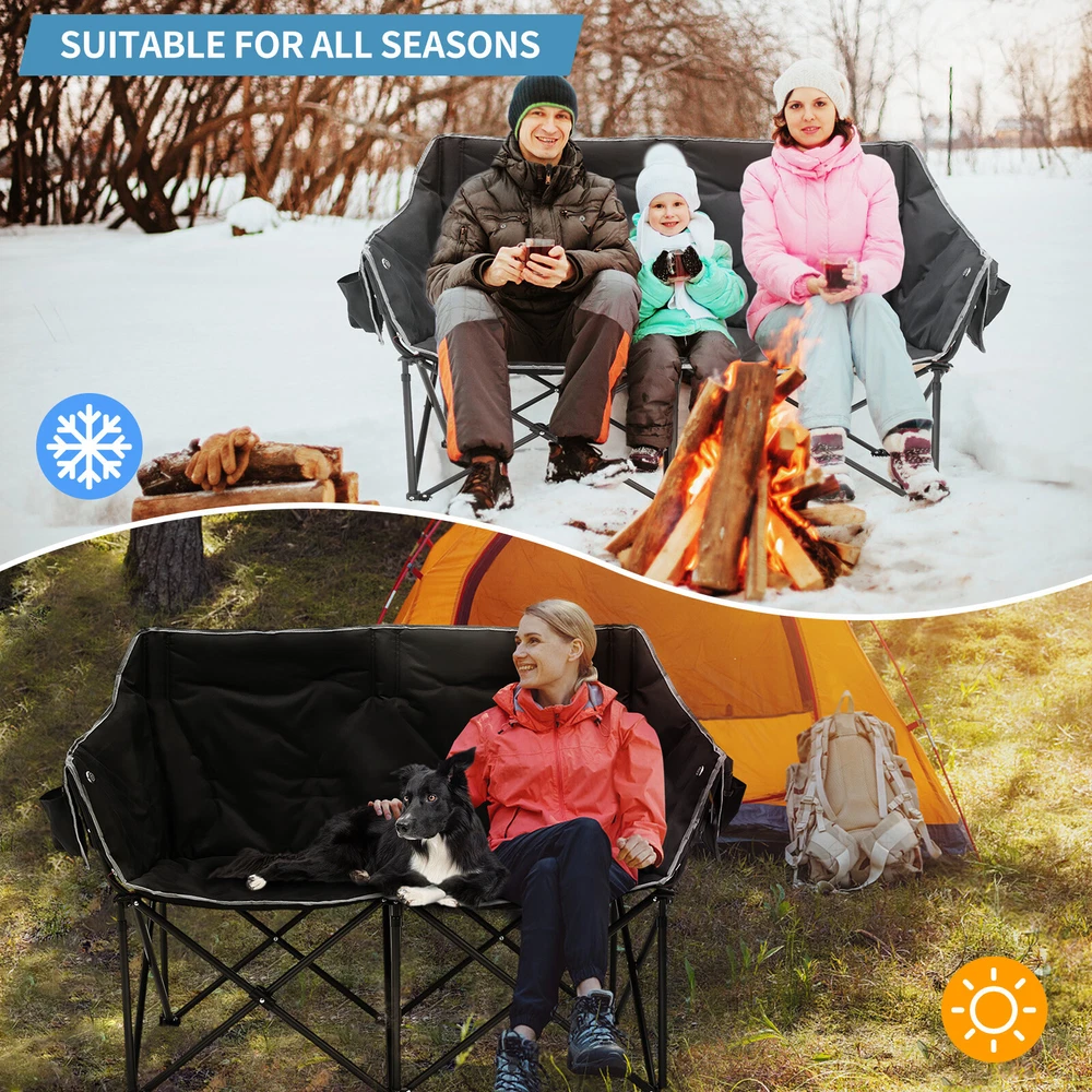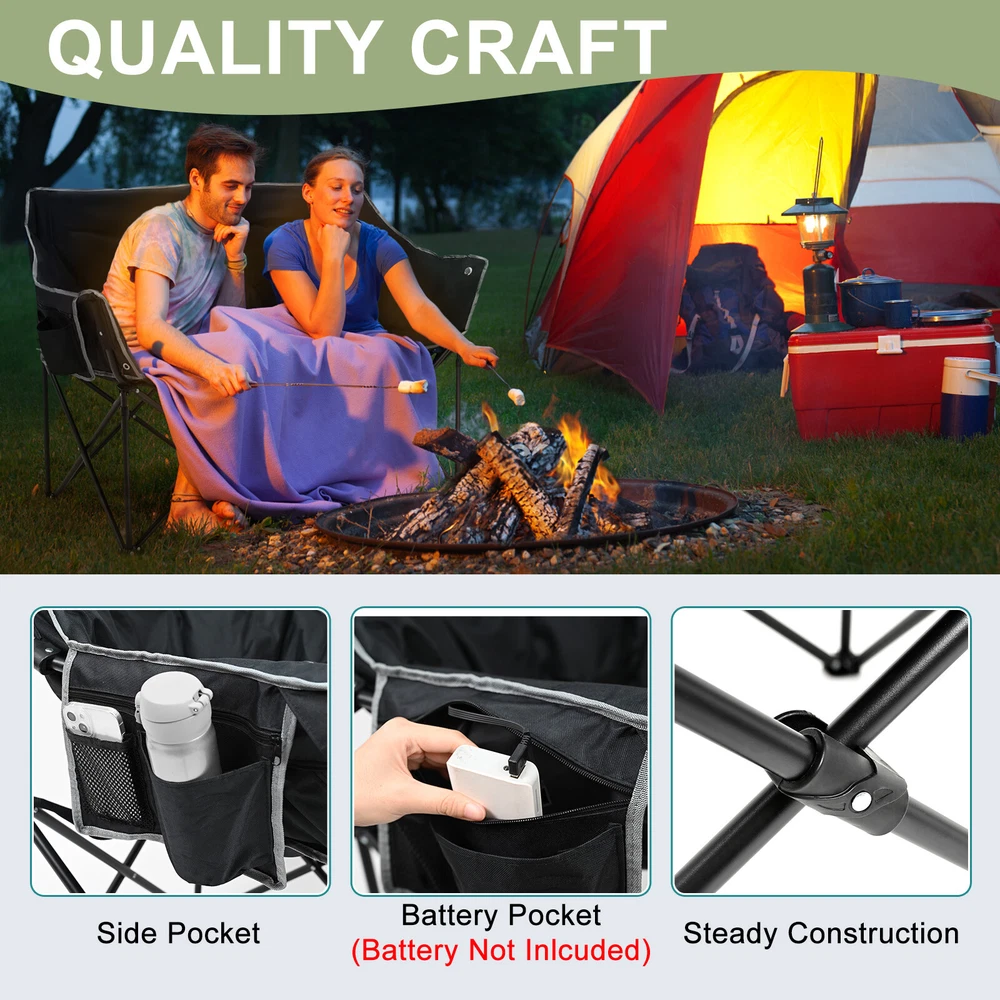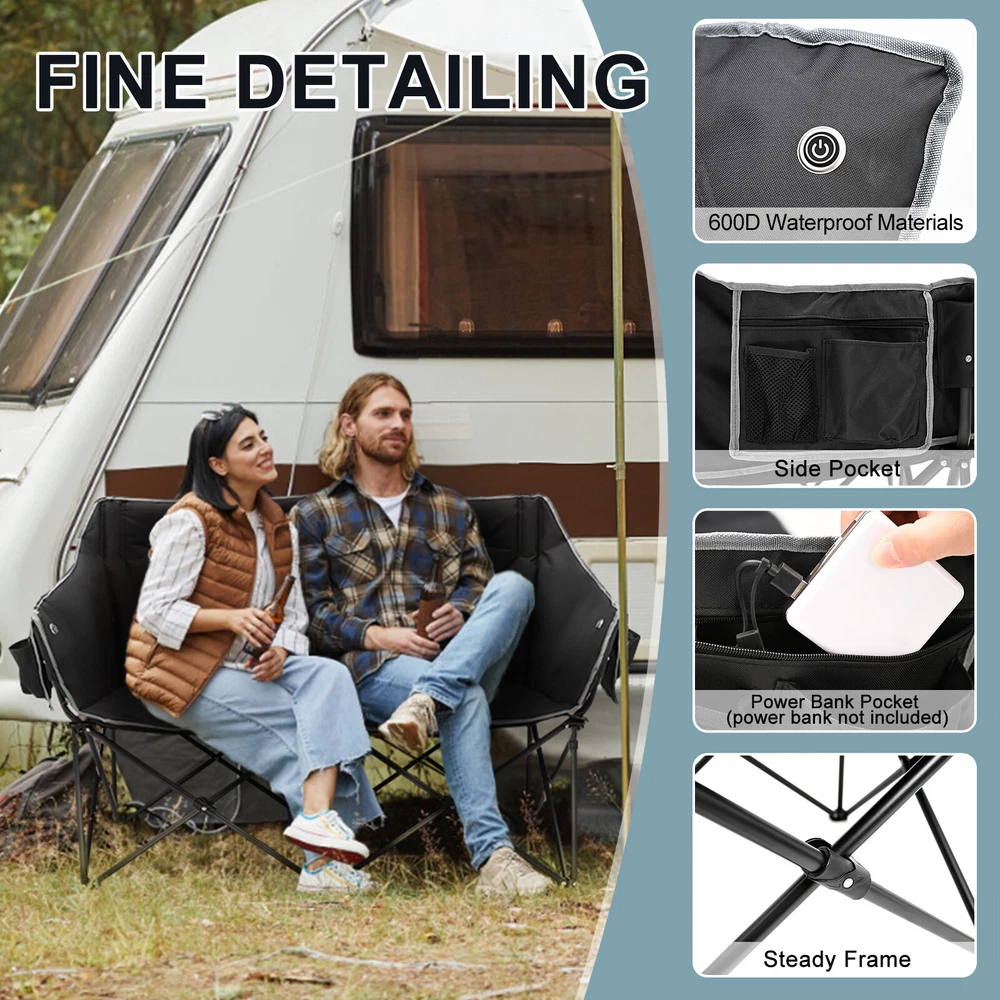 Our Store heated double outdoor chair features 4 heating zones and 3 adjustable heating levels with USB-powered heating technology (Output: 5V/2A, battery is included ). Long Press The Button to Control on/off, and short press the button can easily adjust 3 heating levels for back and seat ( 122°F/ 113°F/ 104°F ). Keeping you warm and safe for cold baseball football games, or other outdoor activities. Durable oxford fabric make the chair extra sturdy. Stable steel frame construction make it can support up to 550 lbs. Enough load-bearing capacity for two adults to sit down at the same time, and enjoy the warmth together brought by this heated outdoor chair. You can easily fold and open it in a minute. We will provide a closing strap and a beautifully carry bag with carrying strap, you can put it on the car or carrying it on your shoulder to outside, this heated portable chairs for adults will provide you with a relaxing and pleasant outdoor experience. 【 4 Heating Zones 】Our Store heated double outdoor chair features 4 heating zones, Separate temperature control on each side. One button on each side simultaneously controlling the heating of the backrest and seat. Provides the ultimate warmth and comfort for your body in cold weather, keeping you warm and comfortable at any outdoor sports, beach, lawn, picnic activities. 【 3 Levels of Temperature 】Designed with 3 heat settings (green for low, blue for medium, and red for high). A simple push of the button can warm up your seat. Works with any USB battery pack ( Battery is Included) and lasts for hours. Simply plug the USB cable into the USB Port of your battery and warming up your portable camp chair. The chair needs to be kept plugged in during working. 【 High Durability & Stabilit y】Foldable Hard Alloy steel frame with coating prevent corrosion and fading. Durable oxford fabric make the chair extra sturdy. Stable steel frame construction make it can support up to 550 lbs . Enough load-bearing capacity for two adults to sit down at the same time, and enjoy the warmth together brought by this heated outdoor chair. 【 Portable and Foldable 】No worry about assembly and carrying, you can easily fold and open it in a minute. We will provide a closing strap and a beautifully carry bag with carrying strap, you can put it on the car or carrying it on your shoulder to outside, this heated portable chairs for adults will provide you with a relaxing and pleasant outdoor experience. 【 High Quality After-sale Service 】Our Store is committed to providing customers with the best shopping experience and high-quality after-sales service. If you have any questions, please do not hesitate to contact us immediately, and we will answer your questions within 24 hours. Friendly customer service is always there for you. And We guarantee 12-month warranty. Come and have a try ! user's manual